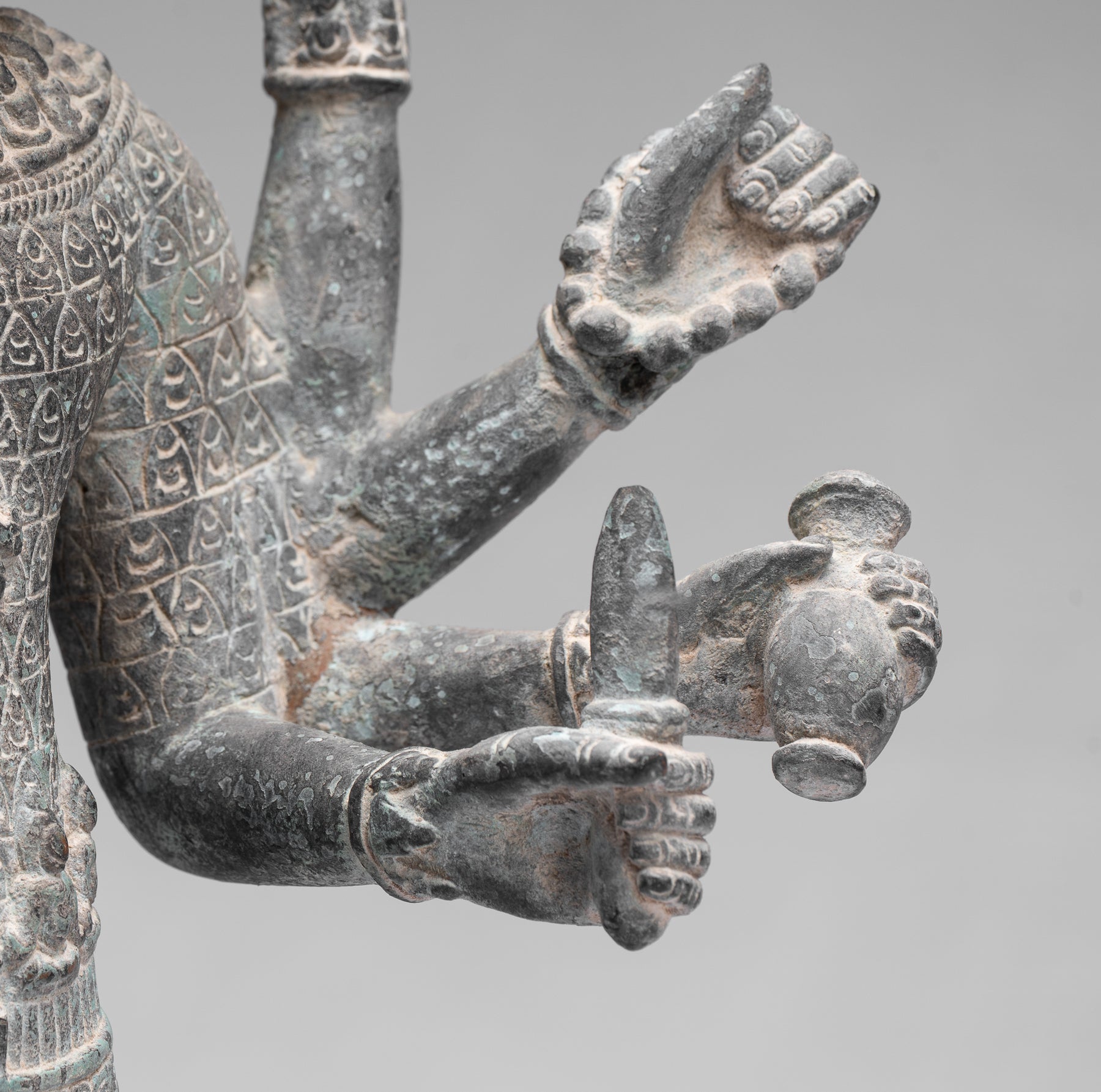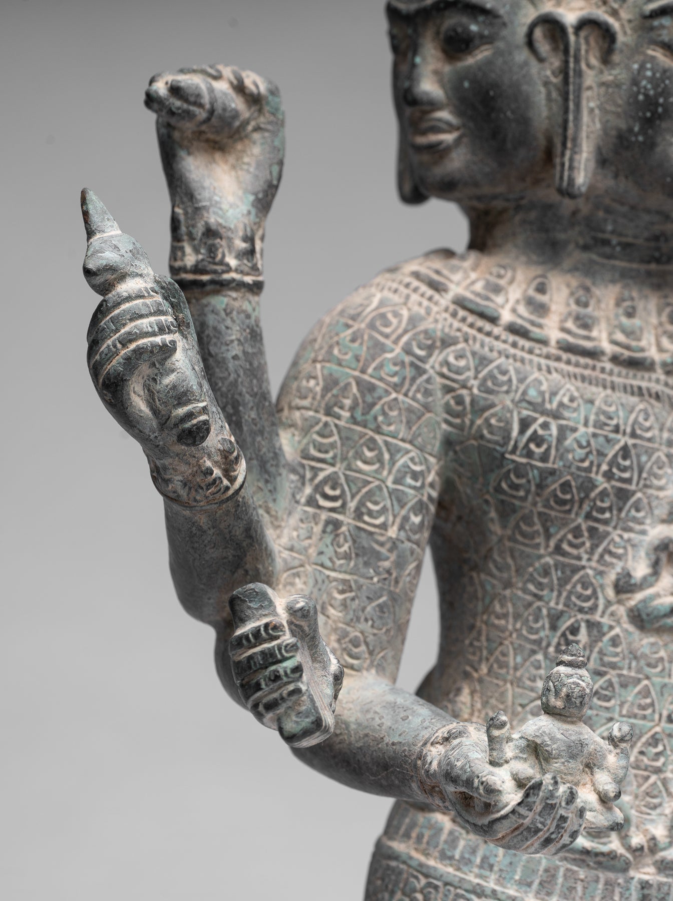 In his eight hands he holds an Axe, lotus bud, dagger, sutra (holy text), mala beads, mandala and Kalasha. His softly contoured face with indigenous characteristic has a serene downcast expression, with heavy-lidded eyes, arched eyebrows carved in relief meet in the middle above a well-shaped broad nose, and wide lips with an insipid smile are framed by a second incised line. and beauty lines upon his neck.