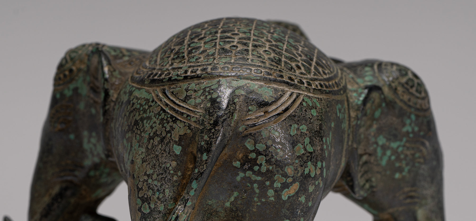 An antique Khmer style bronze Erawan or Airavata statue. Erawan is a mythological elephant who carries the Hindu god Indra.