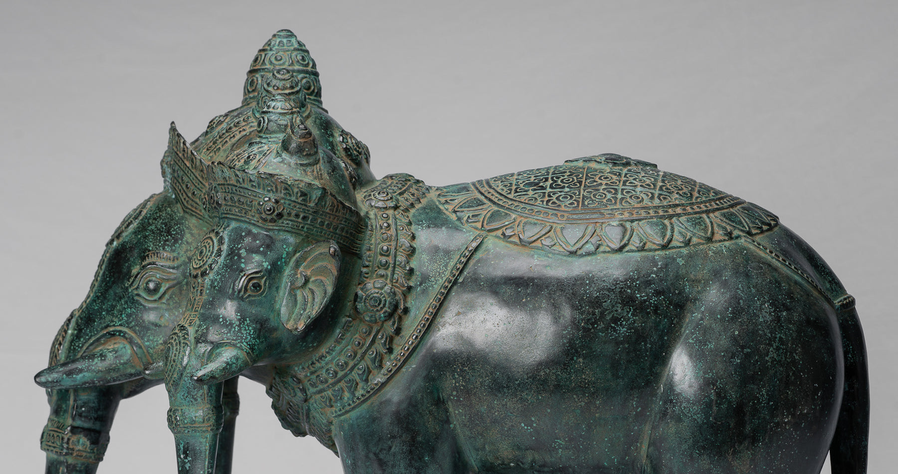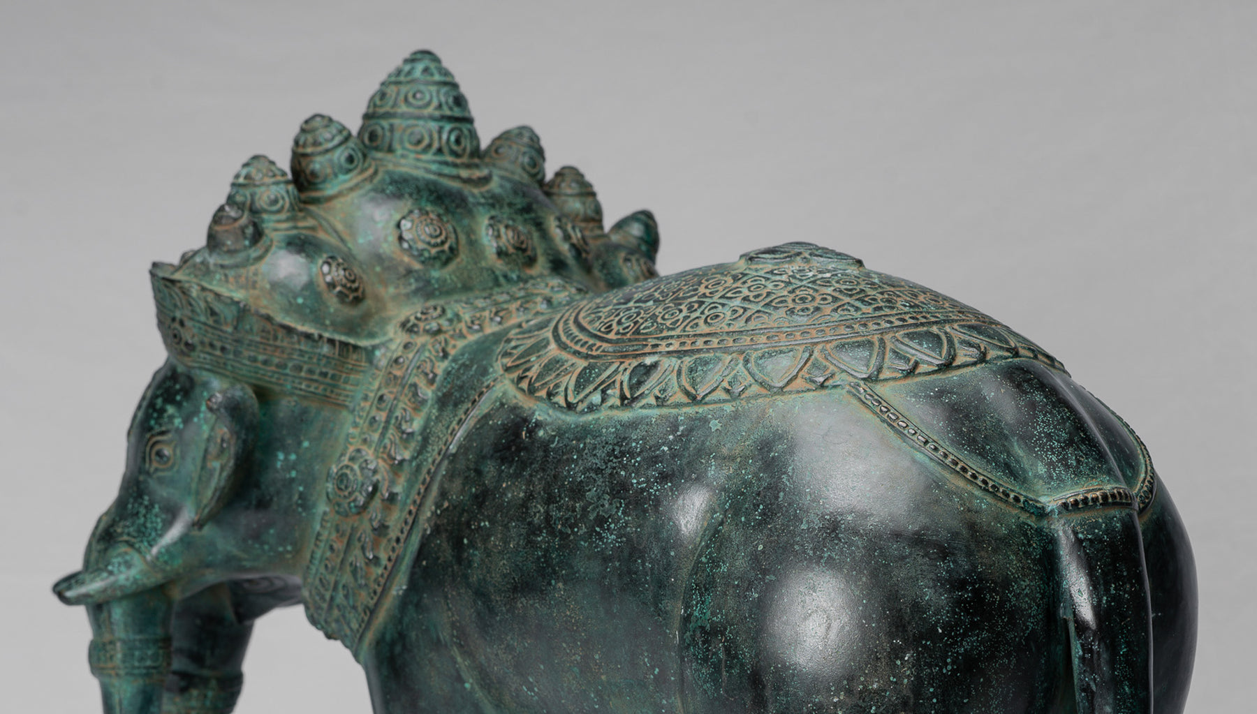 An antique Khmer style bronze Erawan or Airavata statue. Erawan is a mythological elephant who carries the Hindu god Indra.