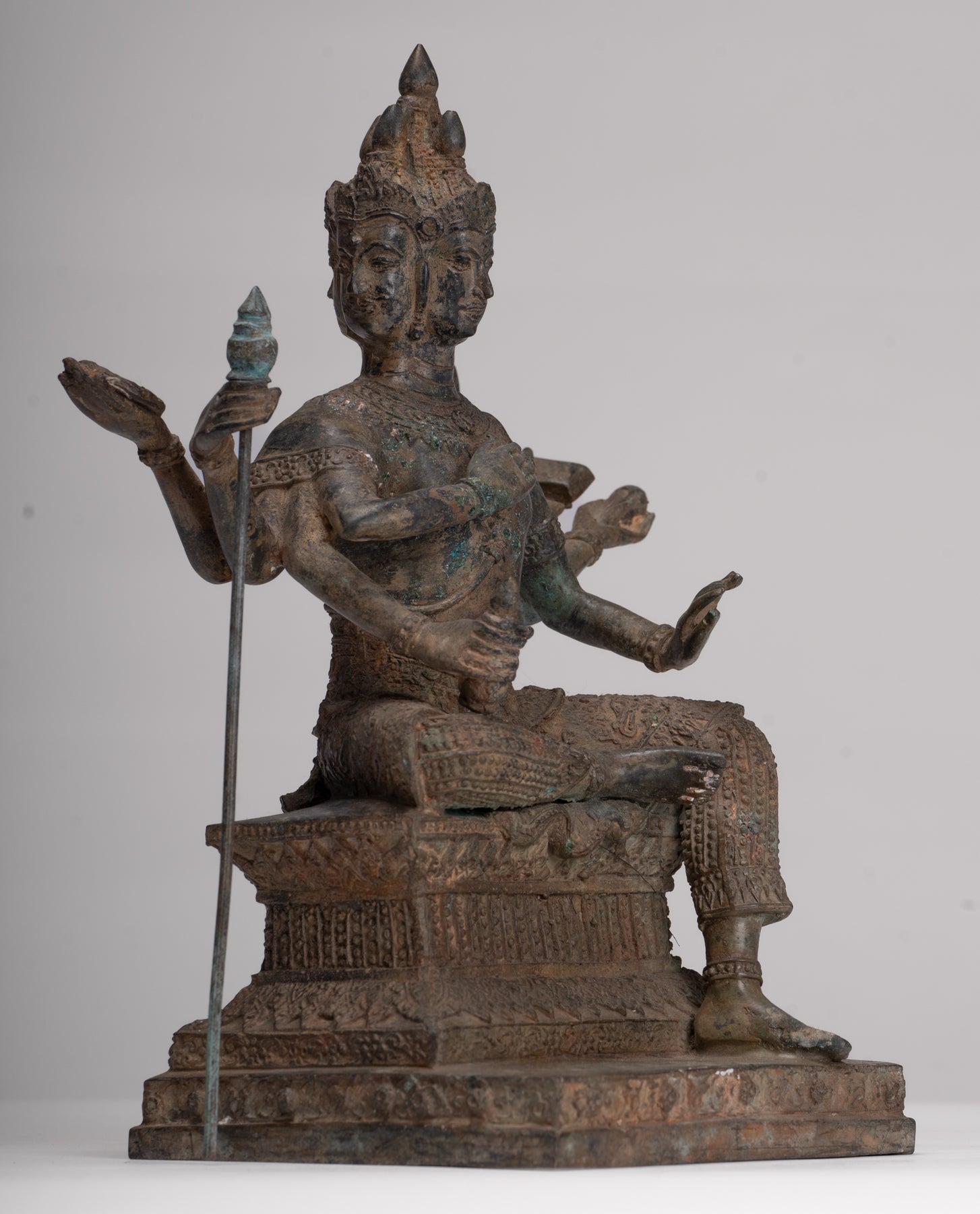 Antique Thai style seated Brahma. Brahma is the Hindu God of Creation and one of the Trimurti, the others being Vishnu and Shiva. He is sitting with eight arms holding a variety of objects, including his sceptre. Brahma's four faces look North, South, East and West.