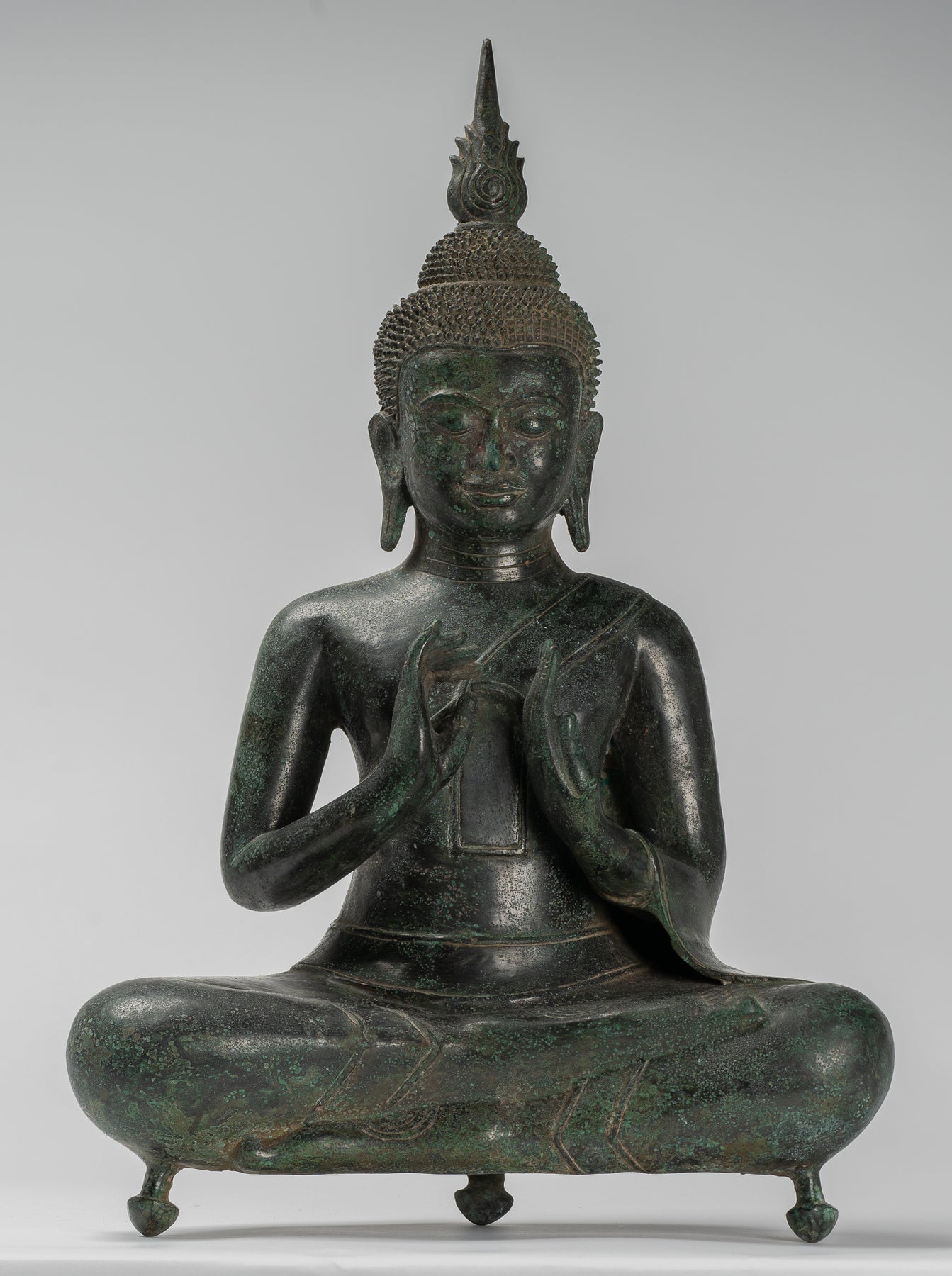 A serene antique Khmer style seated bronze Teaching Buddha statue. In typical, post-Angkor 13th century Bayon style the Buddha possesses a serenity, that confirms the divinity of Buddha, whilst lacking all ego.