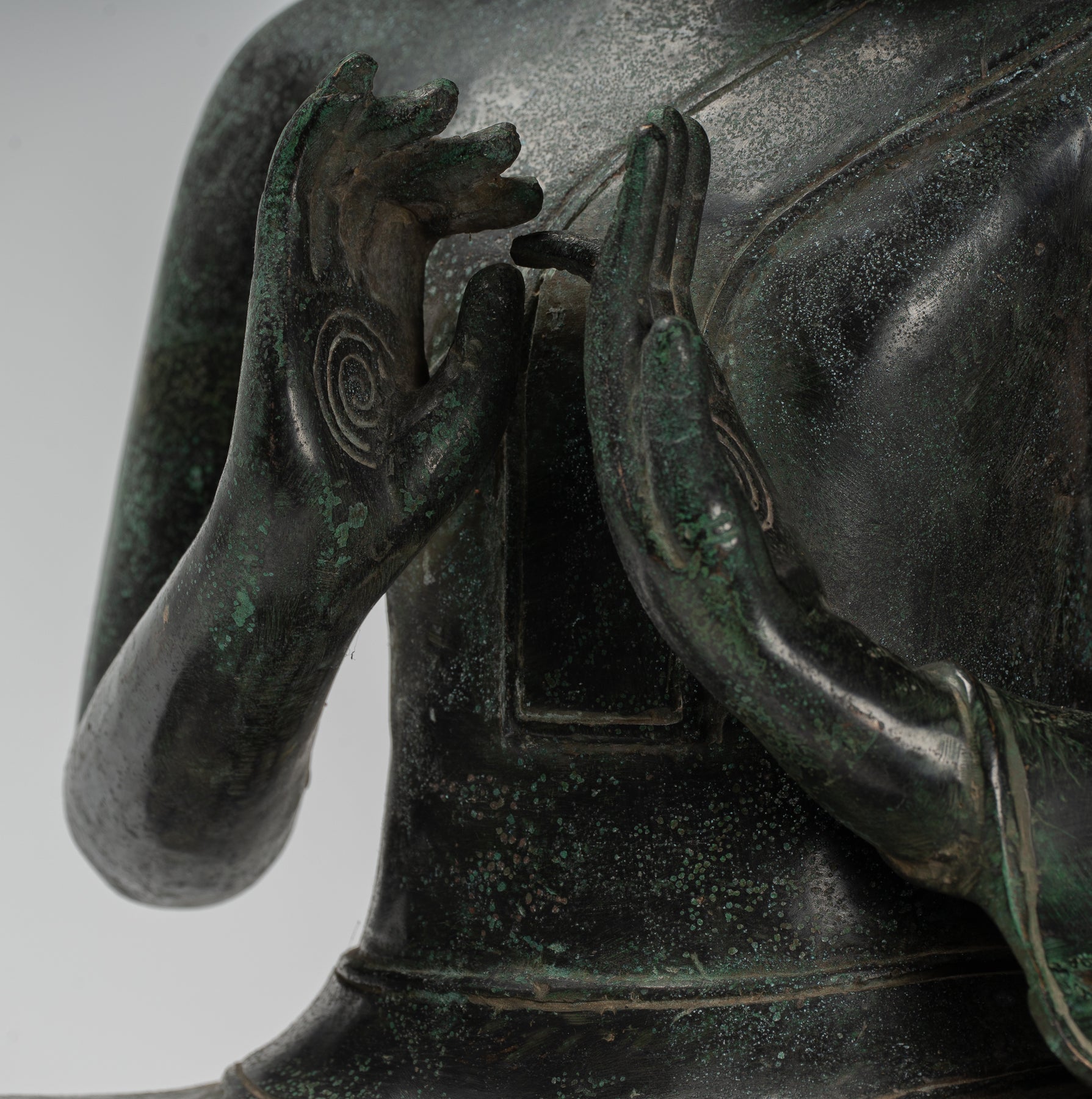 The Buddha is seated in the half lotus position with both hands raised in front of his chest in the dharmachakra mudra. In sanskrit dharmachakra means the 'Wheel of Dharma'. This mudra symbolises one of the most important moments in the life of Buddha, the occasion when he preached to his companions the first sermon after his Enlightenment in the Deer Park at Sarnath. It therefore denotes the setting into motion of the Wheel of the teaching of the Dharma. In this mudra the thumb and index finger touch at their tips to form a circle. This circle represents the Wheel of Dharma, or in metaphysical terms, the union of method and wisdom.