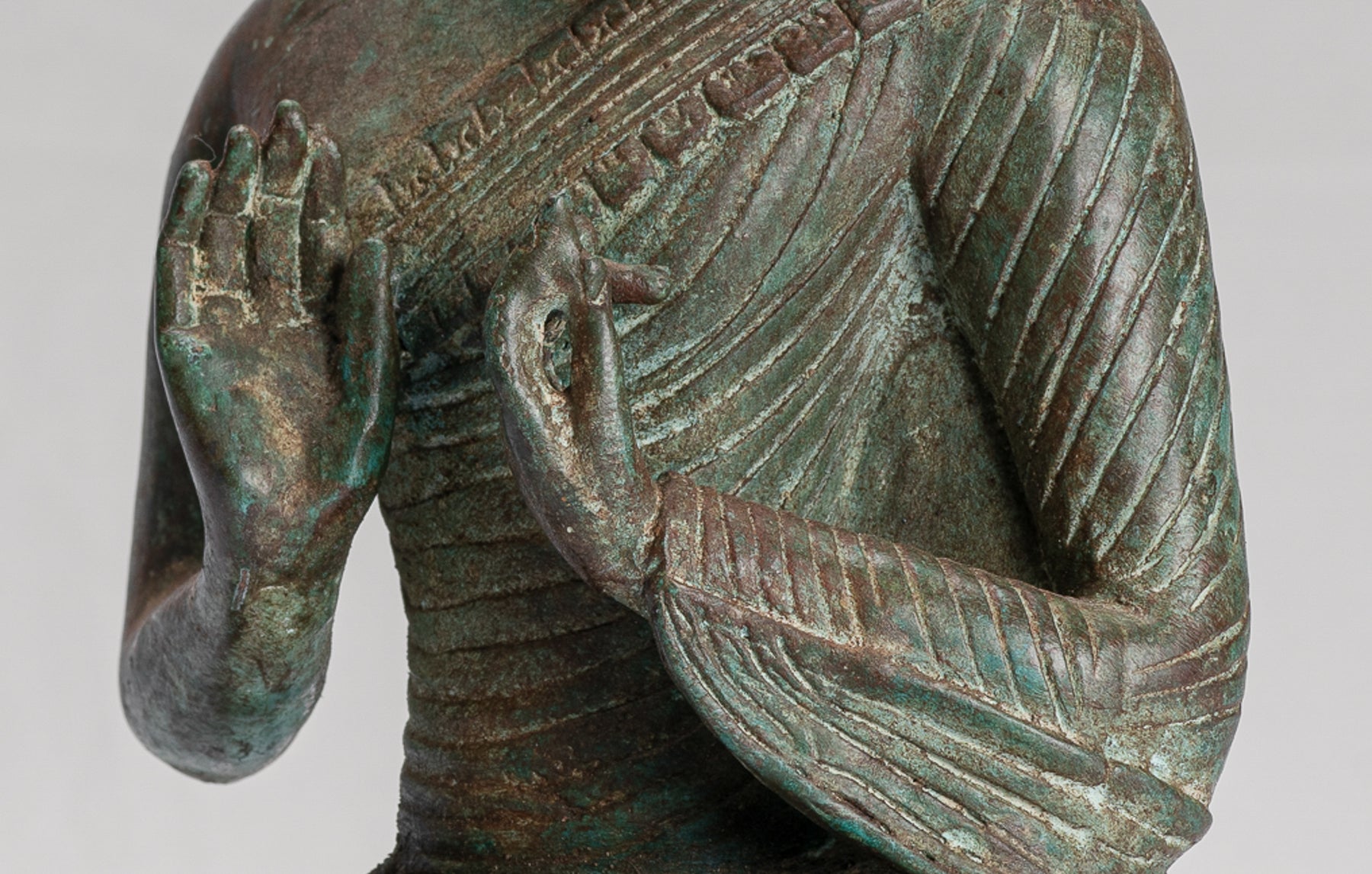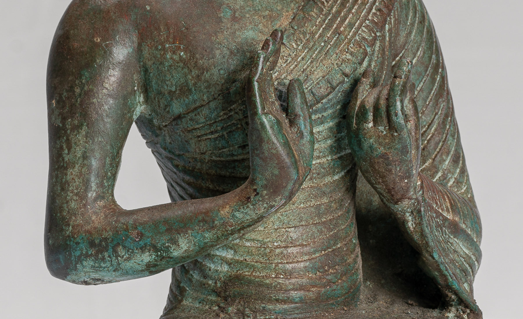 An antique Sri Lanka style seated Buddha in the double dharmachakra or teaching mudra. The Buddha has a peaceful countenance with downcast introspective eyes and a firm brow.