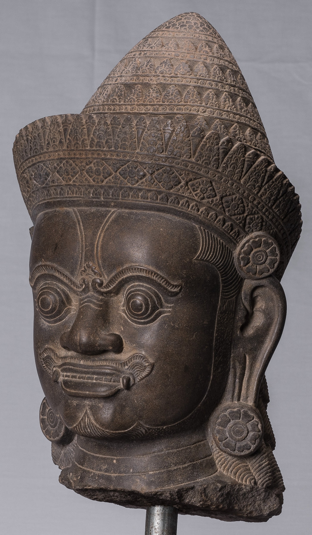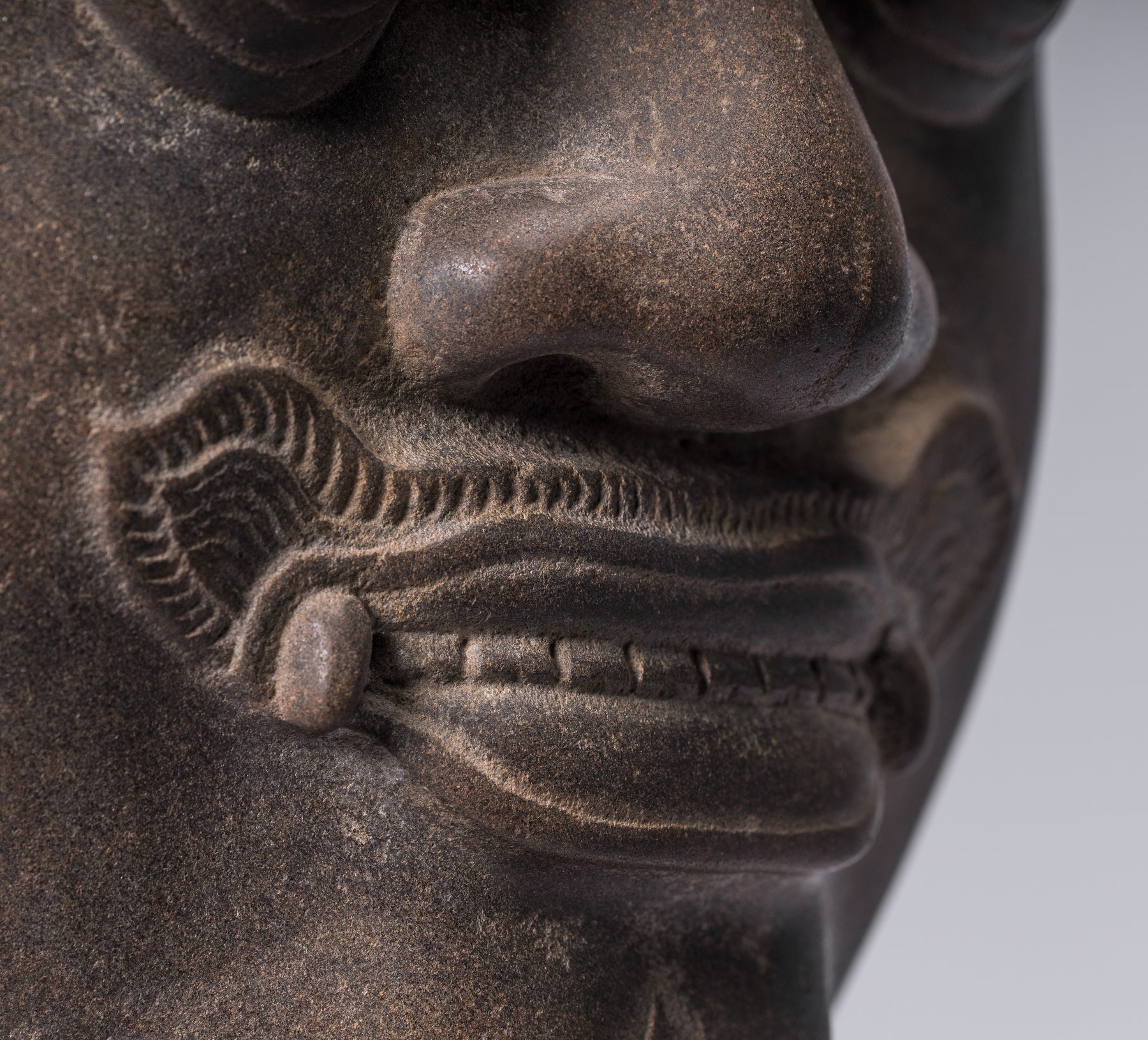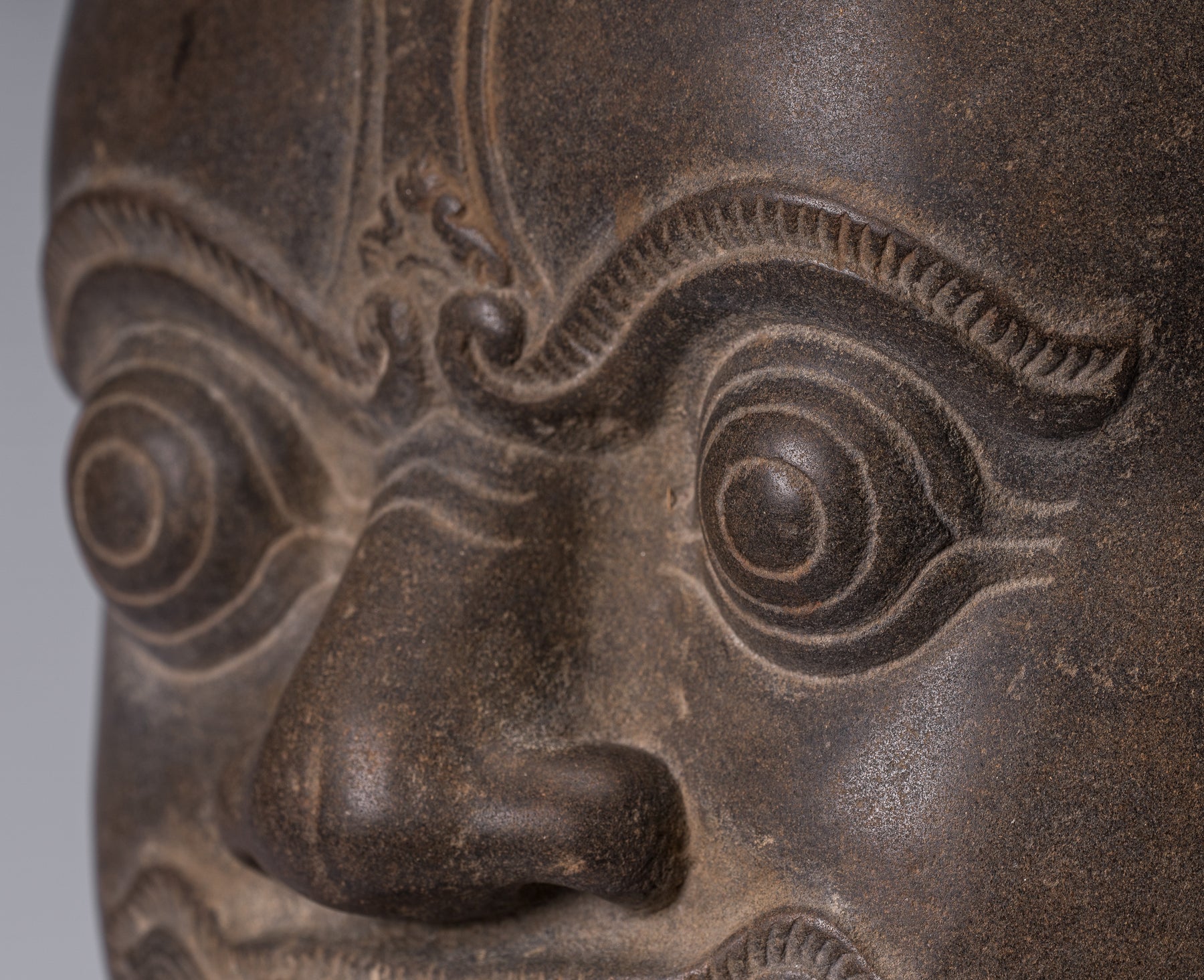 As is traditional, this image of Yaksha is defined by bulging eyes and fangs emanating from the mouth. The Yaksha has a curvy moustache, stippled beard and ear with scalloped inner rim. The hair is dressed in a tiered chignon in the Angkor Wat style. A diadem surrounds the chignon.