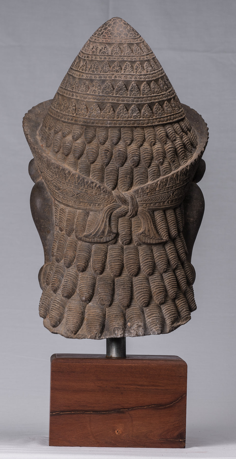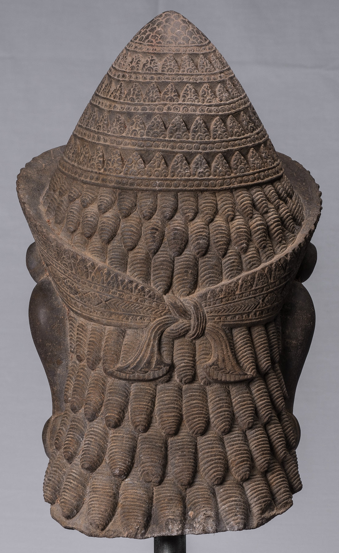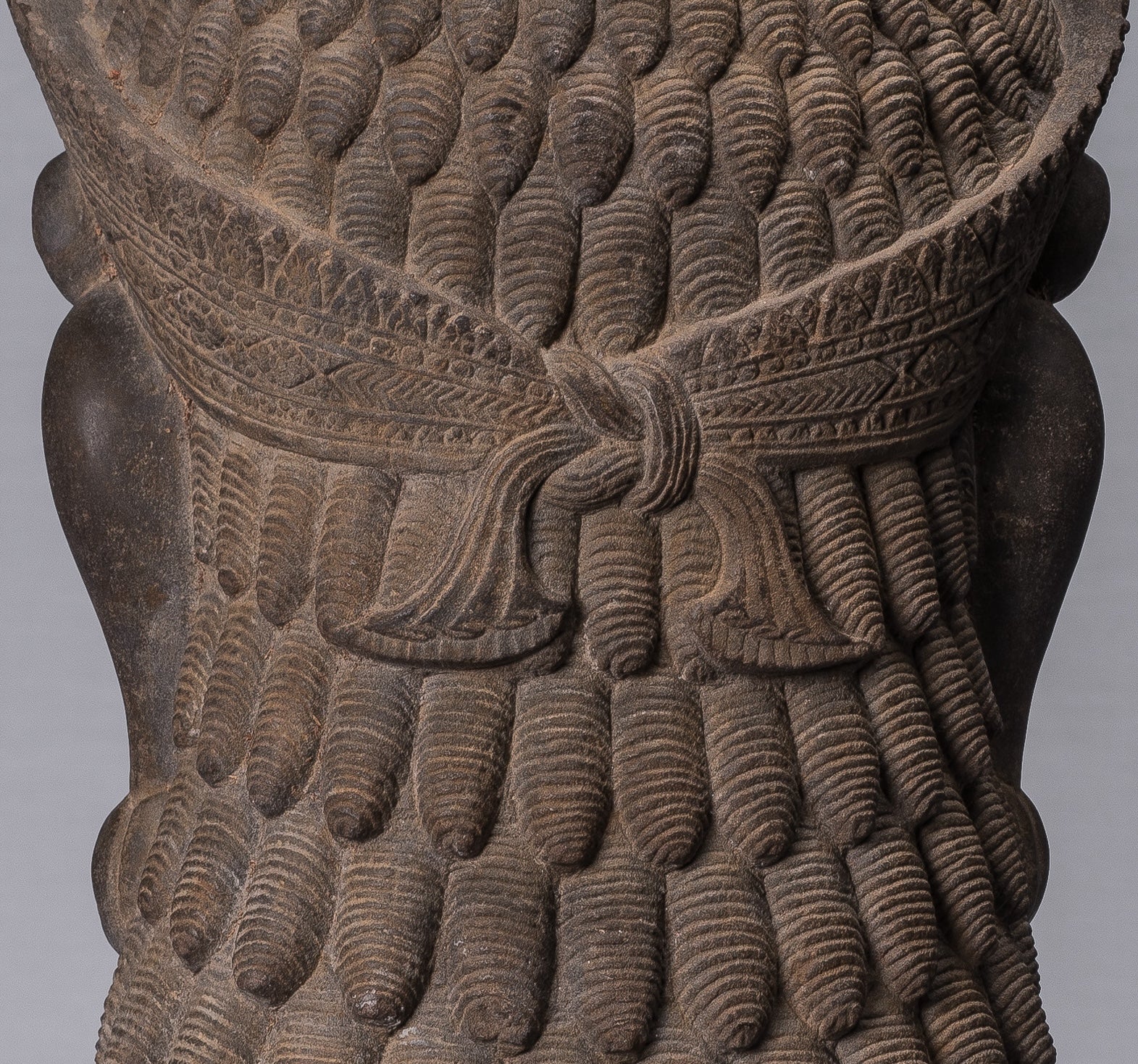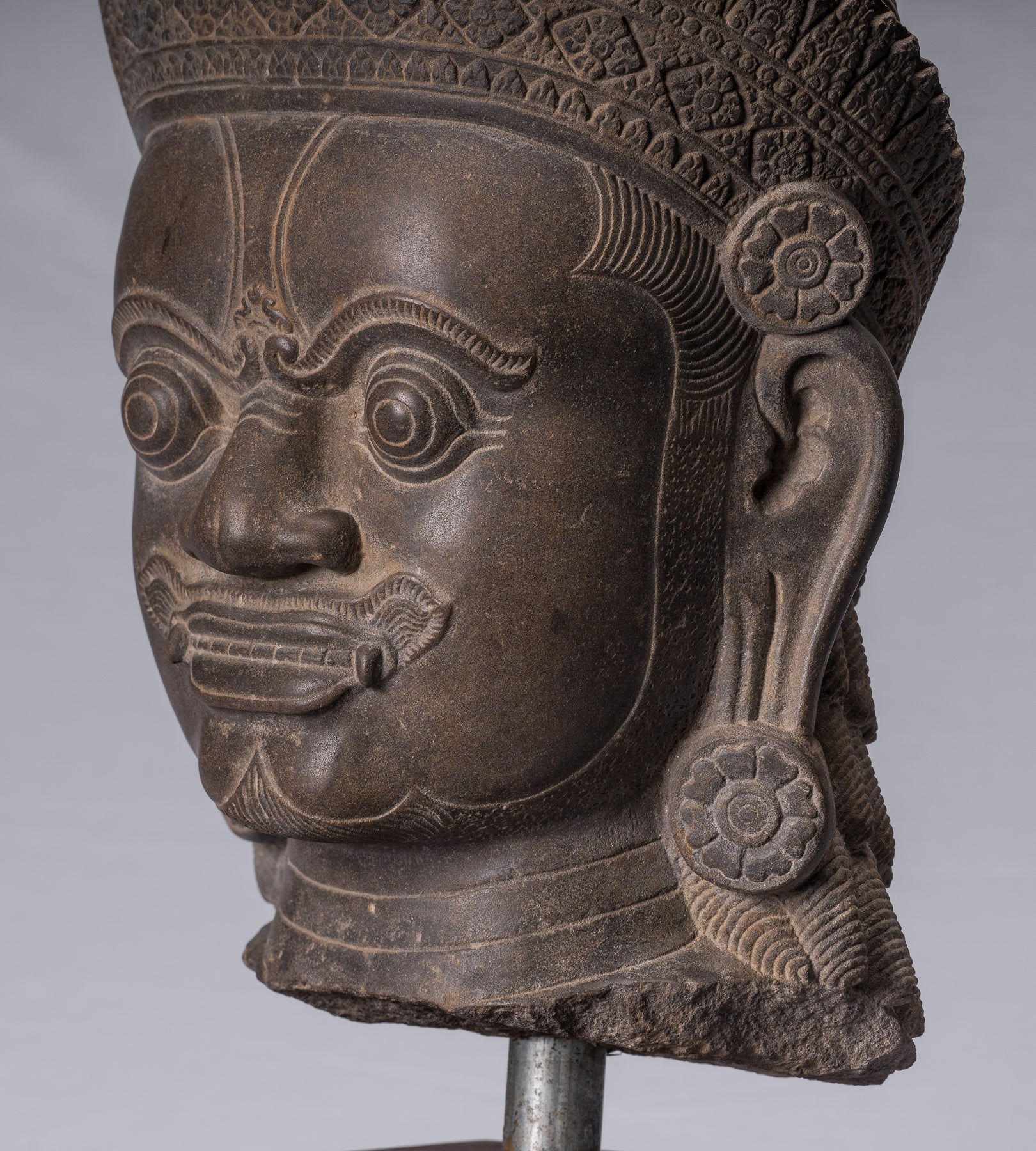 As is traditional, this image of Yaksha is defined by bulging eyes and fangs emanating from the mouth. The Yaksha has a curvy moustache, stippled beard and ear with scalloped inner rim. The hair is dressed in a tiered chignon in the Angkor Wat style. A diadem surrounds the chignon.