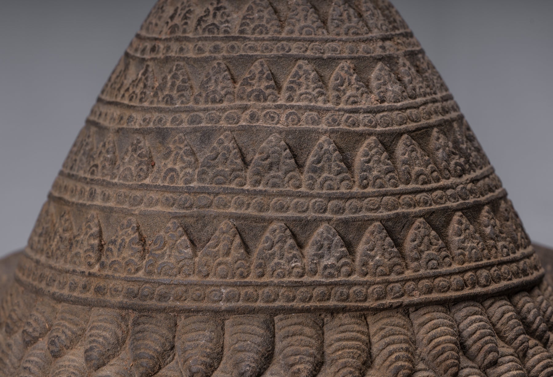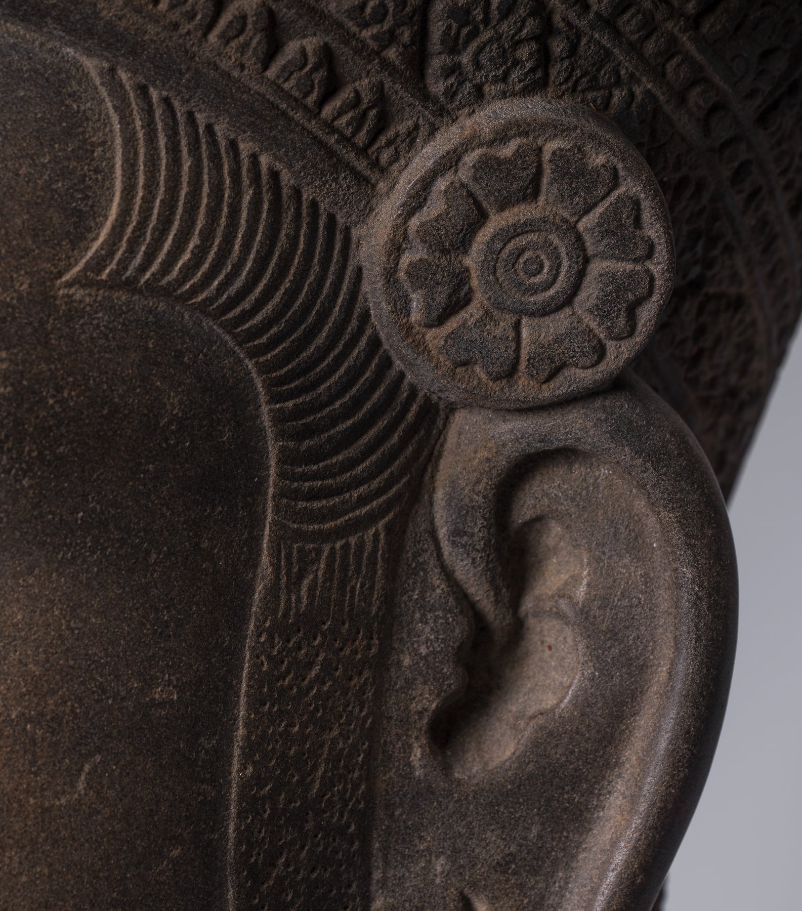 The anatomy shows a strong sense of observation. The overall silhouette is elegant and a reminder of the Pre Angkorian Art. The ornate carving of the diadem provide a delightful contrast with the smooth facial features.