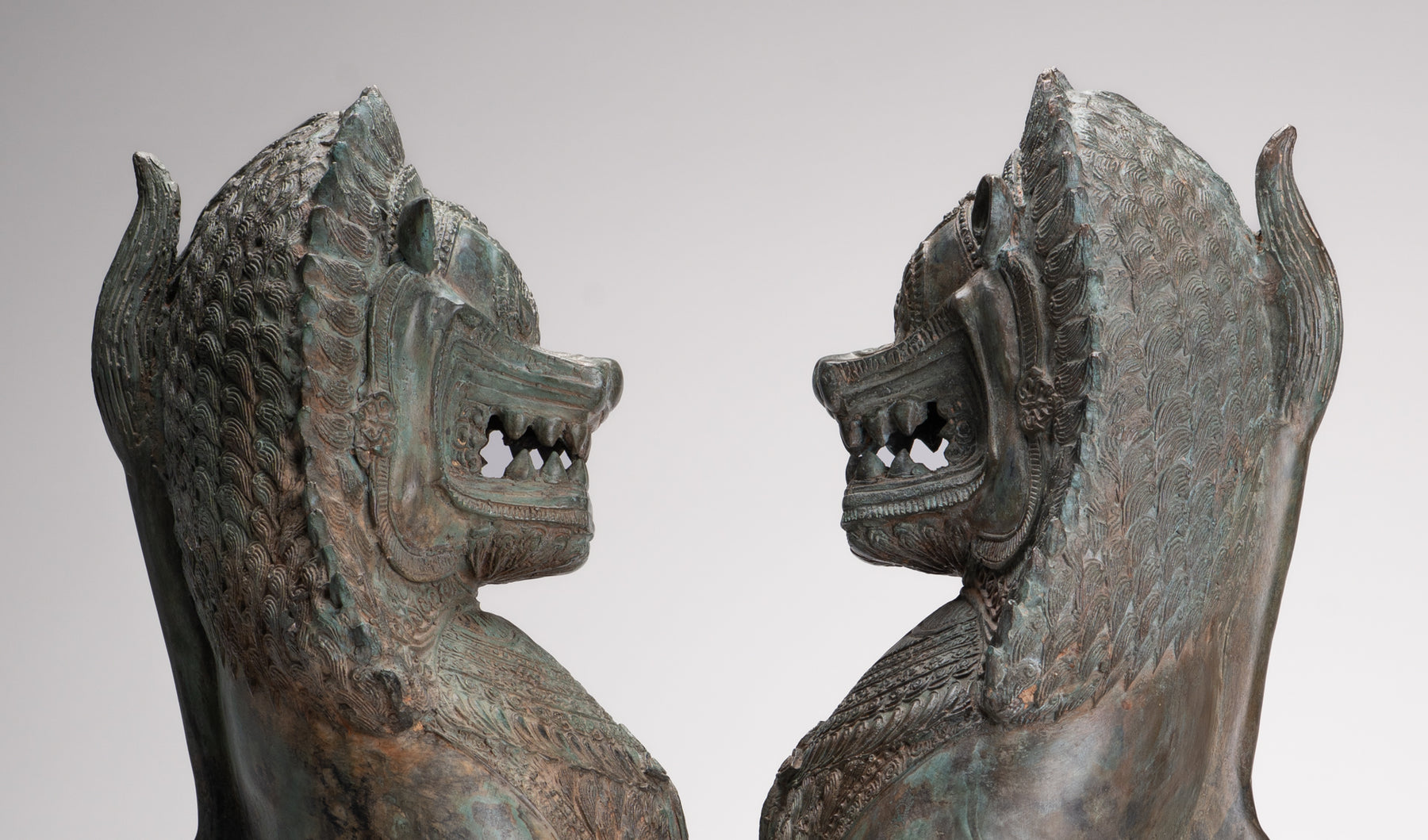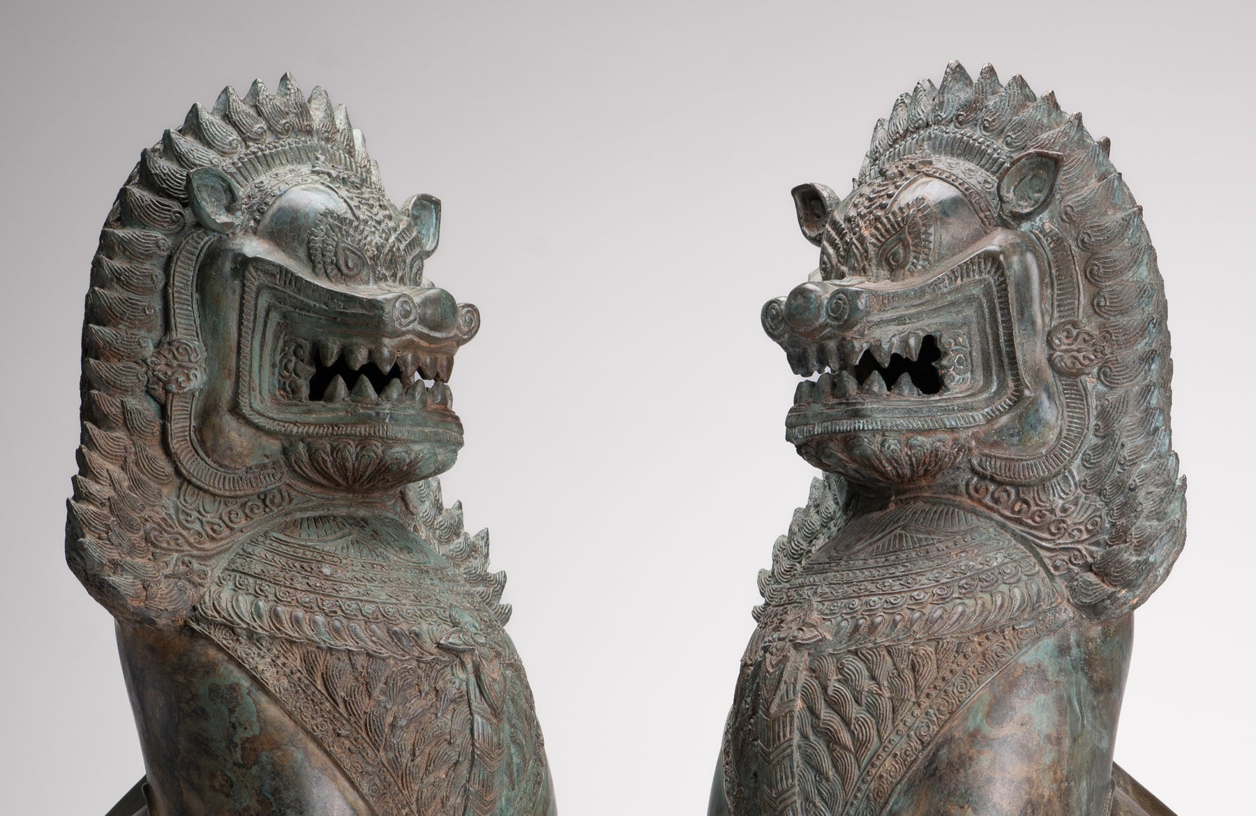 A imposing antique Thai style pair of Temple Guardian or Lion/Singha figures.