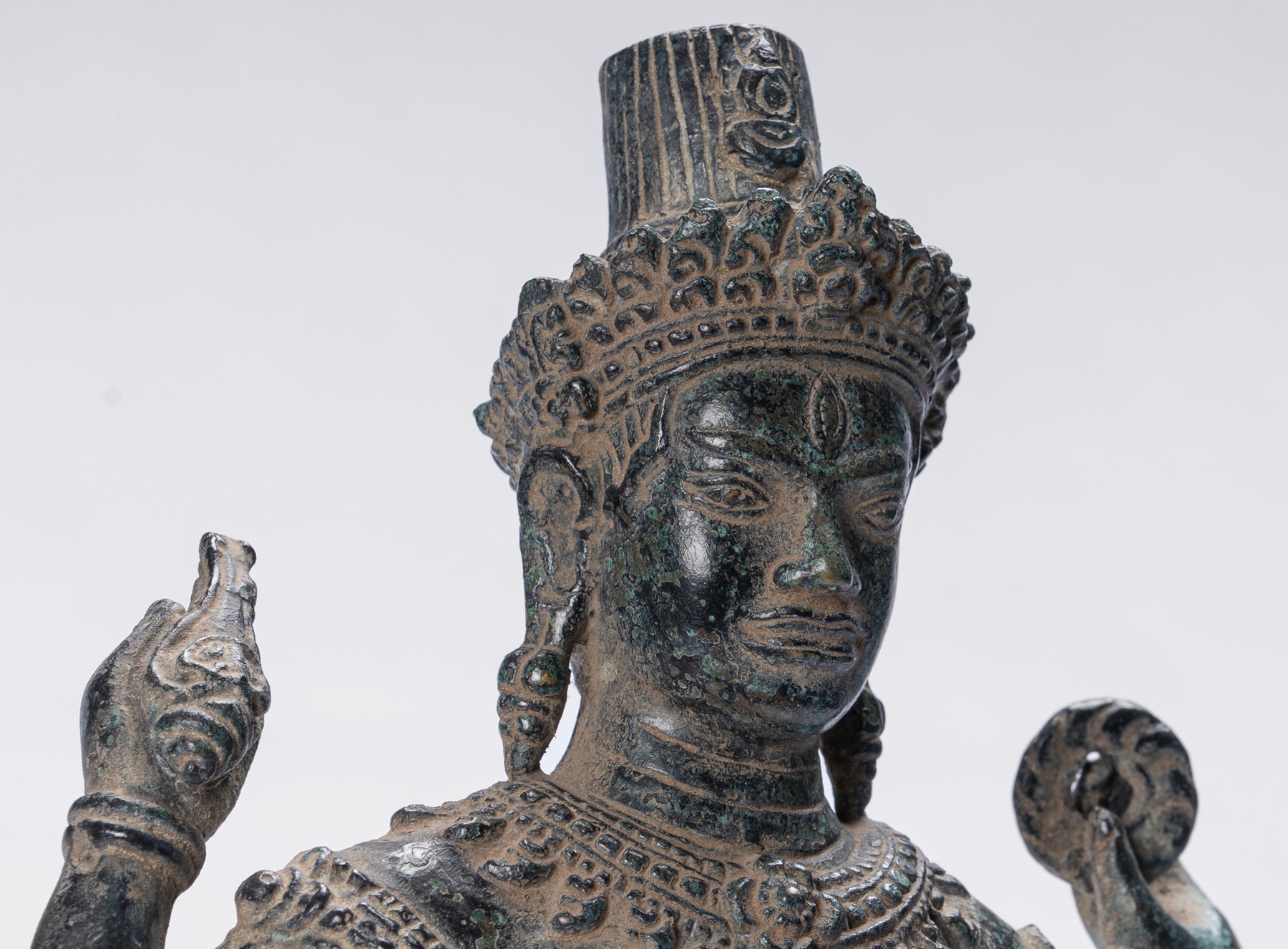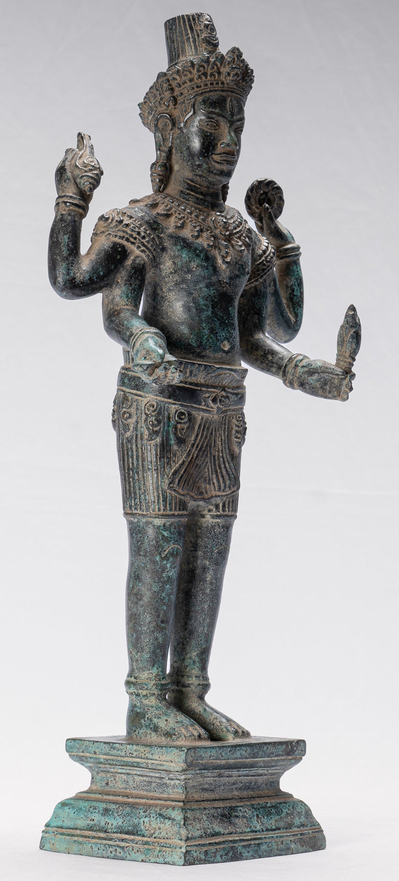 Standing in samapada with his arms radiating around him and clad in a short sampot with fishtail pleat and jewelled sash, the face with wide features surmounted by a cylindrical headdress. In his hands he holds a conch shell, mala beads, holy writings and lotus bud.