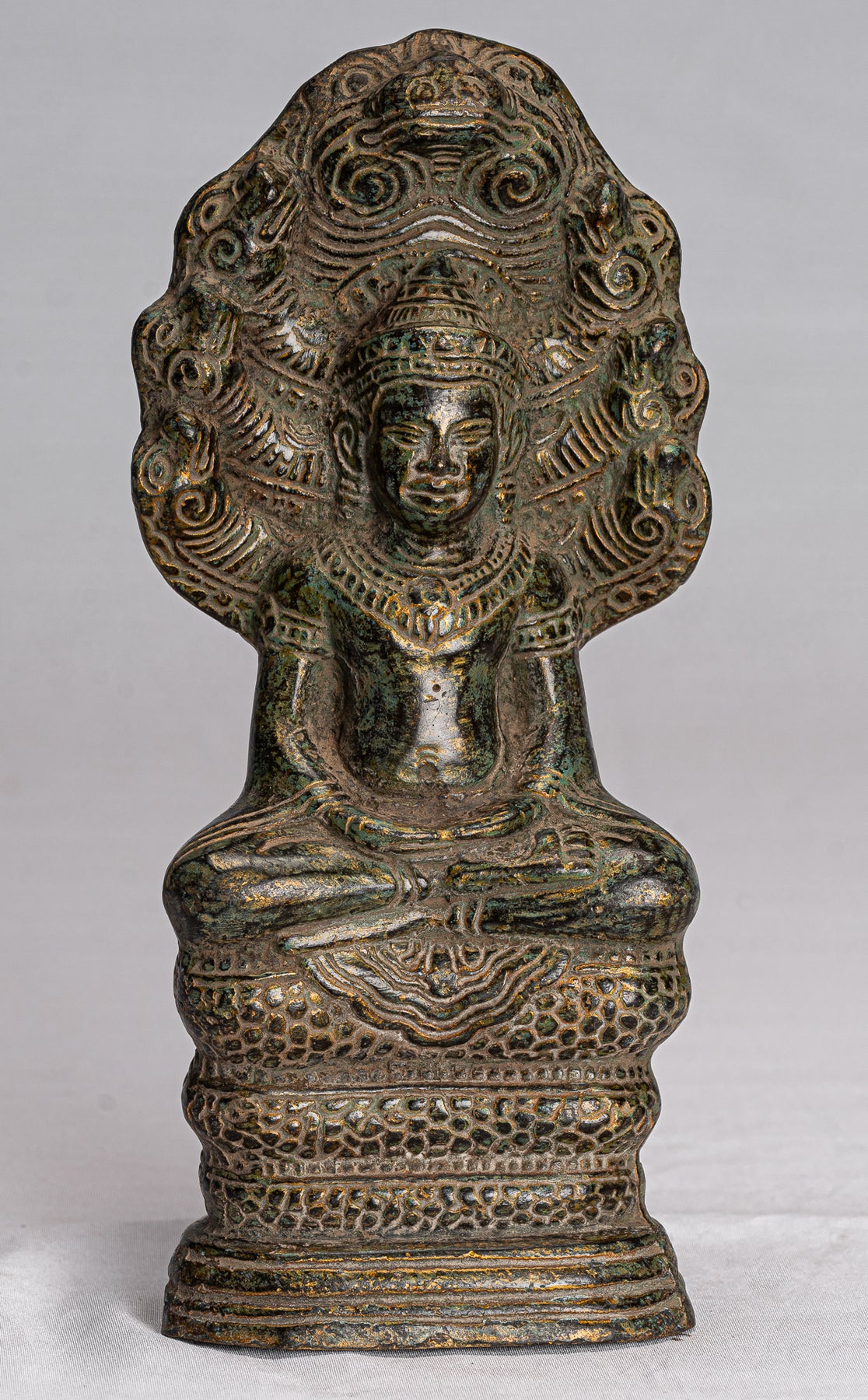 An antique Bayon style bronze meditation Buddha, seated on a three-tired throne, with the flaring head of a giant Naga, the serpent King Muchalinda, rising behind protectively behind. His hands are in the Dhyana mudra, the gesture of Meditation.
