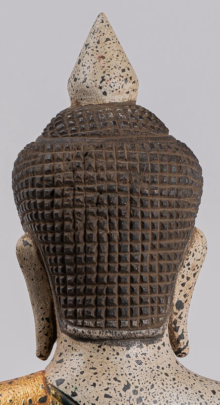 The shell like curls of the hair form are surmounted by a lotus flower ushnisha, symbolising his high level of spiritual development. His earlobes are stretched long from a youth spent as a prince wearing heavy gold earrings.