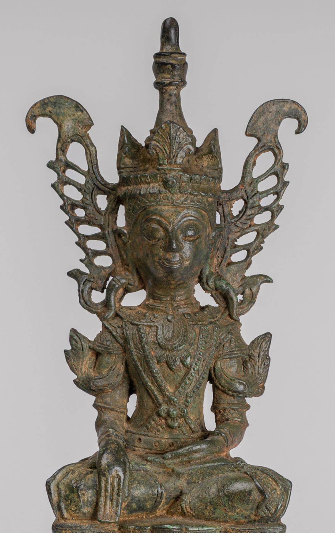 An antique Shan style Buddha statue from Burma, this regal image is modelled after a 17th–18th century Burmese Jambupati Buddha of the Shan type. The Buddha is portrayed in full royal attire, adorned with rich jewellery worn over a monk’s robe, whose border falls gracefully over the left arm.