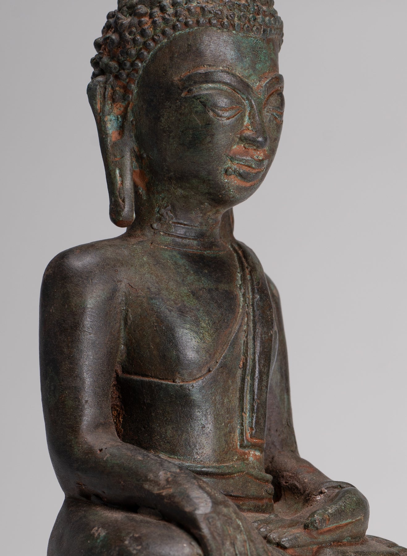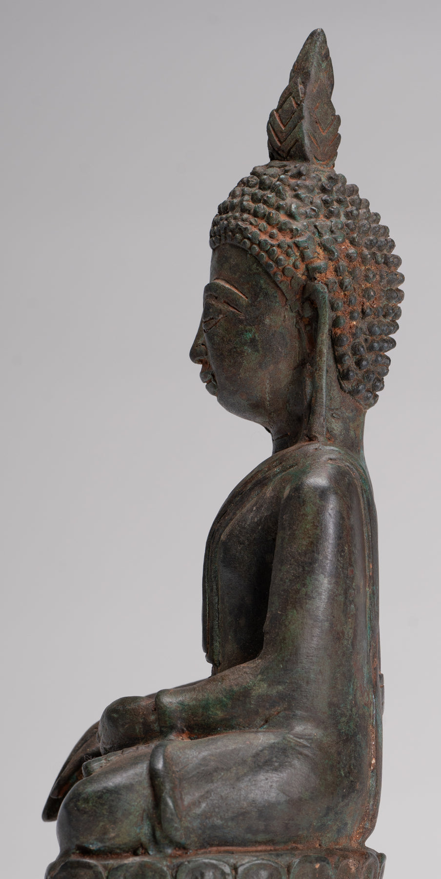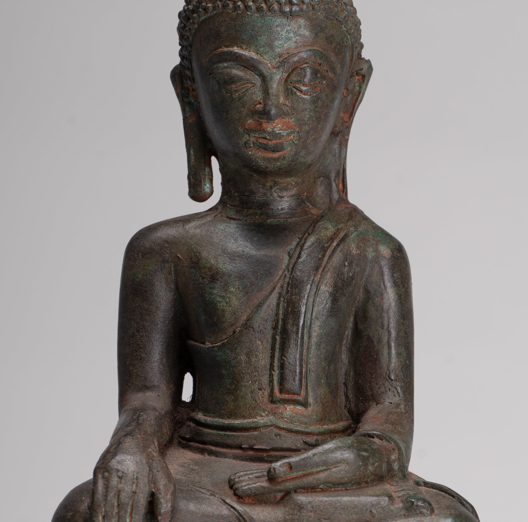 The Buddha's hands are in the Bhumisparsa or enlightenment mudra. The Buddha's face is serene, with a naturalistic and warm expression; his head is topped by a lotus bud ushnisha, in the Laos style.