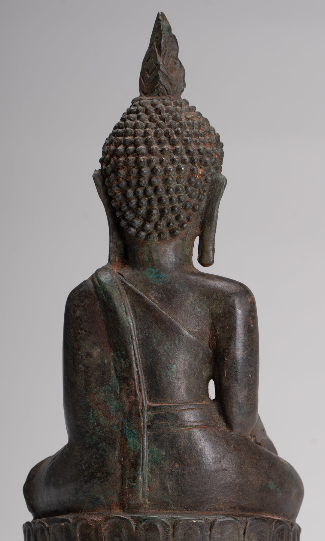 The Buddha is seated on a pedestal in the Bhumisparsa or 'Calling the Earth to Witness' mudra. With fingers slightly touching the ground this position represents the subduing of Mara (a demon) who bombarded Buddha with demons, monsters, violent storms and the three seductive daughters. Remaining steadfast the Buddha testified to his meritorious past by pointing to the earth and calling the Earth Goddess, Thorani.