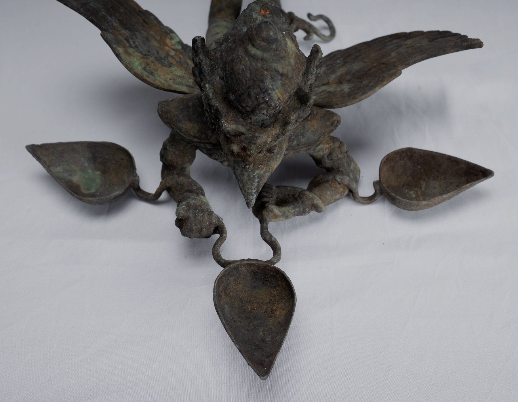 Here Garuda can be hung from a chain where he holds 3 oil pots.