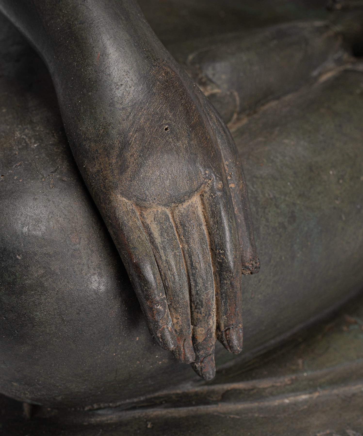 An imposing antique Thai style seated bronze Buddha Shakyamuni in Chiang Saen style.