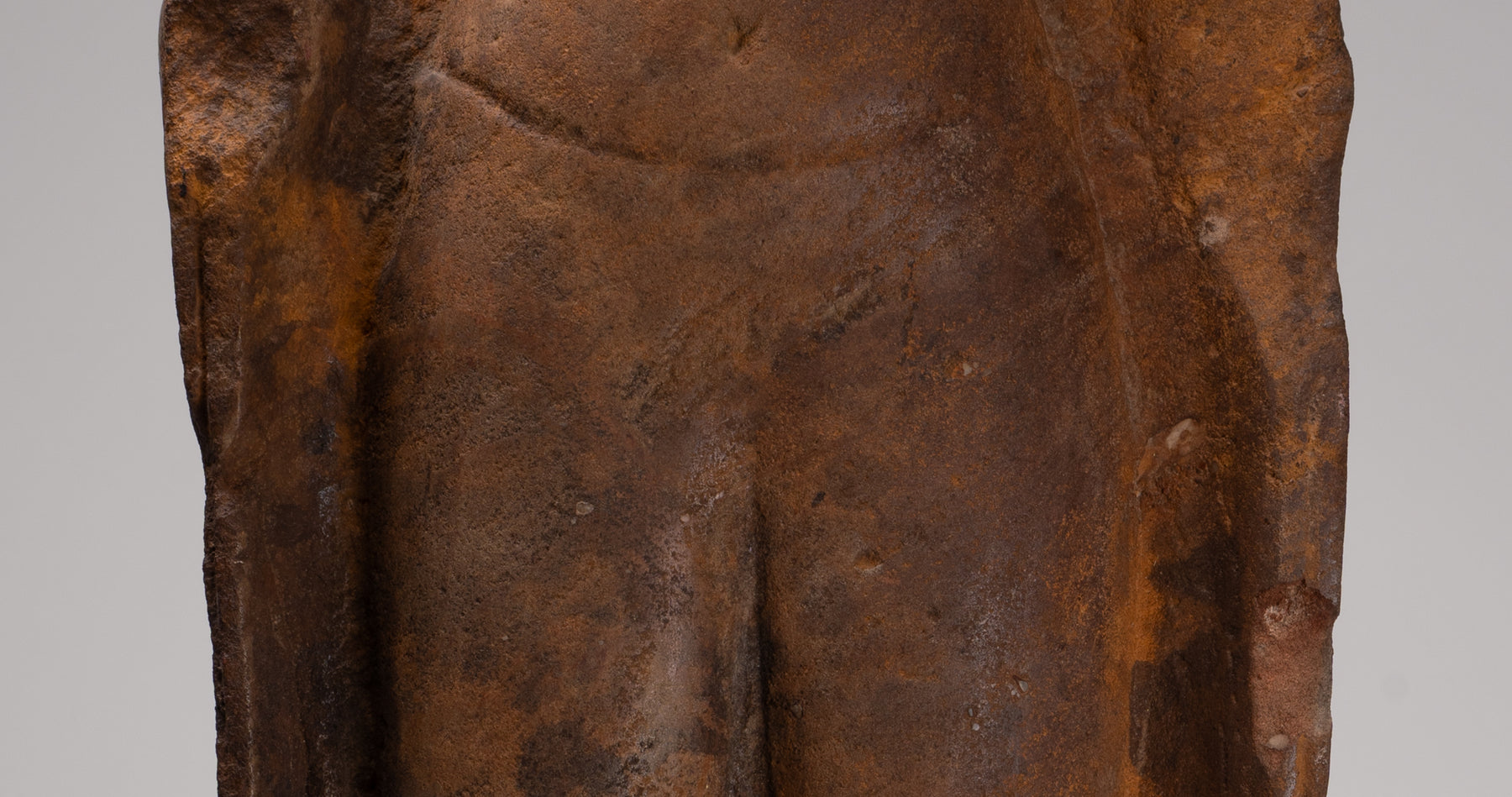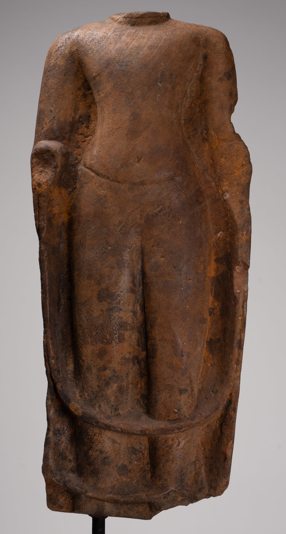 A sandstone standing Buddha (probably) masterpiece in early 8th century Dvaravati style.