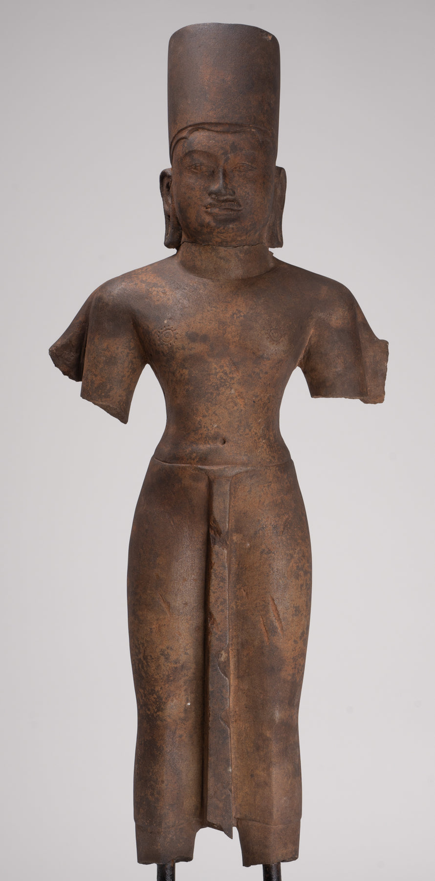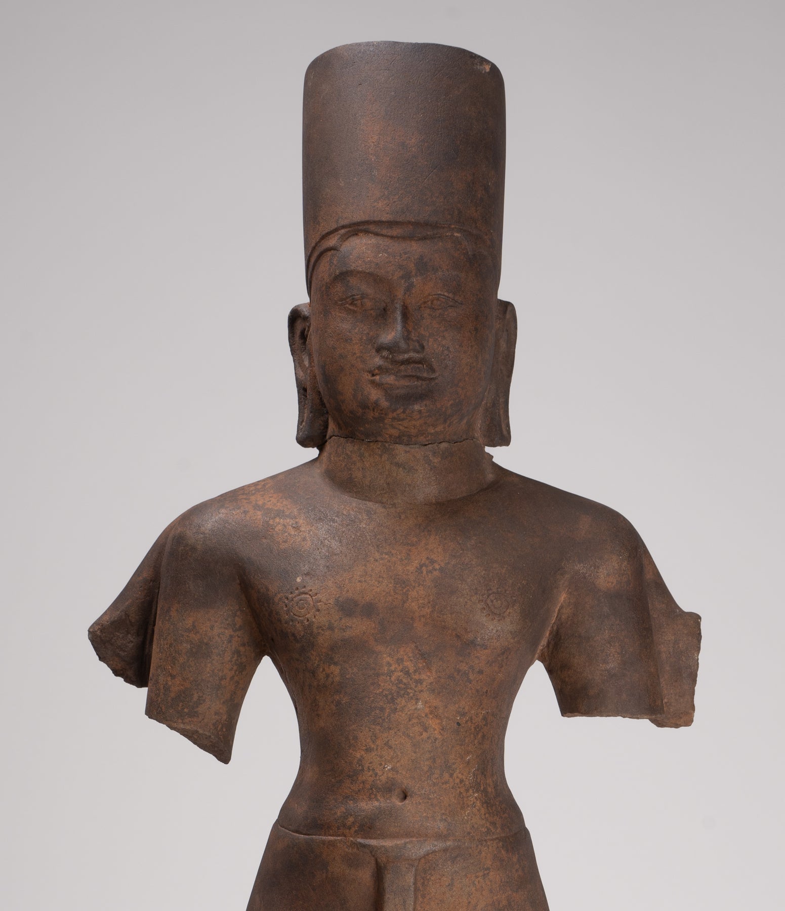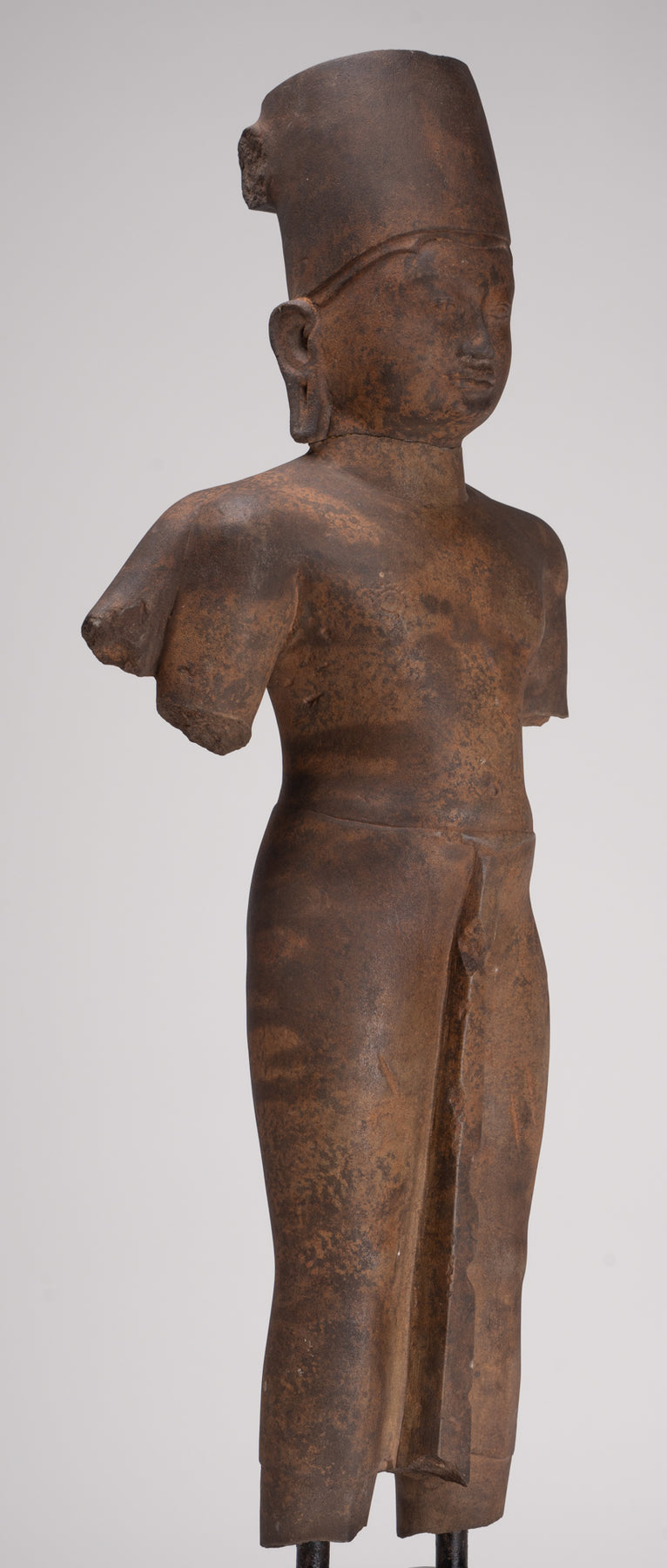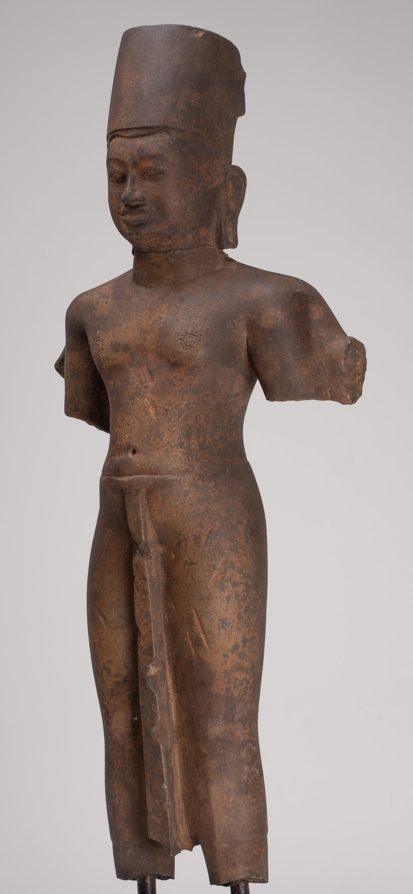 Vishnu is shown with remnants of his four arms, that would have held his special attributes.Lush lips, almond shaped eyes and an aquiline nose define his face. Distended earlobes may once have been adorned with real earrings.The Vishnu torso has a slender waist, broad hips and shoulders, not as muscular as earlier sixth century Khmer Vishnu images, but more refined and graceful.