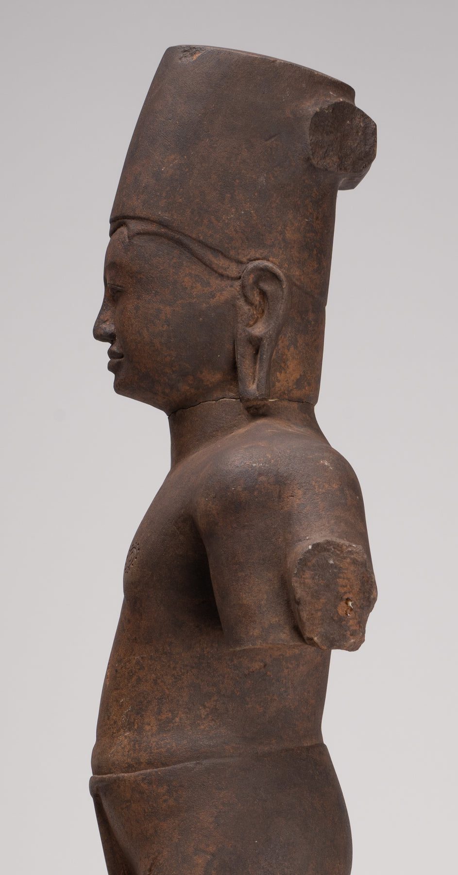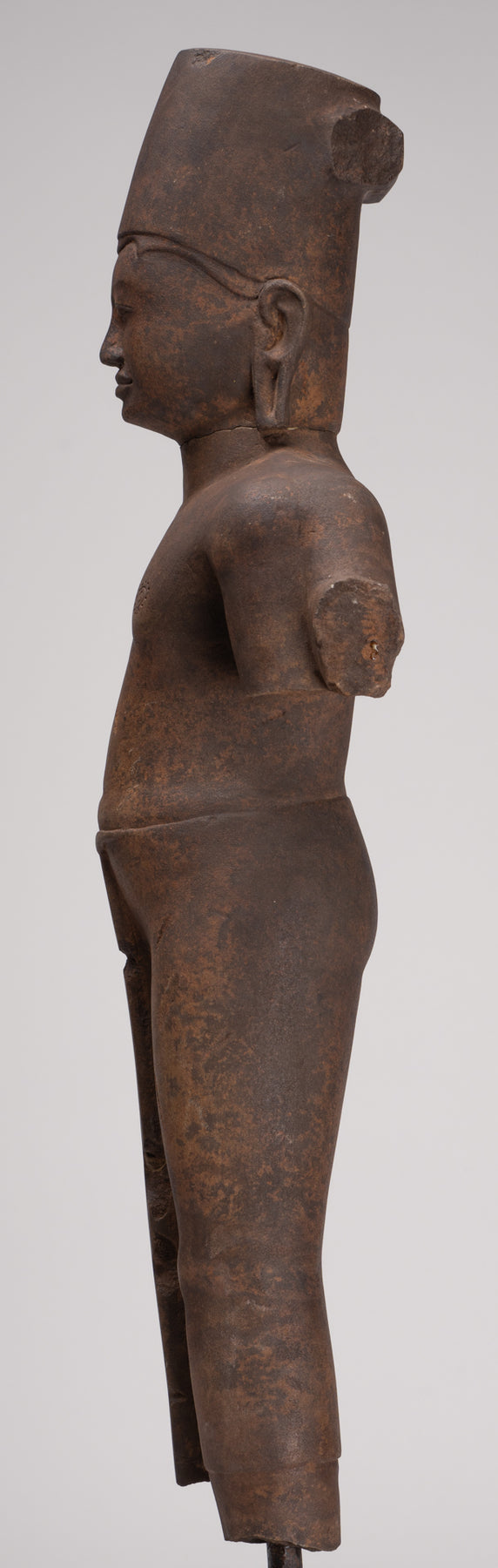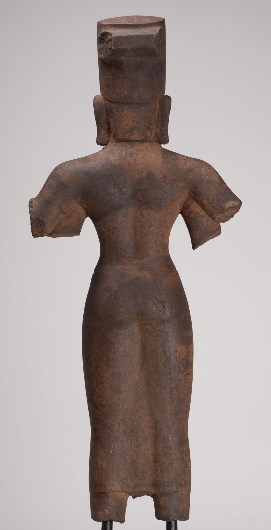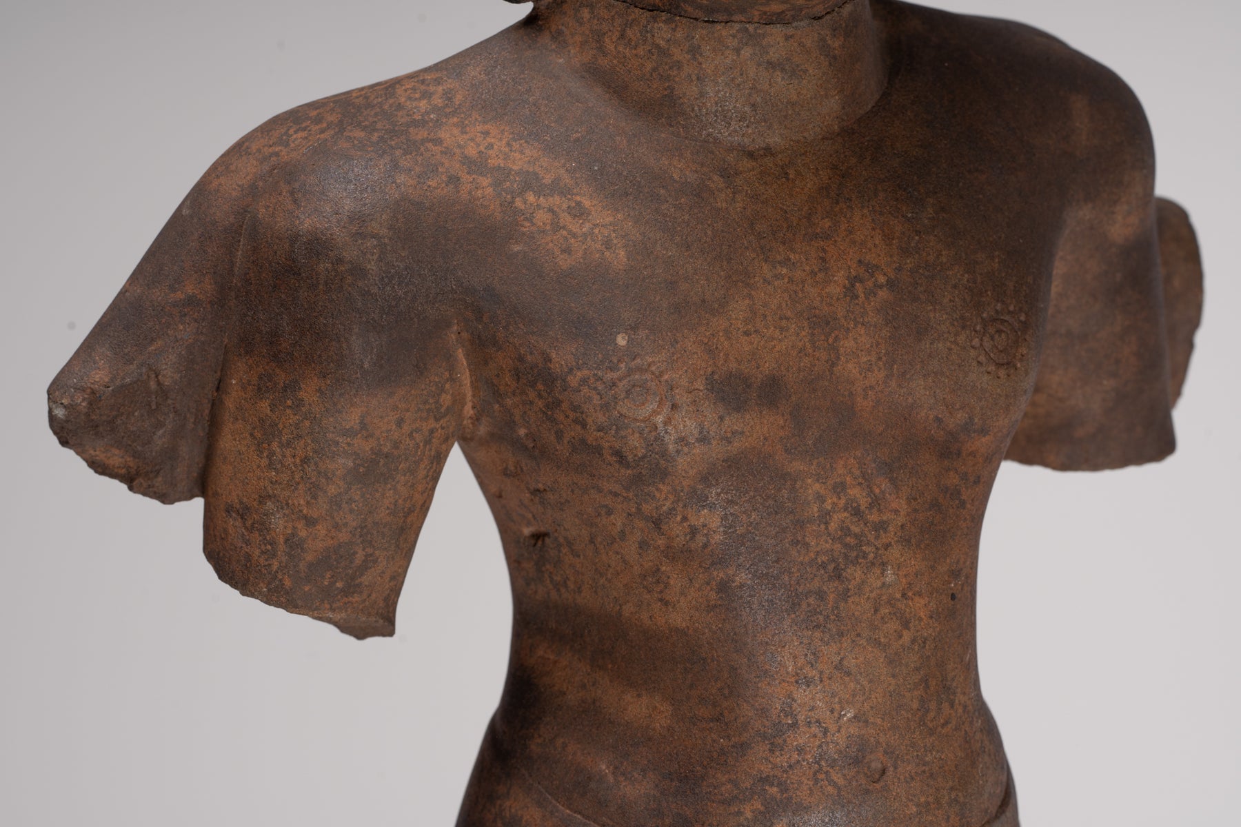 Vishnu is shown with remnants of his four arms, that would have held his special attributes.Lush lips, almond shaped eyes and an aquiline nose define his face. Distended earlobes may once have been adorned with real earrings.The Vishnu torso has a slender waist, broad hips and shoulders, not as muscular as earlier sixth century Khmer Vishnu images, but more refined and graceful.