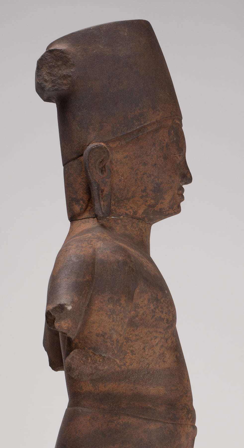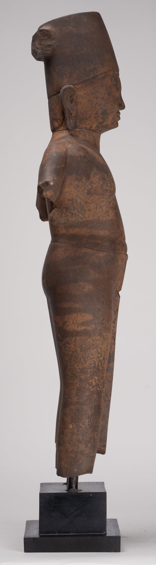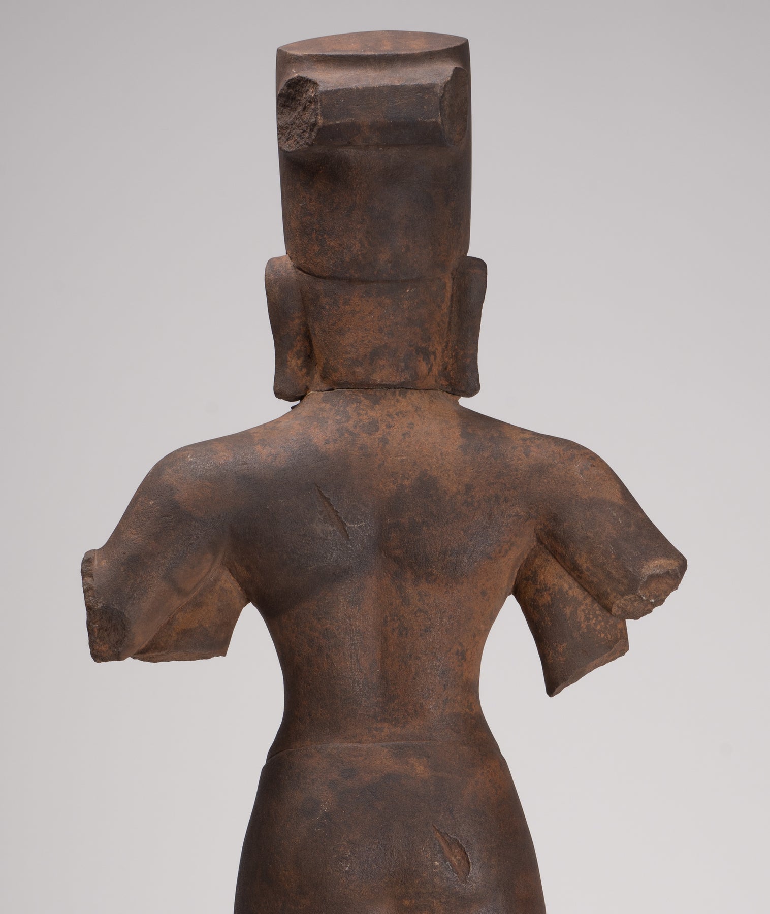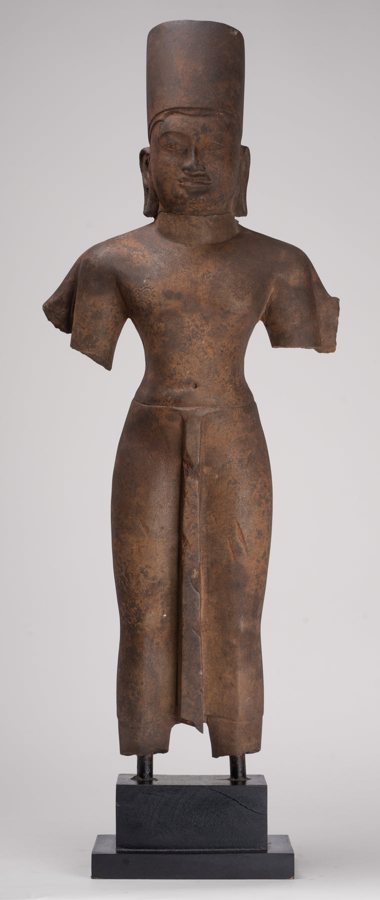 An antique early 7th century Phnom Da style, brown sandstone, Vishnu sculpture, the Hindu deity of creation. The divine Hindu preserver and protector of human life, a role that provided natural analogies with earthly kingship for the Khmer.This muscular image of Vishnu is depicted standing samabhanga, straight-legged, on a rectangular base. The image is carved in the round with the back as carefully carved as the front. The image wears a high miter and a long clinging sampot knotted at the waist that reveals his powerful, muscular body above.