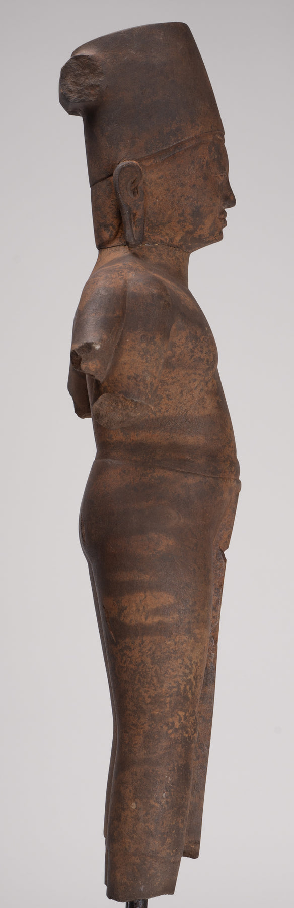 This is a particular temporal feature shared by late-seventh-century images in the National Museum in Phnom Penh that wear the earlier long sampot and also do not have hair projecting from under the miter, for example the Vishnu from Ba Sre, Angkor Borei, Takeo.The Vishnu torso is mounted on a wood base (later).Scholarly Reference: