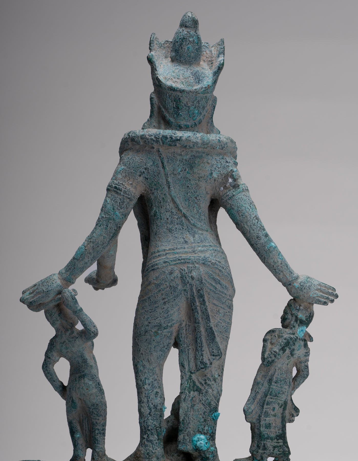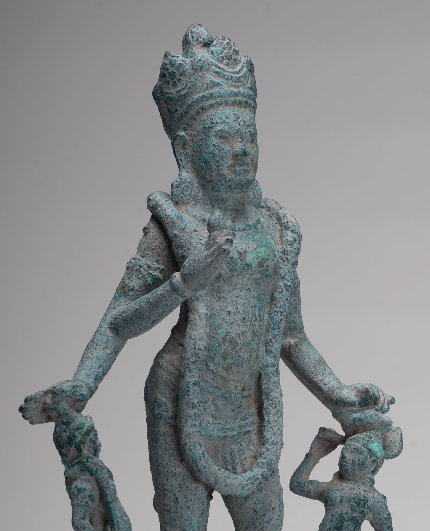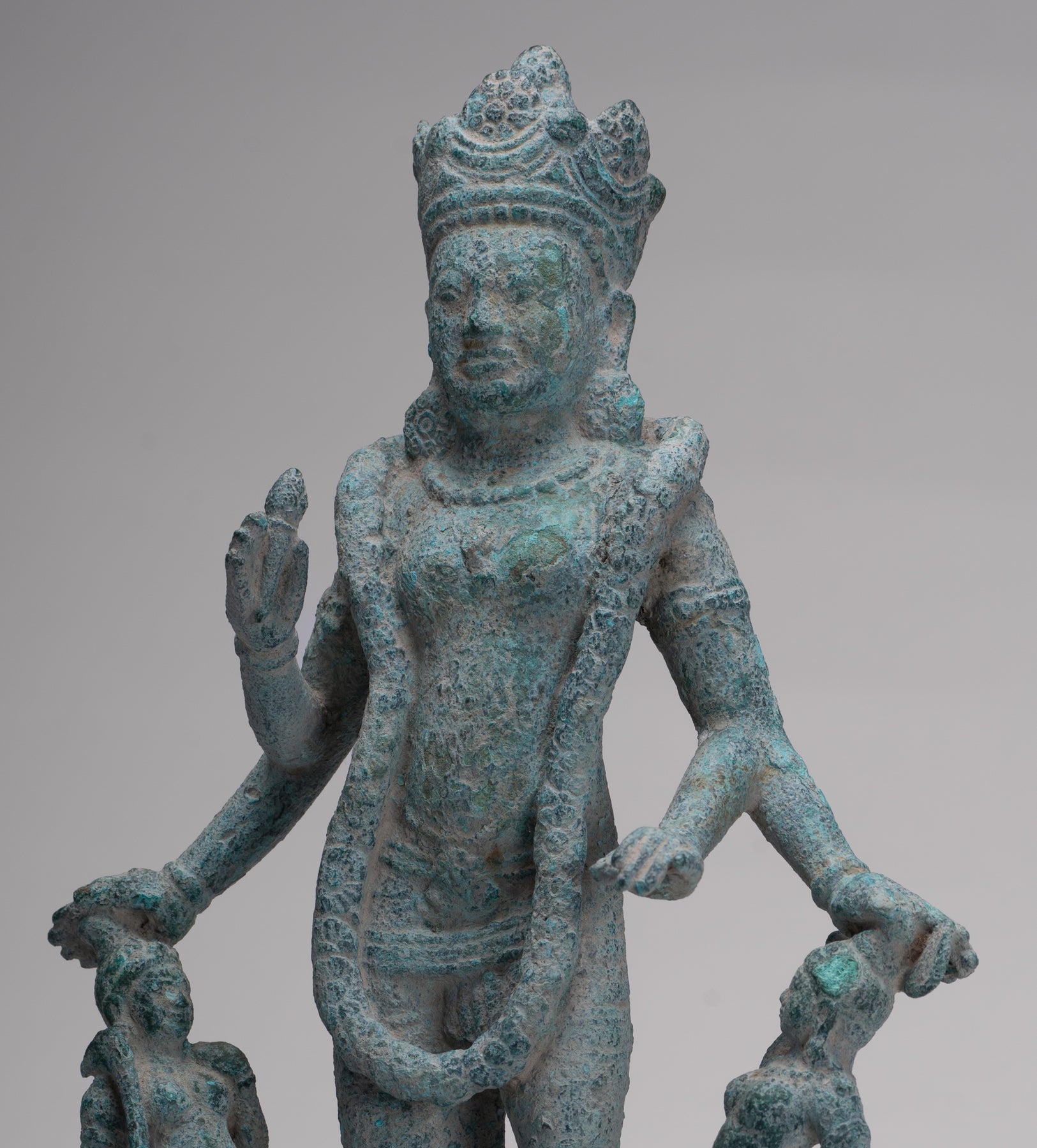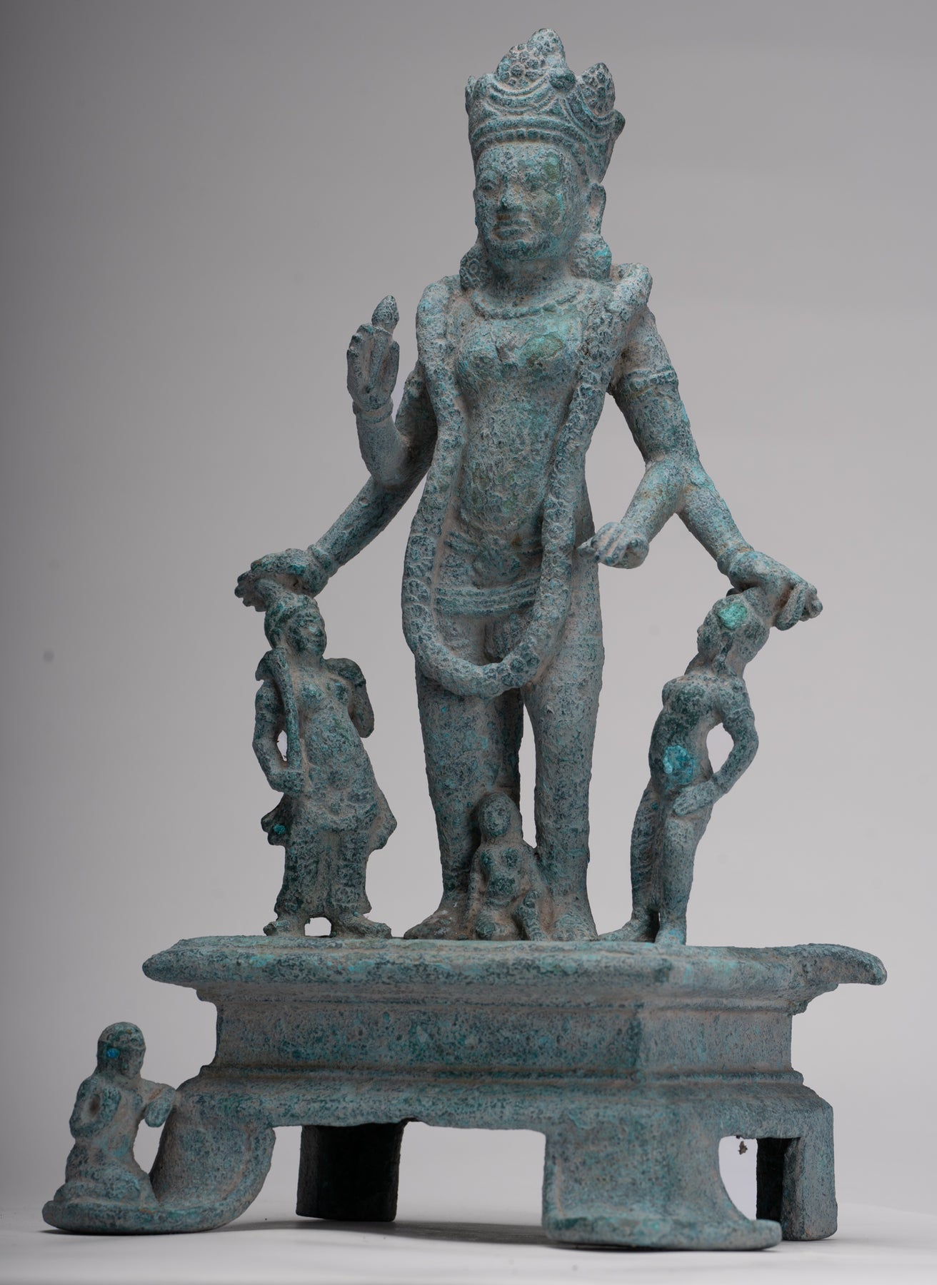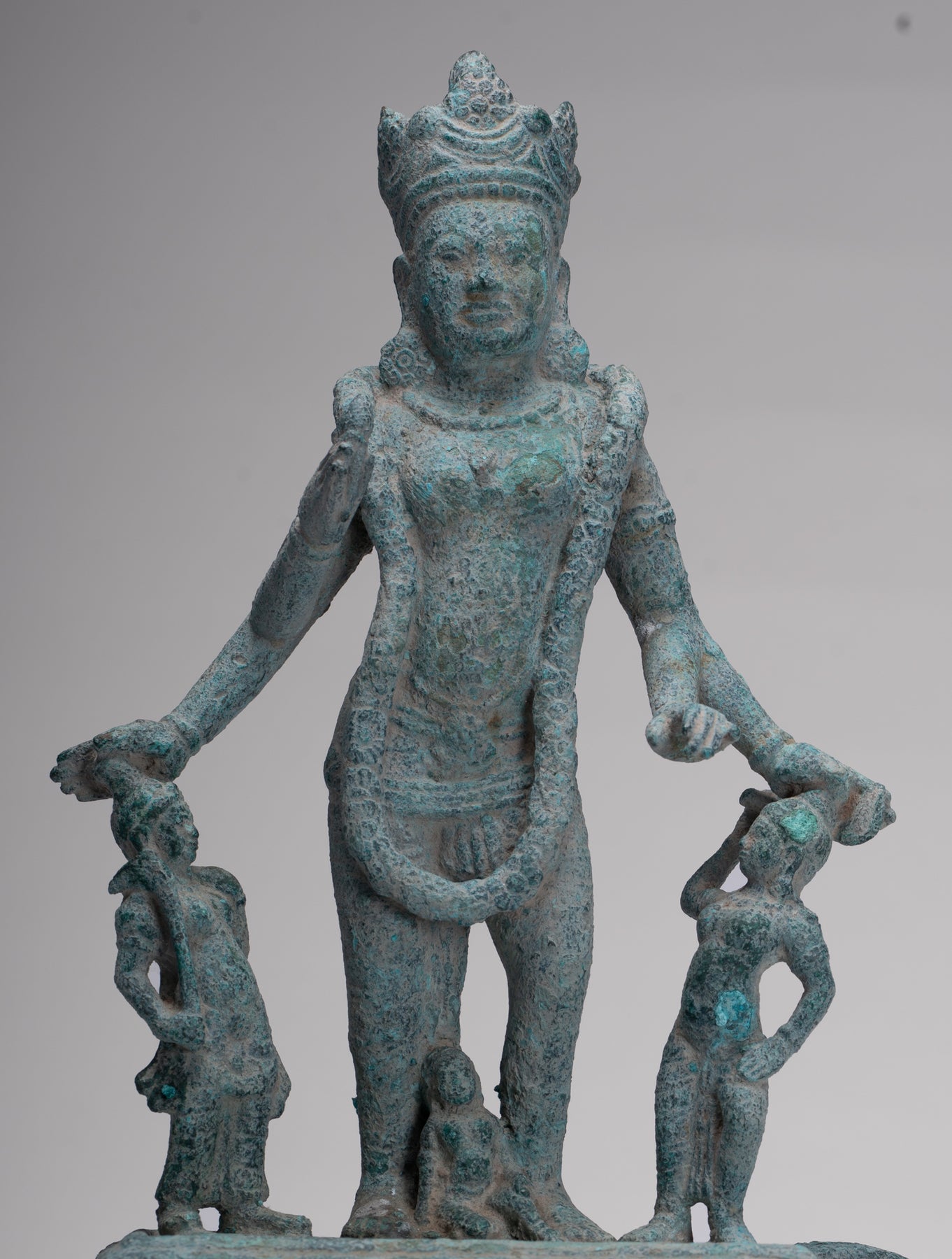 An antique pre-Angkor 7th century Phnom Da style Khmer bronze Vishnu, the Hindu deity of creation, joined by two personifications of his divine weapons. The divine Hindu preserver and protector of human life, a role that provided natural analogies with earthly kingship for the Khmer.