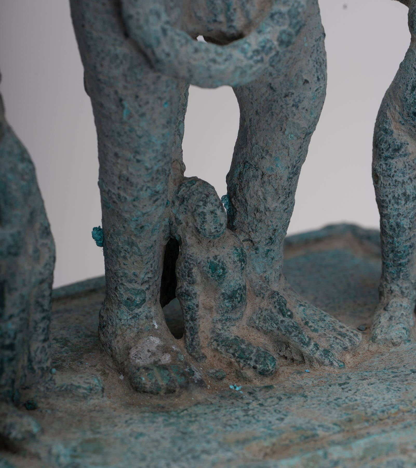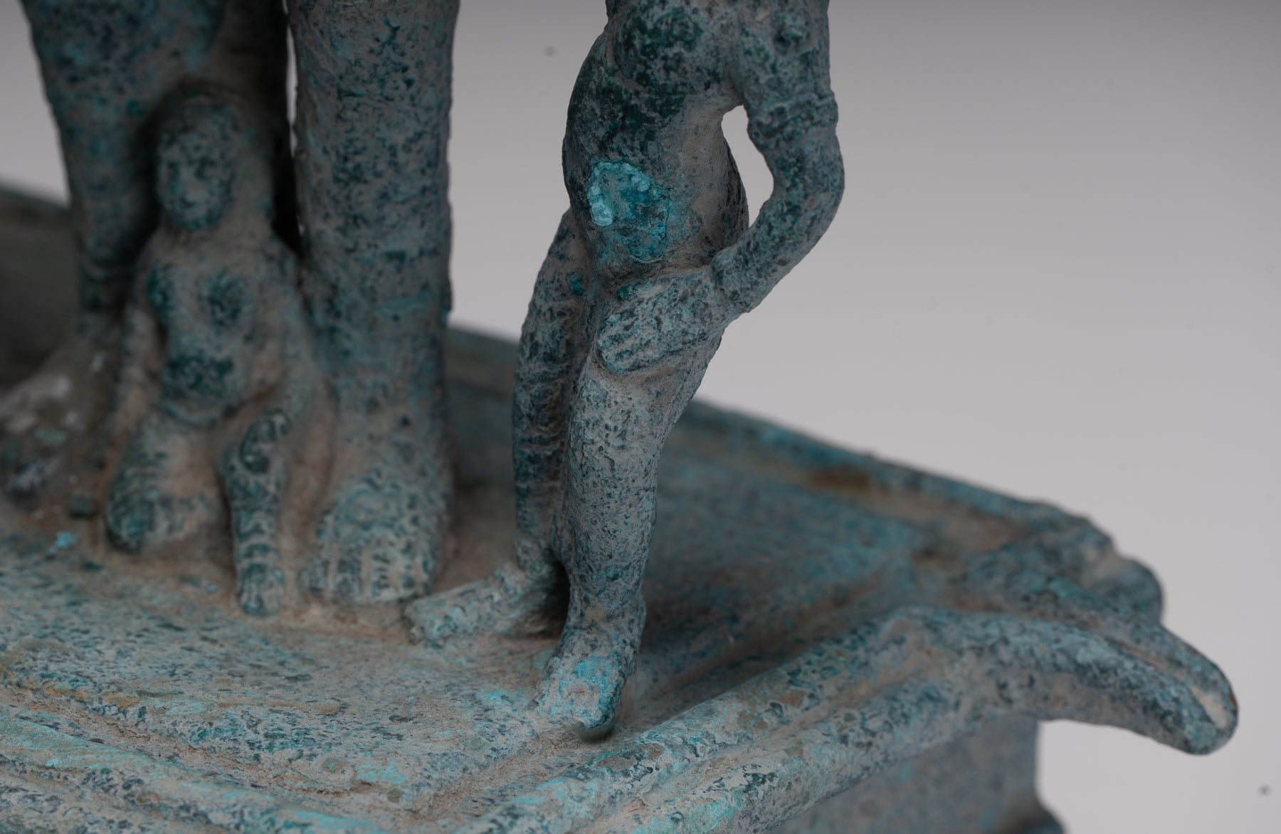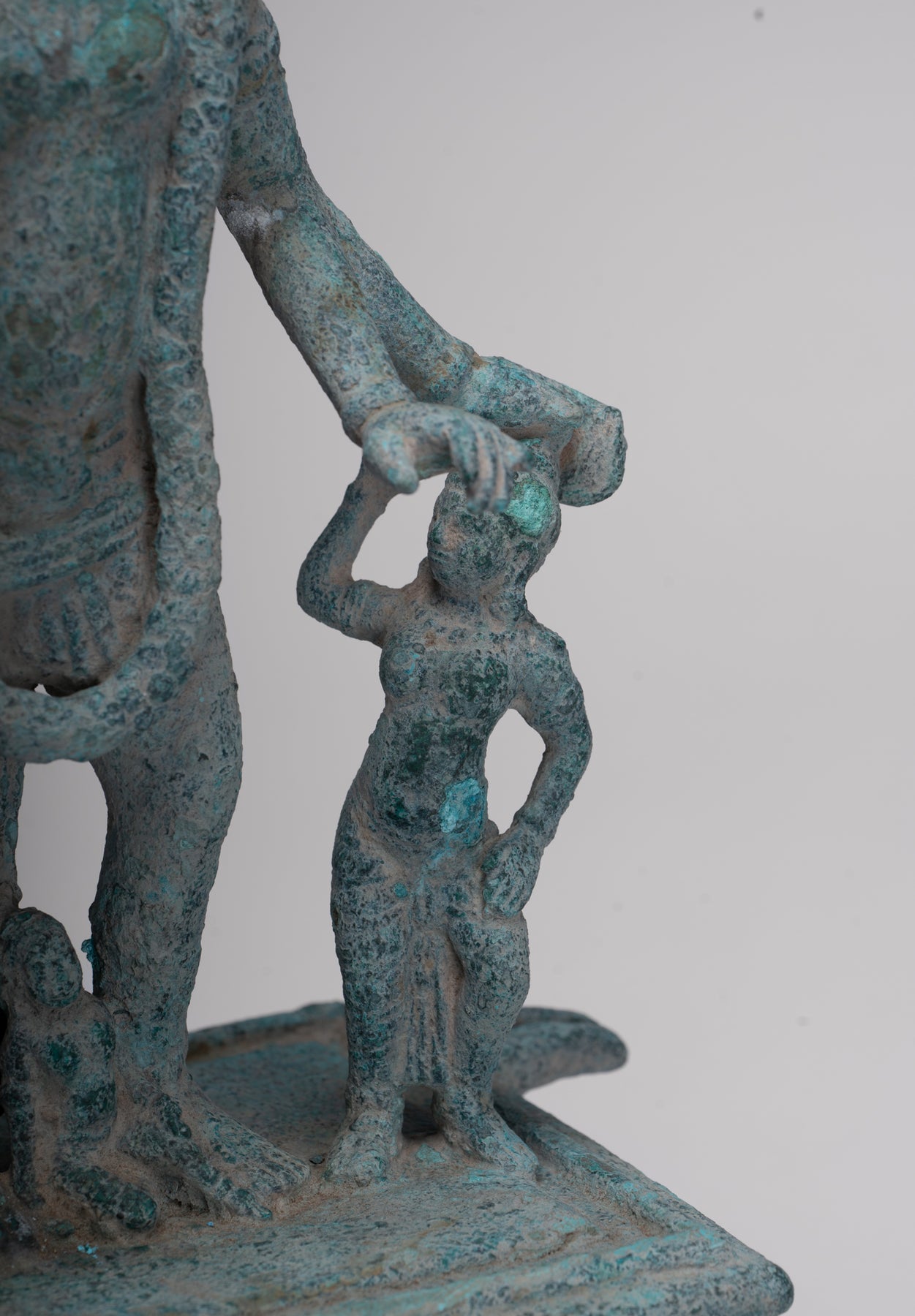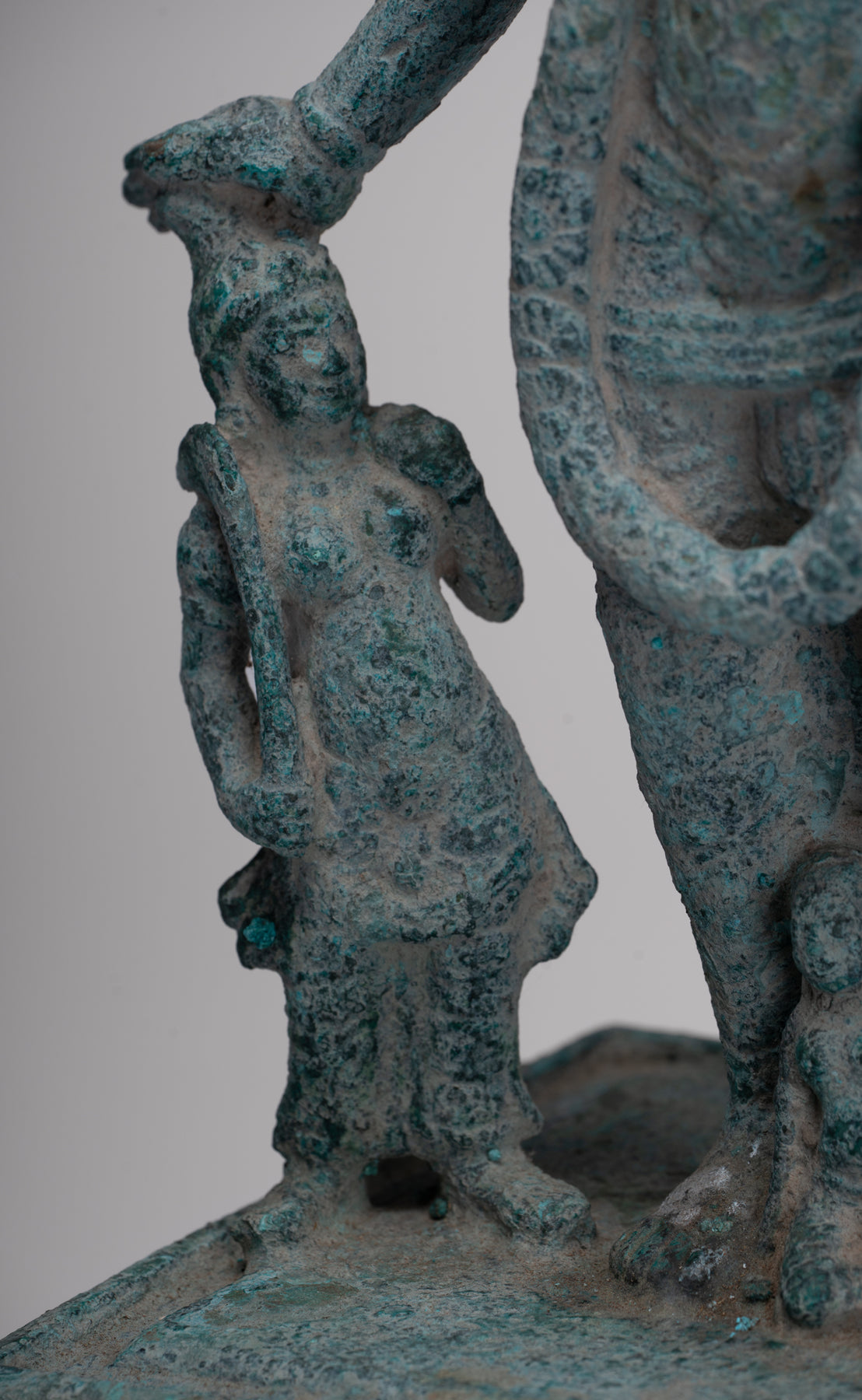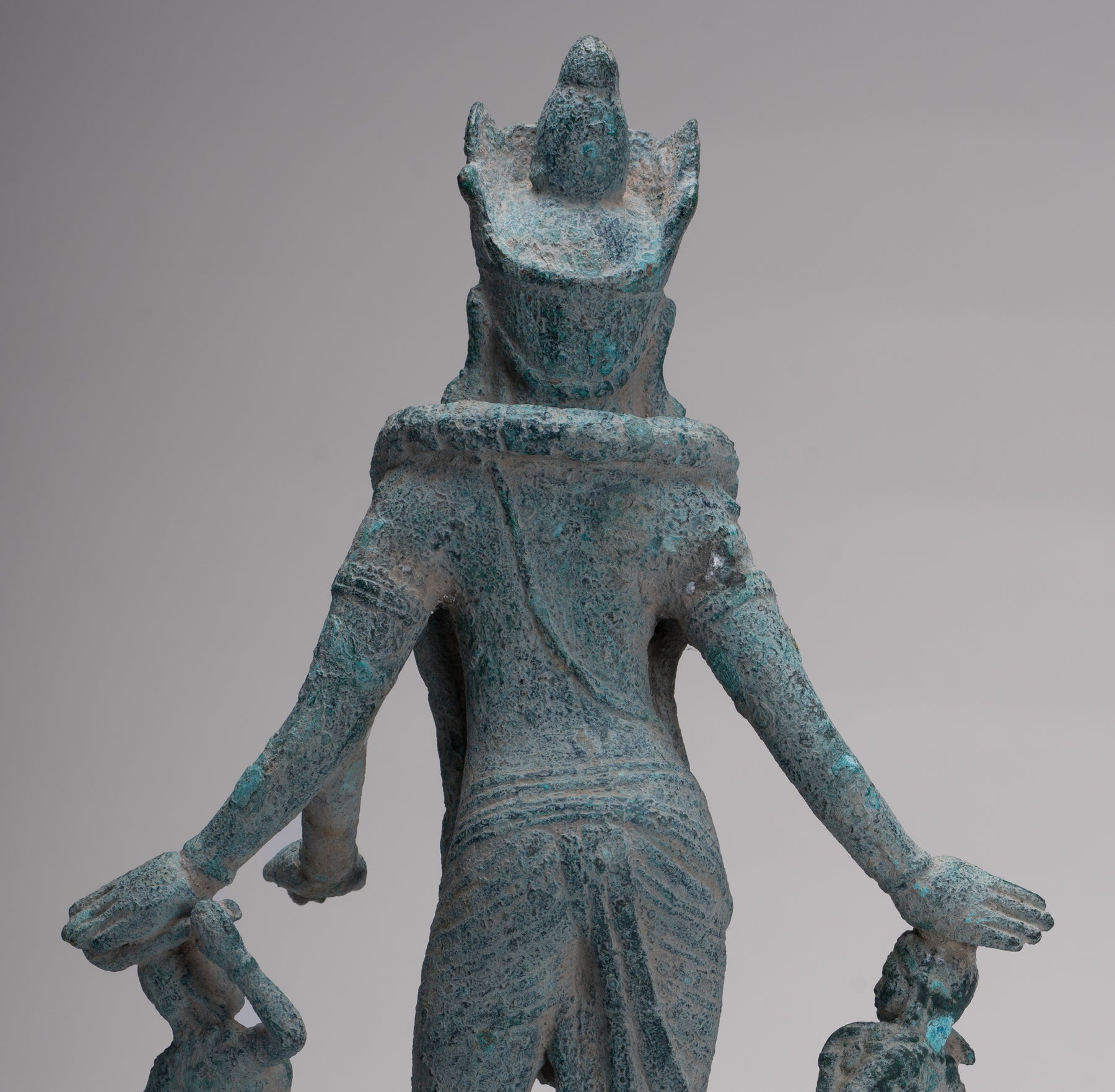 An antique pre-Angkor 7th century Phnom Da style Khmer bronze Vishnu, the Hindu deity of creation, joined by two personifications of his divine weapons. The divine Hindu preserver and protector of human life, a role that provided natural analogies with earthly kingship for the Khmer.