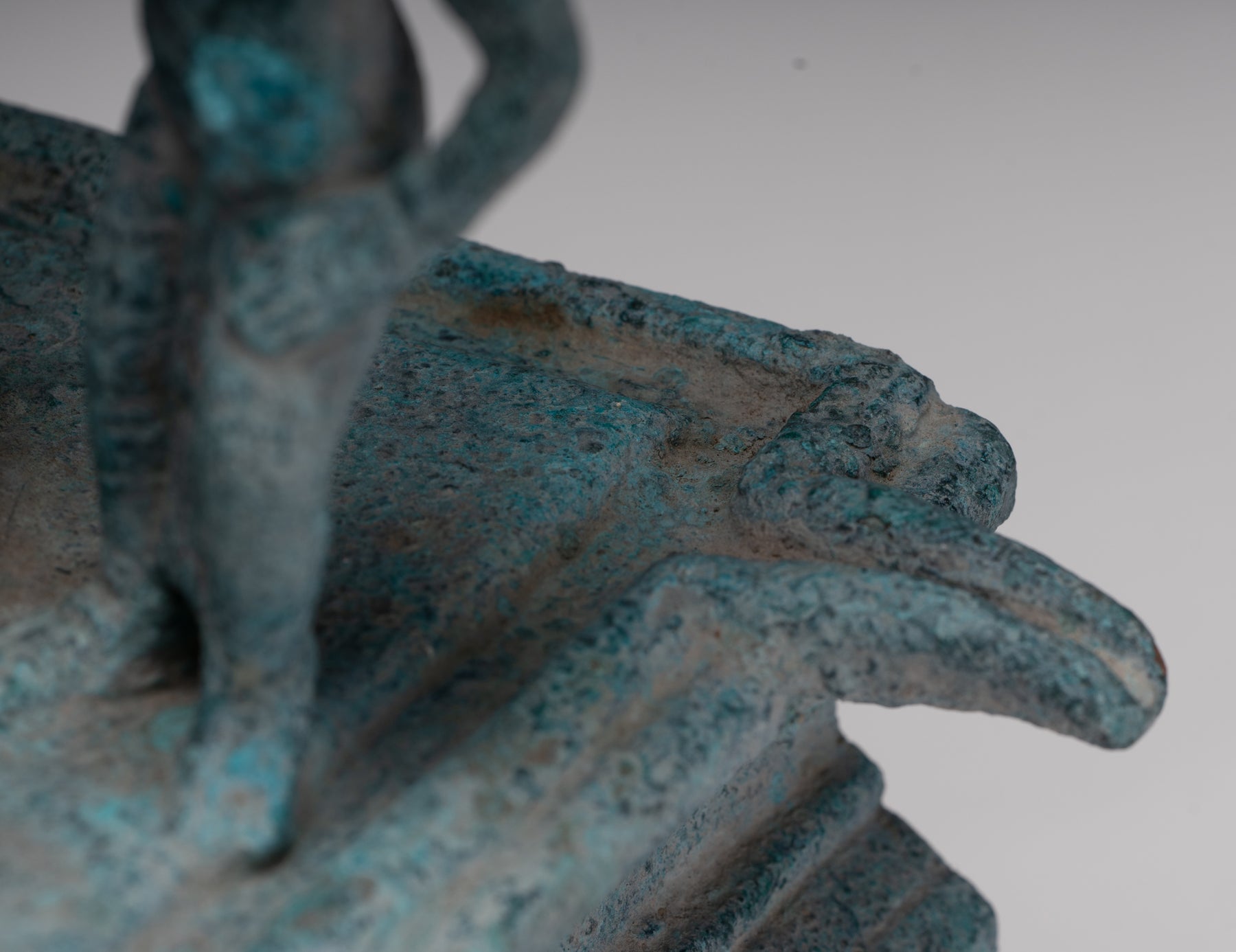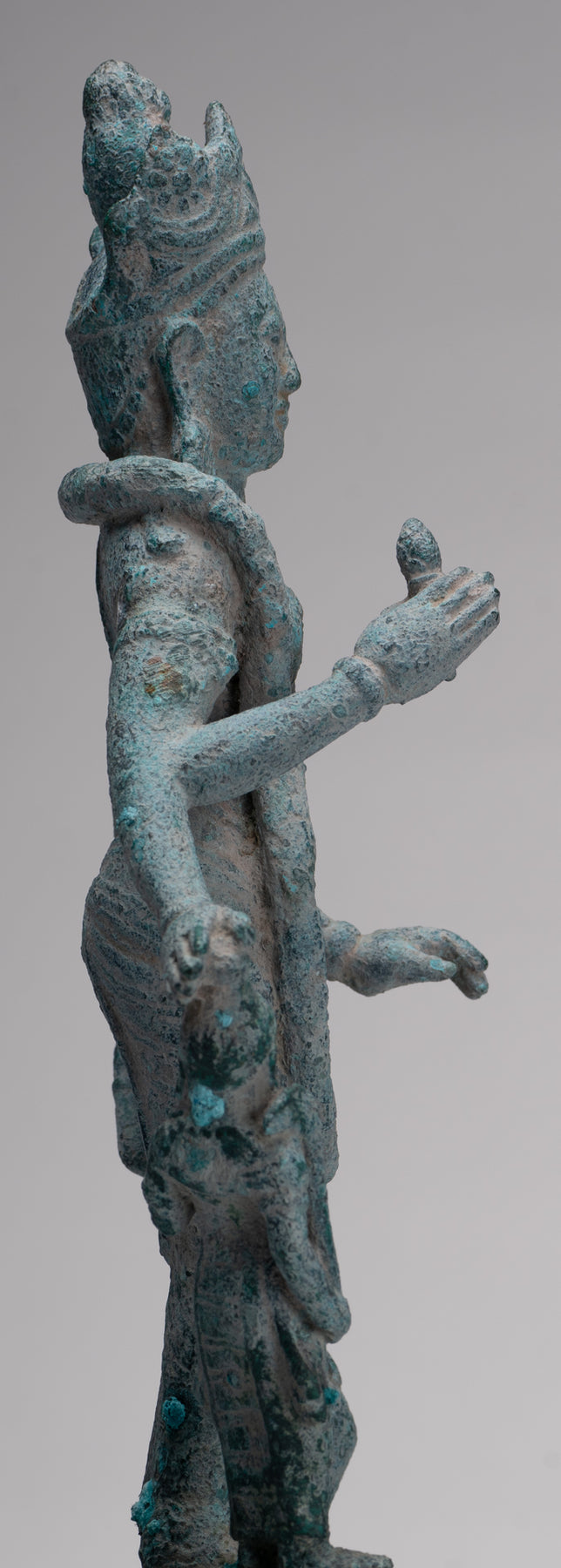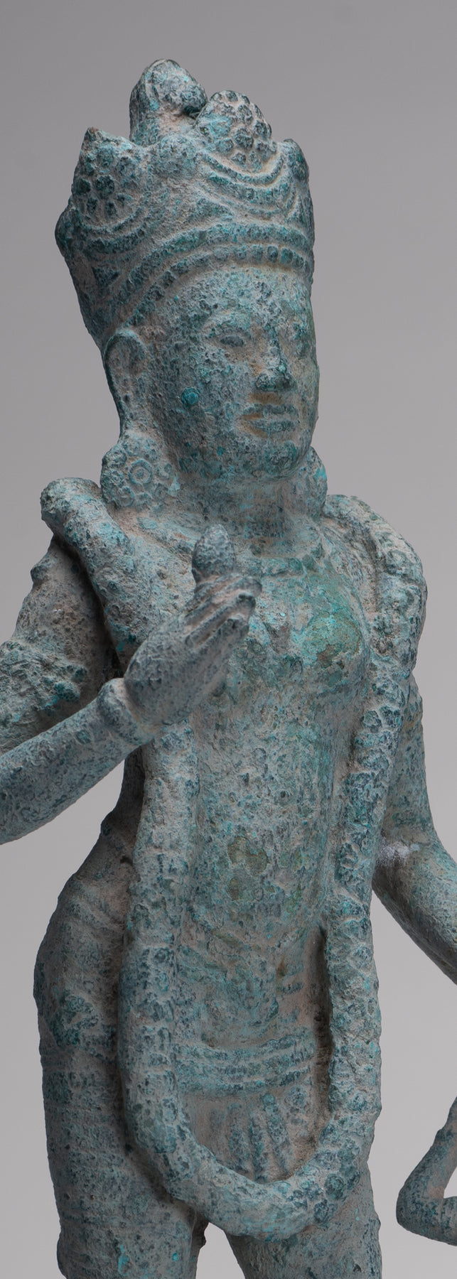 The hair is dressed in a chakra decorated chignon in the Phnom Da style. A diadem surrounds the chignon. The head is surmounted by a lotus bud shaped ushnisha.