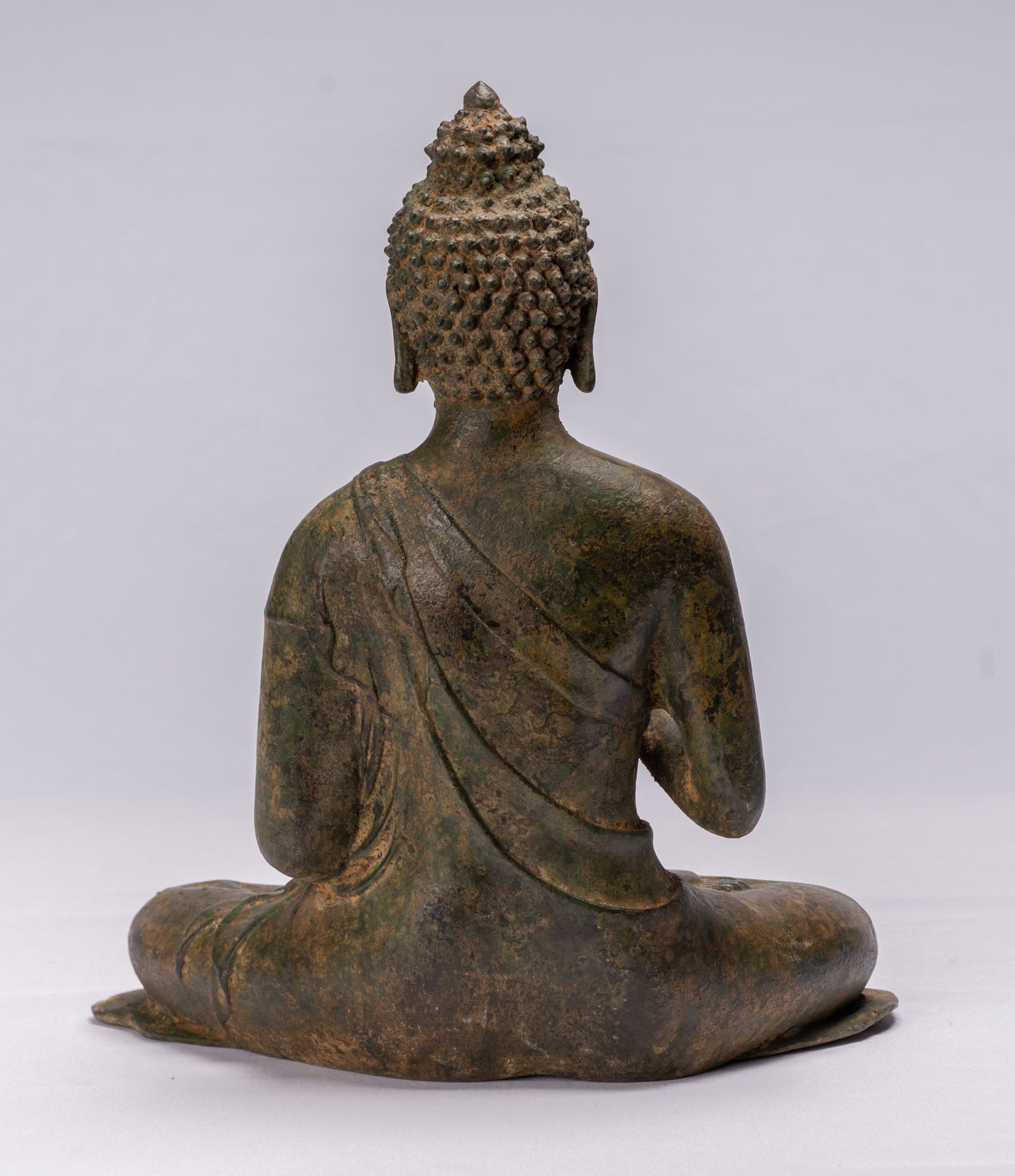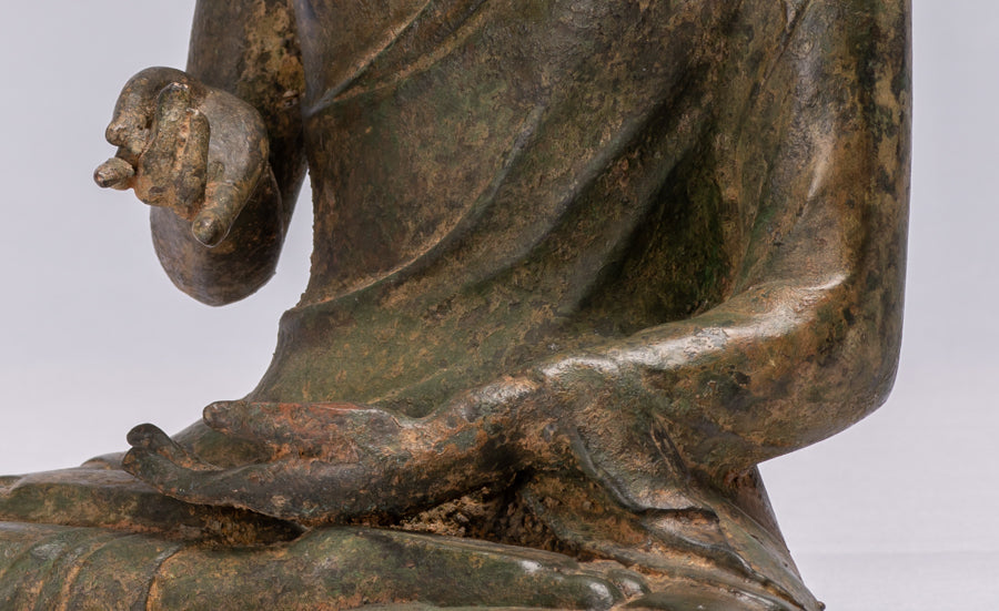 This lovely Buddha is seated in the lotus or Padmasana position, with each foot placed on the opposite thigh. His robes cascade fluidly from his left shoulder.  His robe is draped to leave the right shoulder bare, and a portion of the garment that covers the left wrist falls behind the figure. The lower hem of the robe comes all the way down so that the undercloth or skirt is completely covered.