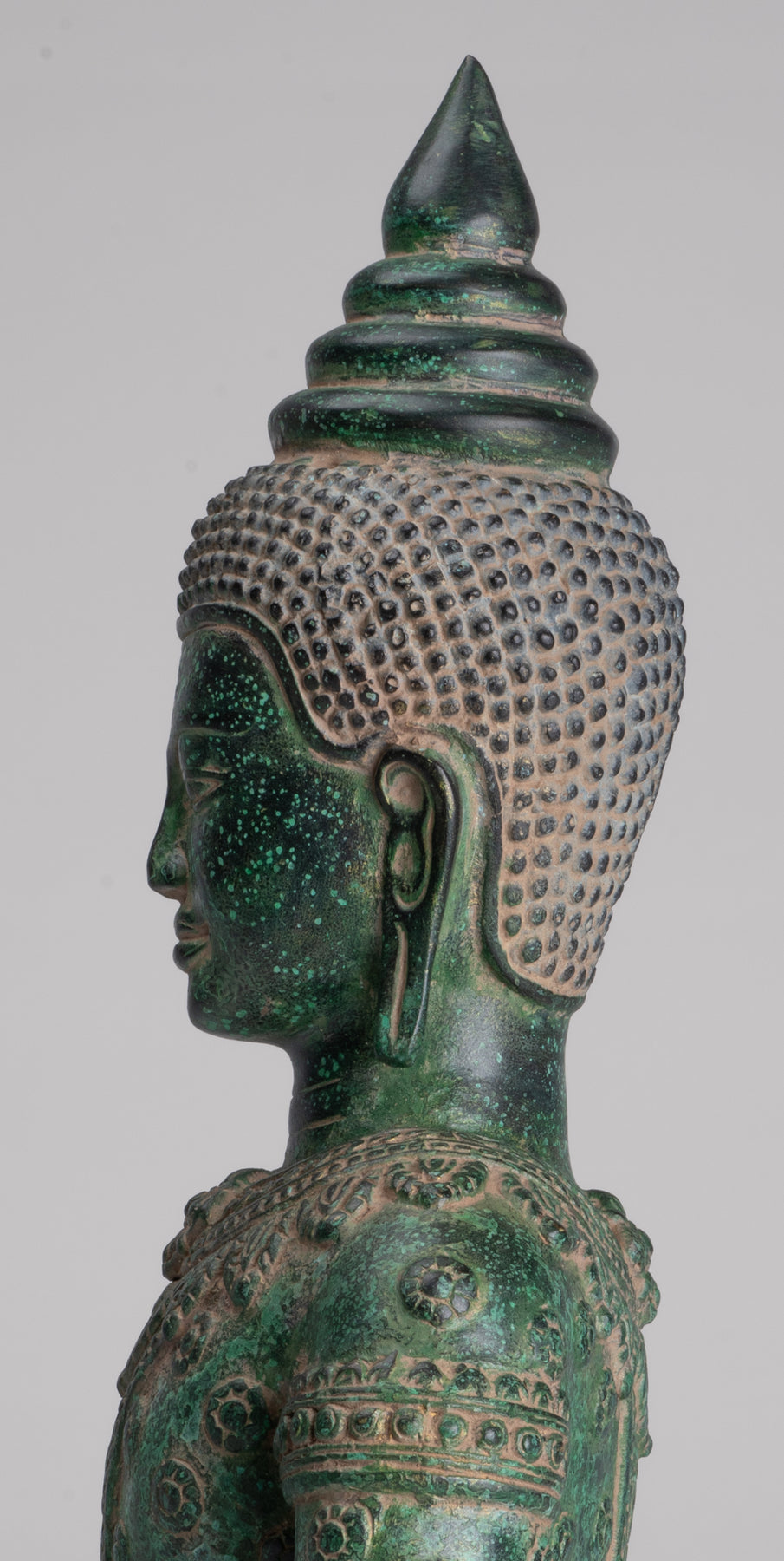 An antique Khmer style Enlightenment Buddha. The Buddha has a peaceful countenance with downcast introspective eyes and a firm brow. The peaceful countenance of Lord Buddha exudes harmony.