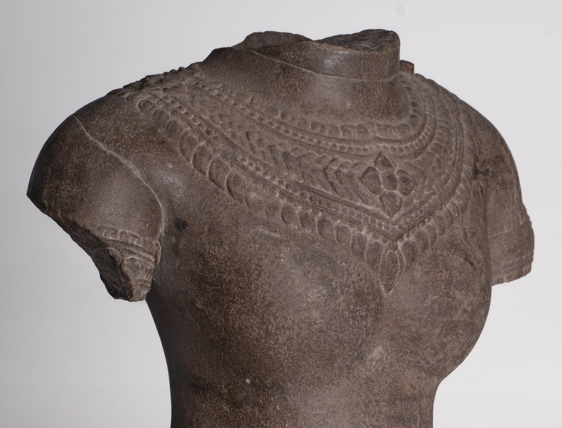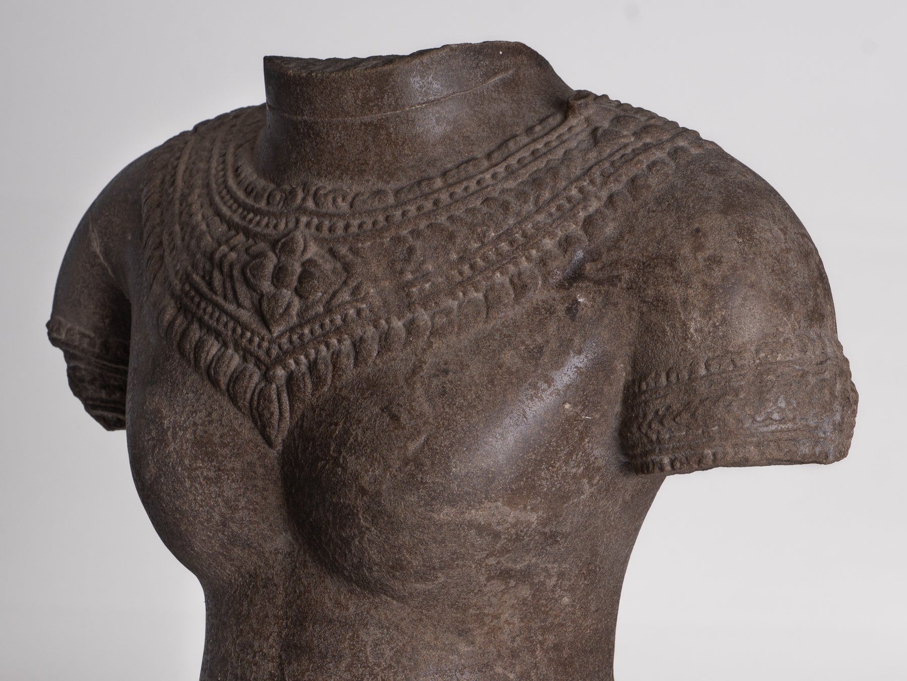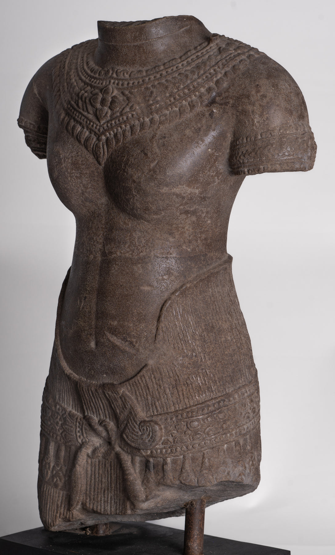 A delightful antique Baphuon‑style stone torso of a devi or goddess, probably Lakshmi, from Cambodia.