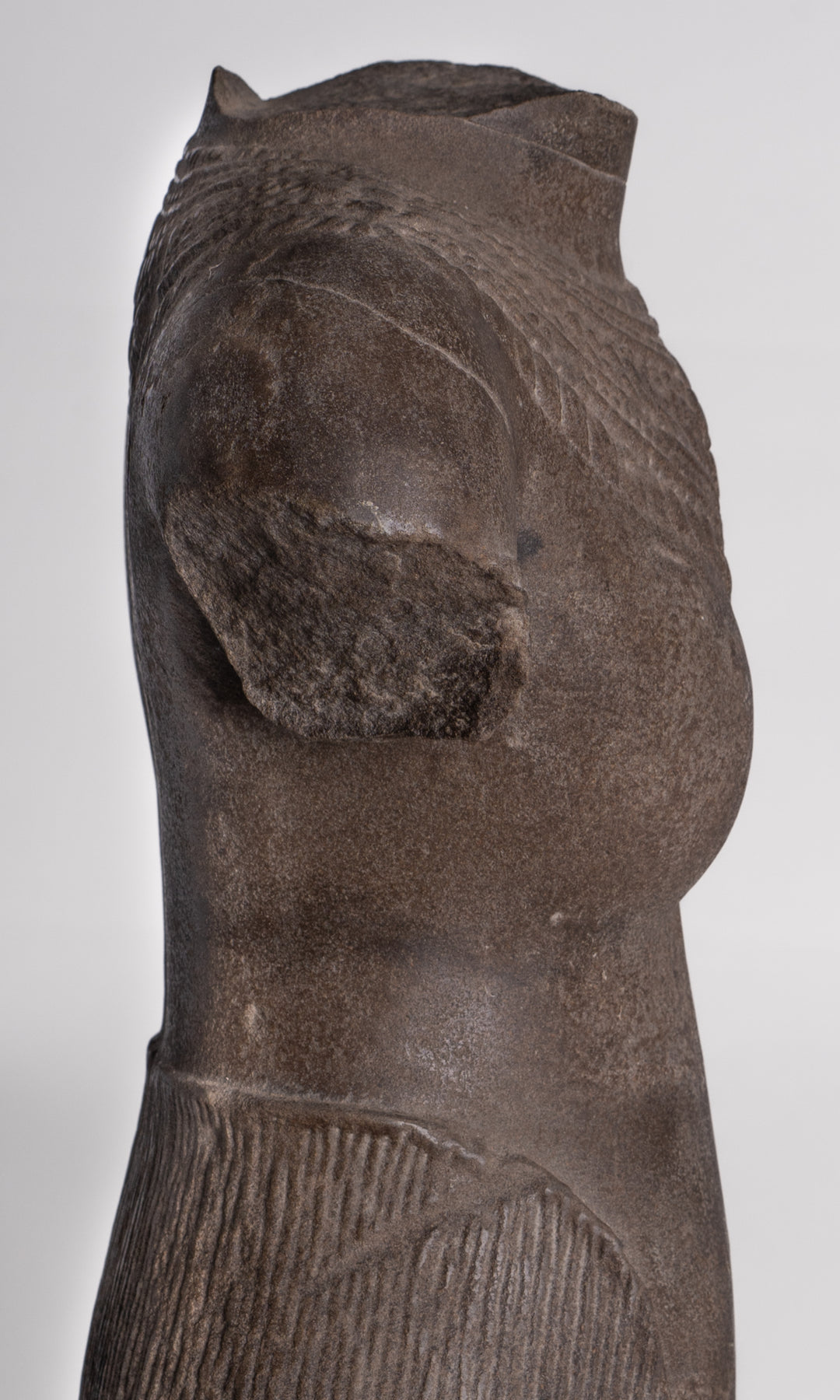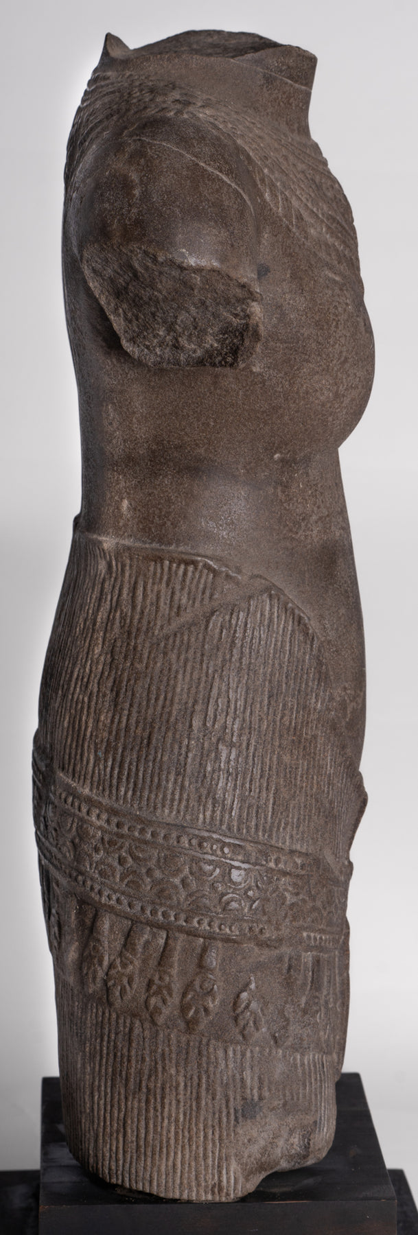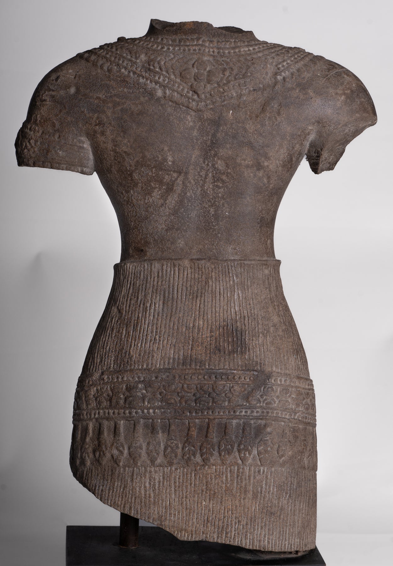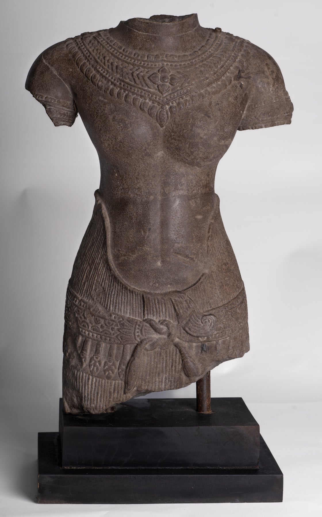 A delightful antique Baphuon‑style stone torso of a devi or goddess, probably Lakshmi, from Cambodia.