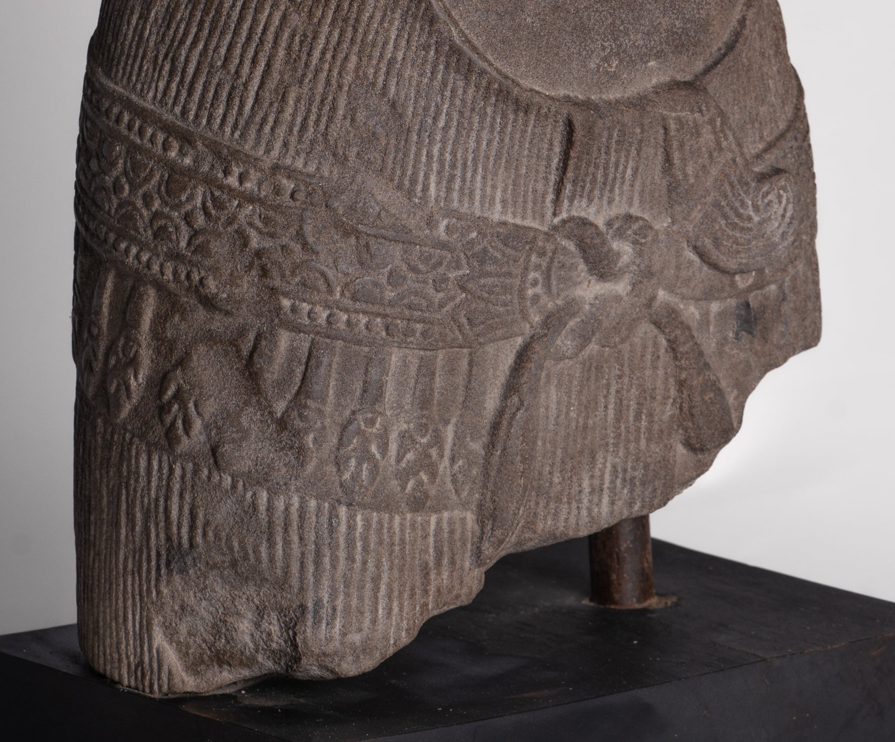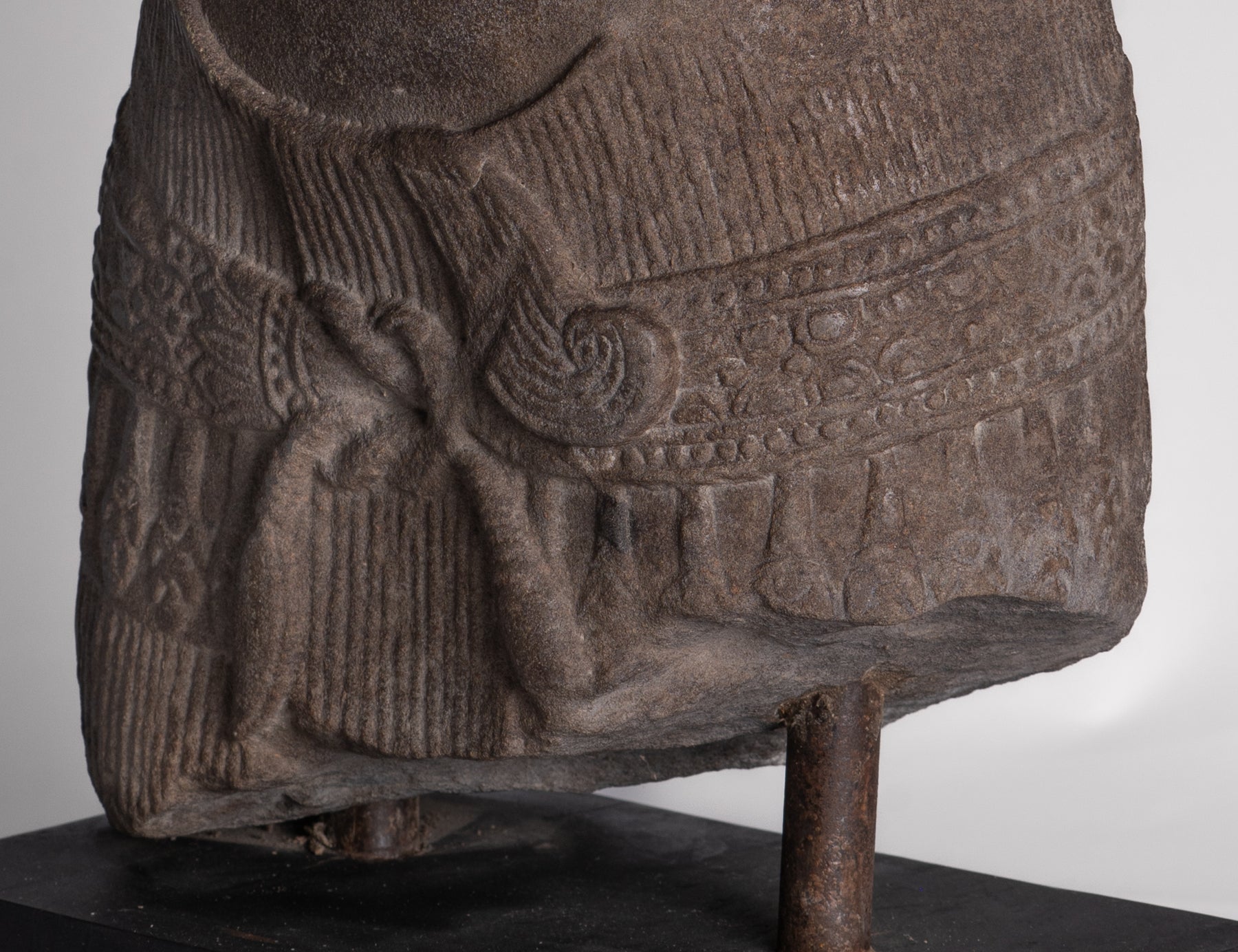This hand‑carved Khmer sandstone deity, executed in the classical Baphuon style, is elegantly modelled from a solid block of stone and presented as found. As is typical of works from this period, the ornamentation displays a perfect mastery of sculptural technique and fluidity of line. The treatment of the form retains characteristics of the earlier Banteay Srei style, but with a slightly softer, more refined delicacy.