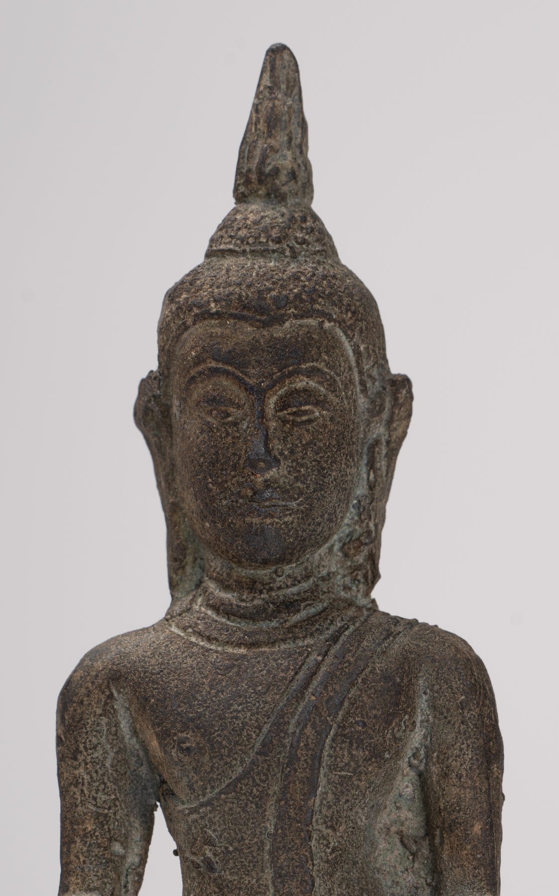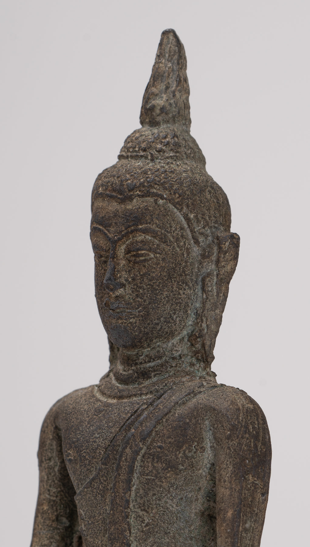 As is typical of Buddha images of the Ayutthaya period the sculpture displays influences of the Lopburi, U Thong and Sukhothai styles. The face is formed of a Sukhothai influenced oval. The Buddha is modestly attired.