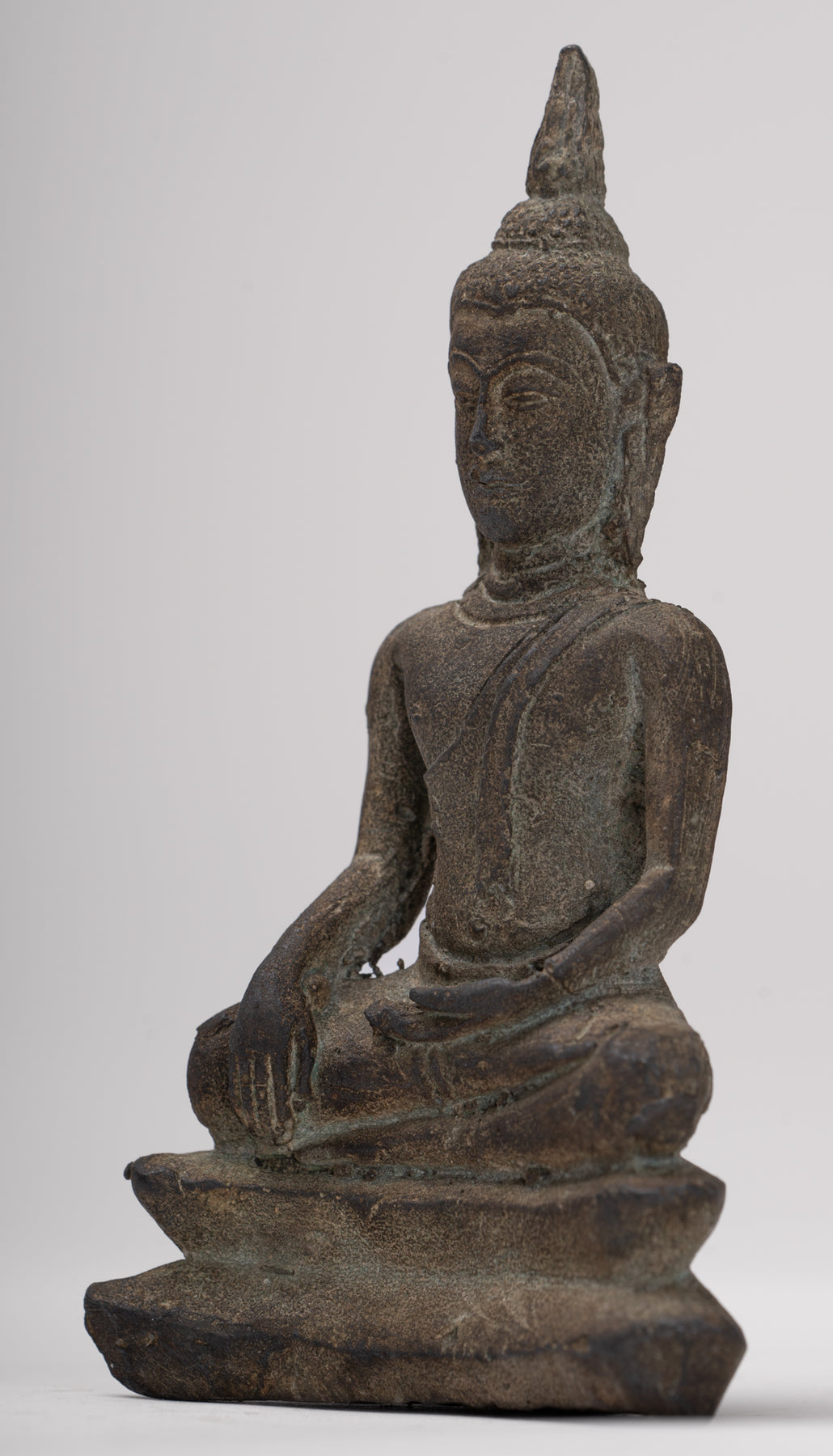 An 18th century antique Thai style Ayutthaya Buddha seated, in virasana, cross-legged symbol of Serenity, in the Bhumisparsa or 'Calling Earth to Witness' mudra seated on a simple pedestal.