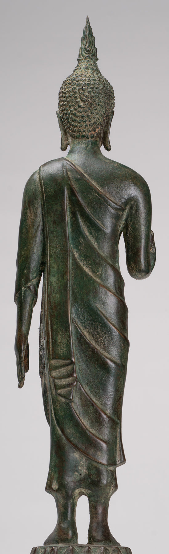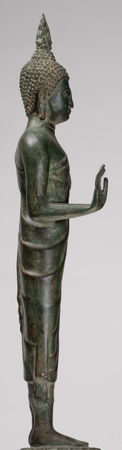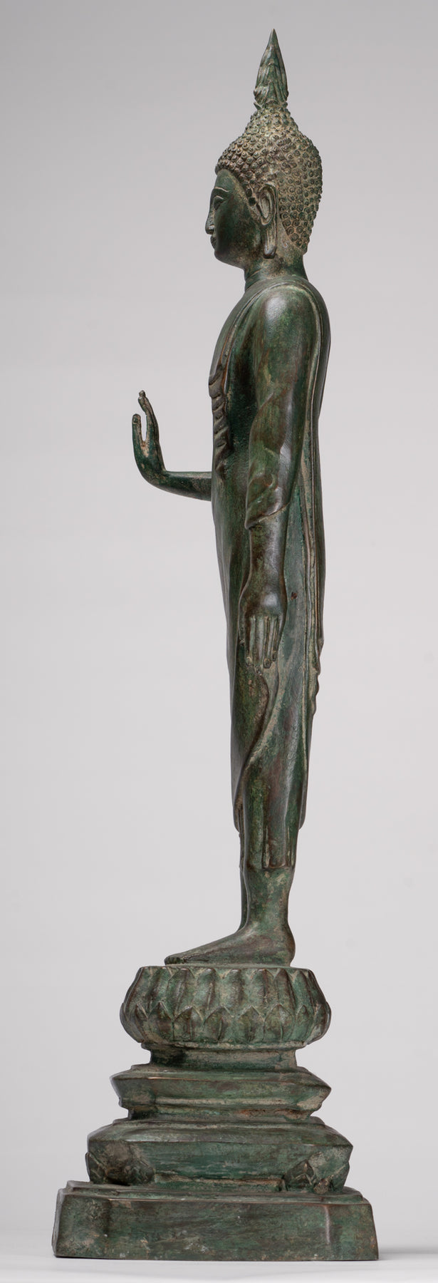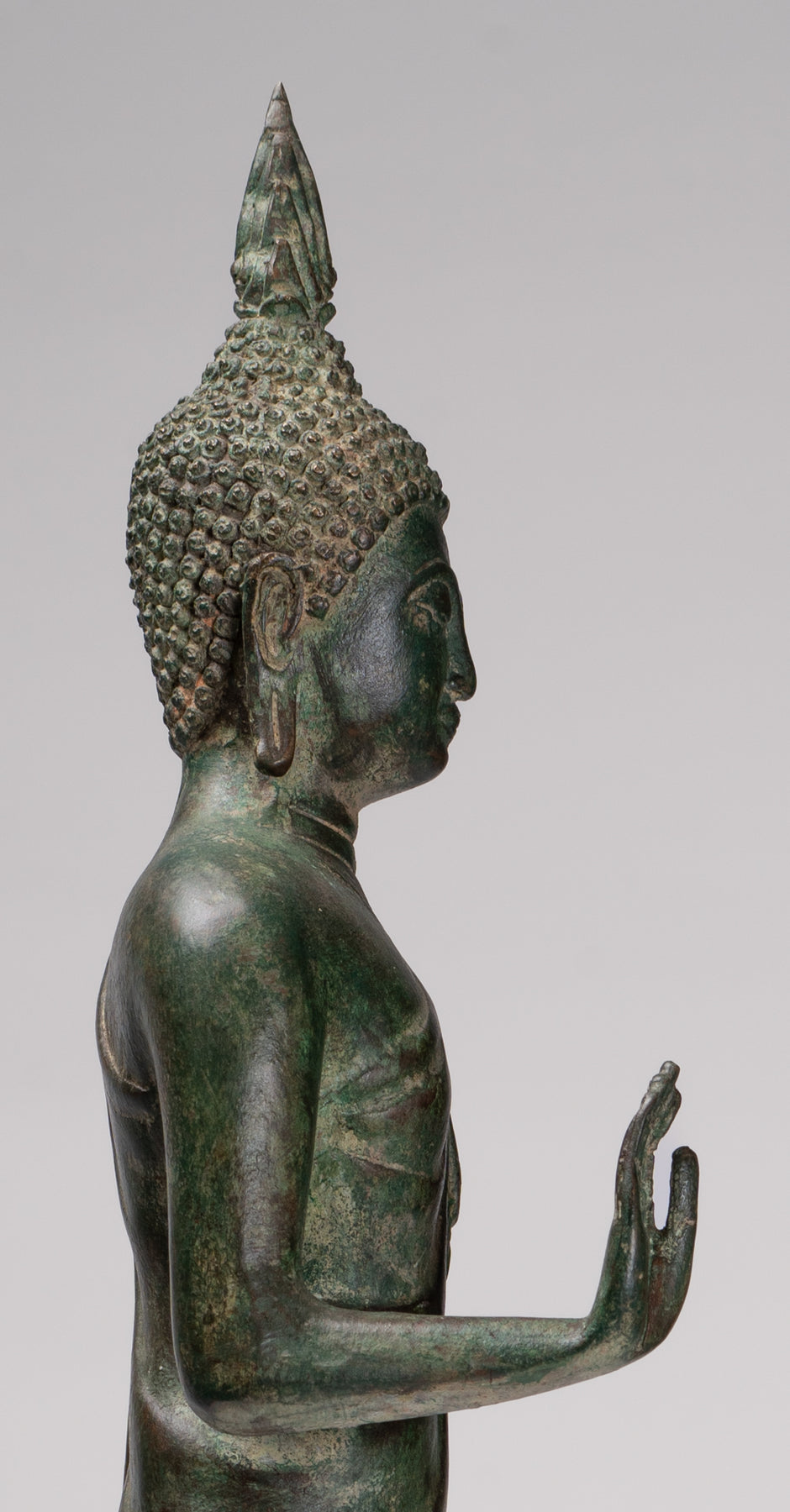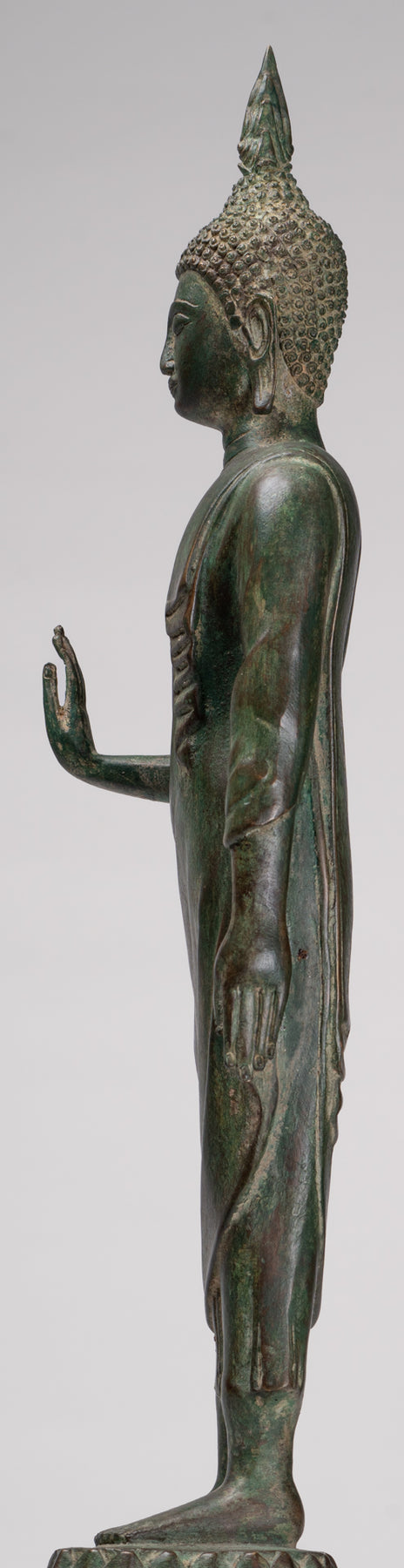 The Lord Buddha is stood in the Abhaya or protection mudra on lotus leaf base. The large flame shape ushnisha protuberance on top of his head, in the Sukhothai style, symbolizes his high level of spiritual development.