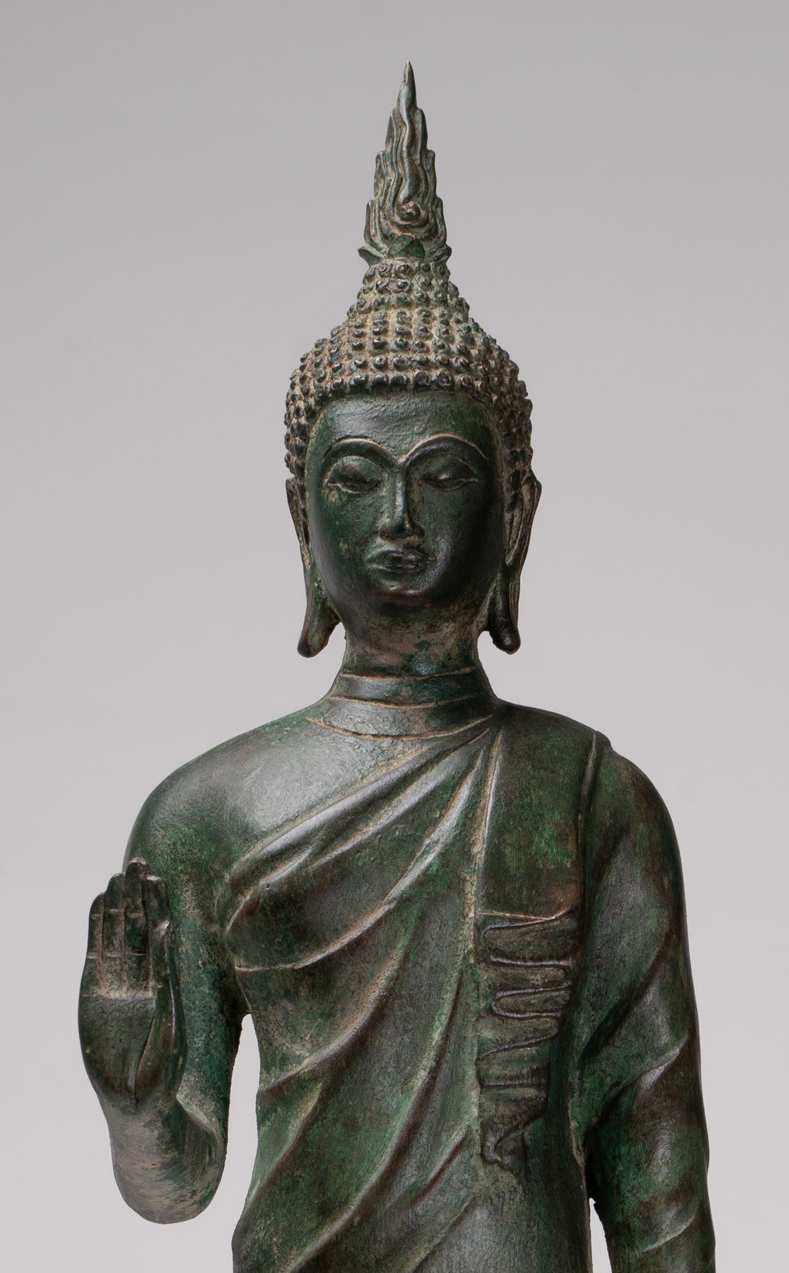 • Antique Thai Style Bronze Standing Double Abhaya Mudra Protection Sukhothai Buddha Statue - 62cm/25"