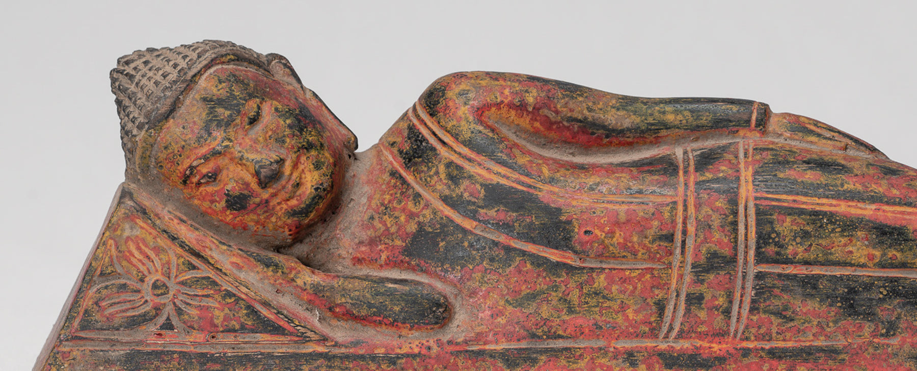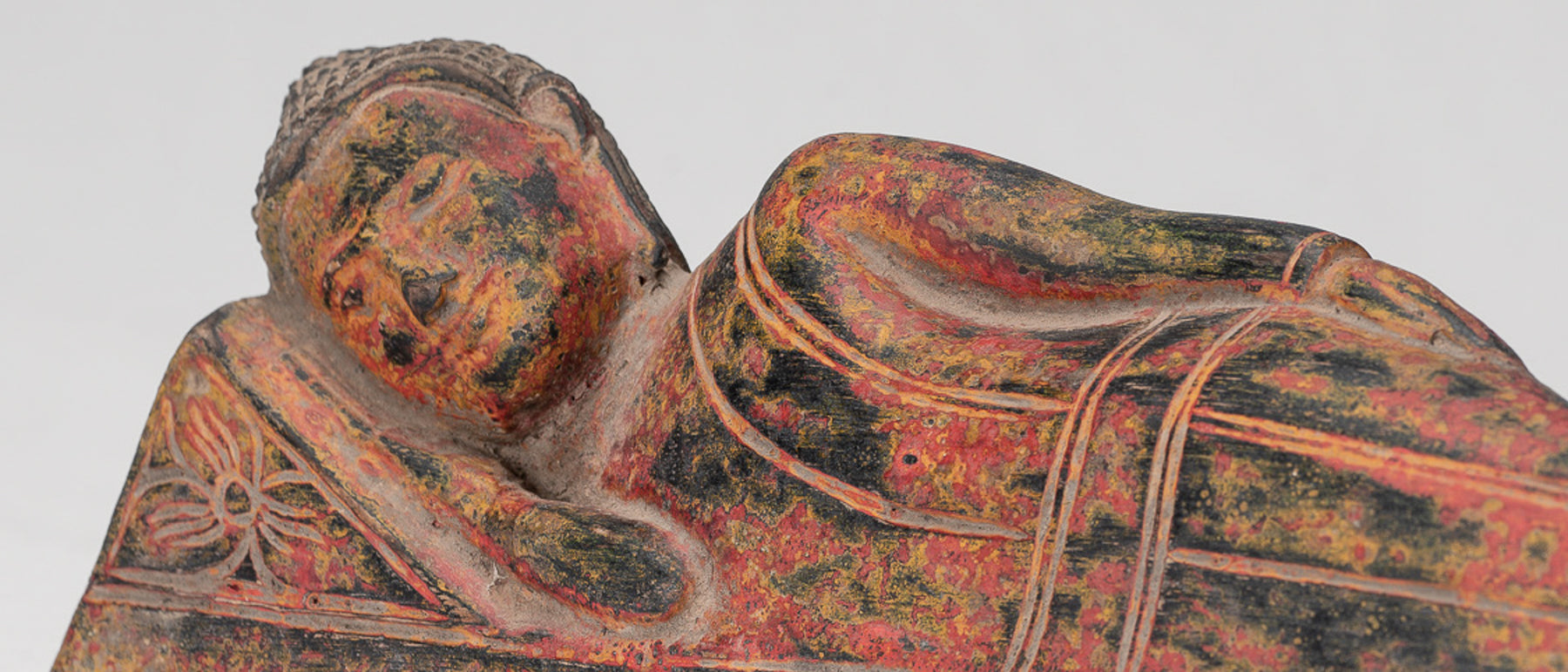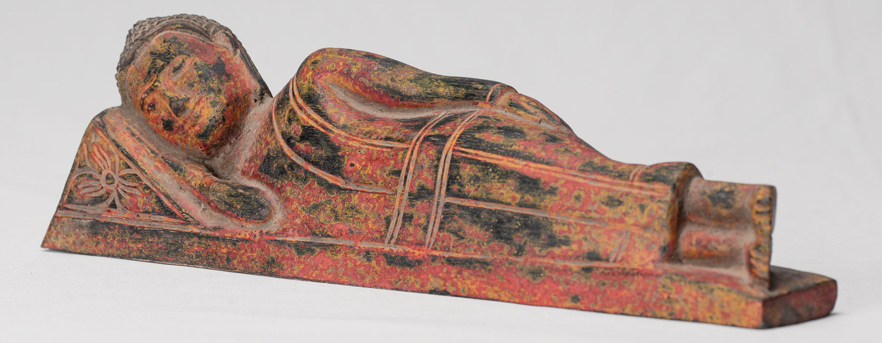 The peaceful countenance of Lord Buddha exudes harmony. The Buddha is laying down on his side in calm repose. This pose captures him in his final moments before his death. The pose is also referred to as the sleeping Buddha and symbolises the Buddha's achievement of nirvana or enlightenment. The Buddha knew the exact moment of his death and at this time lay down to sleep and simply passed away peacefully with his enlightened soul eternally escaping the cycle of samasara. The reclining pose demonstrates Buddhas attainment of nirvana. It is also the Thai Buddhist symbol for those born on a Tuesday.