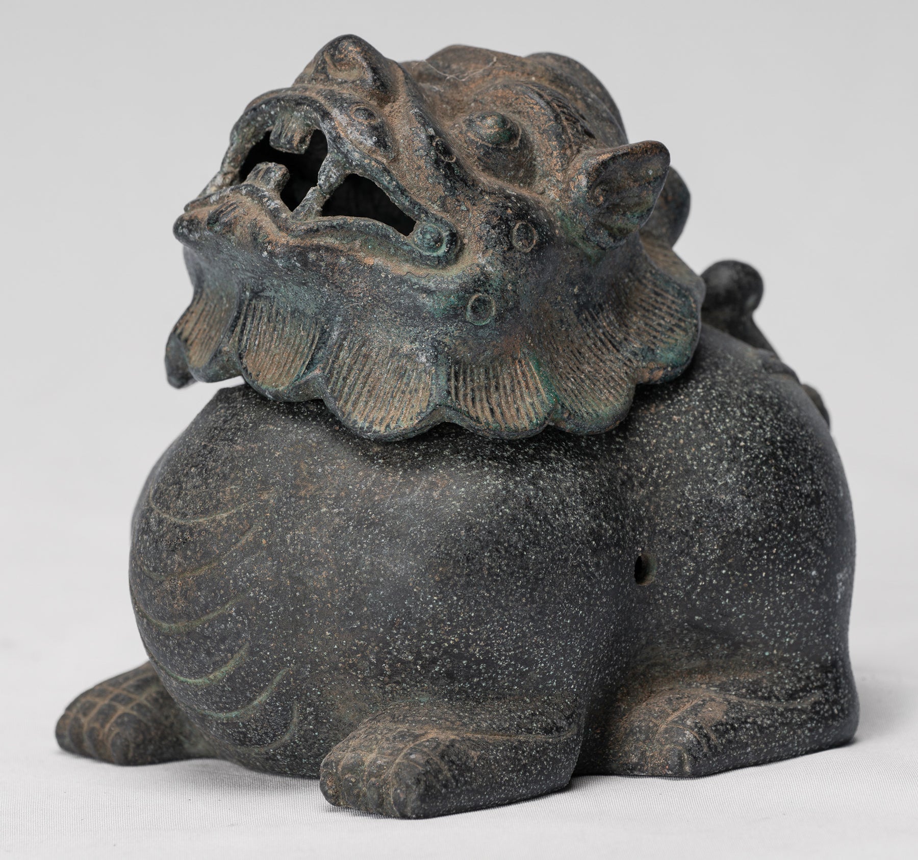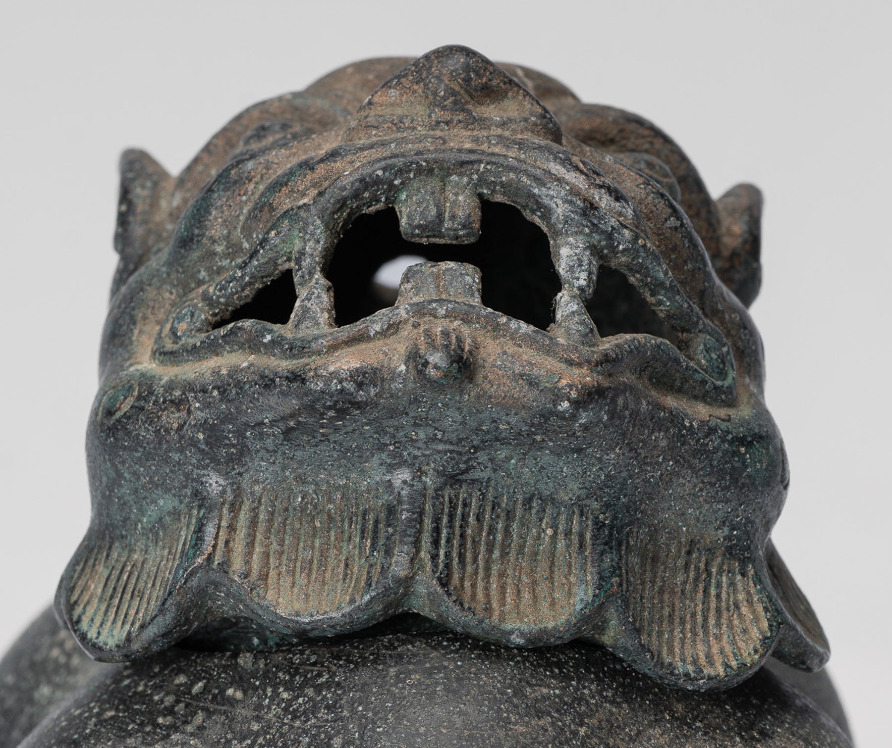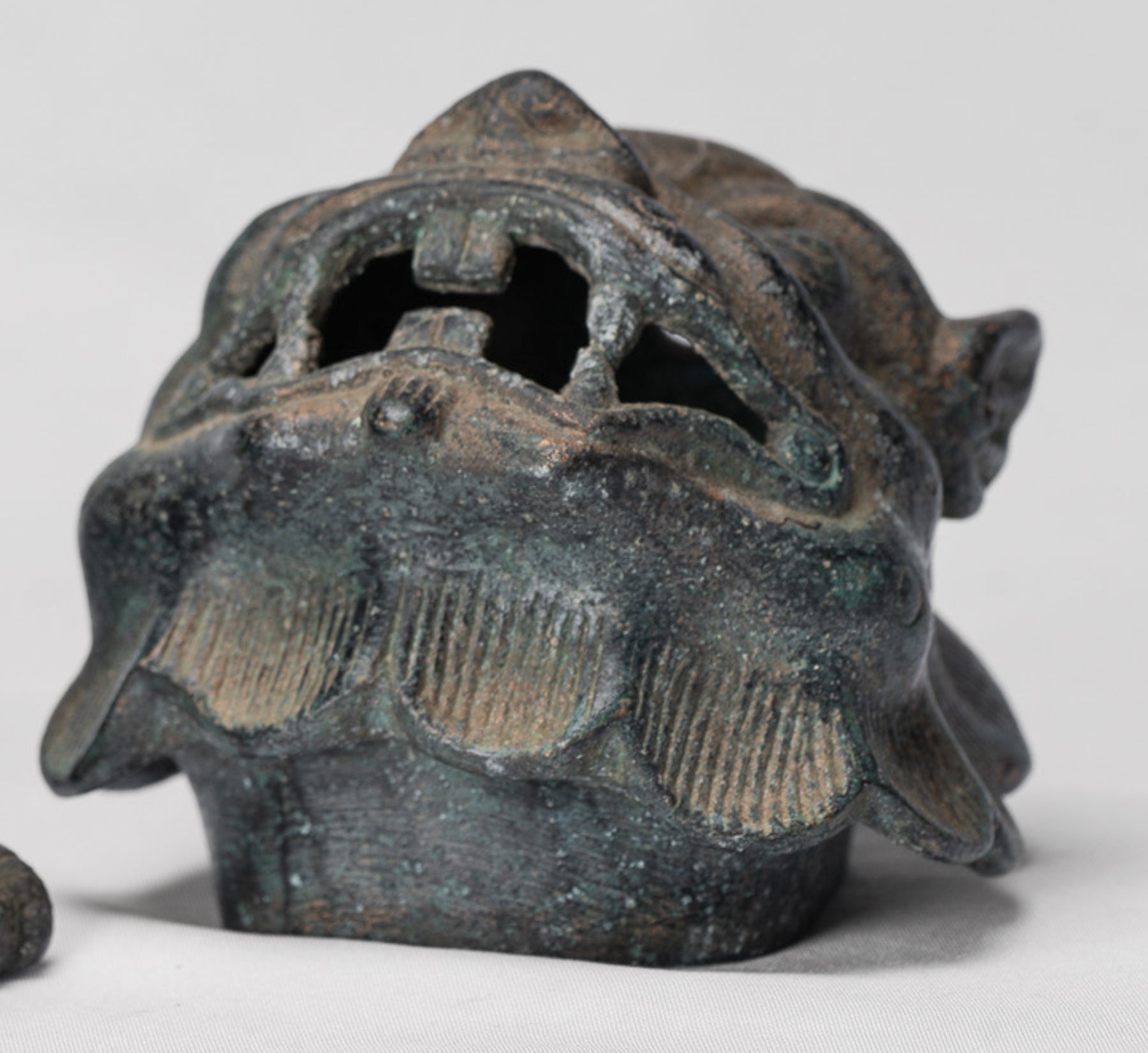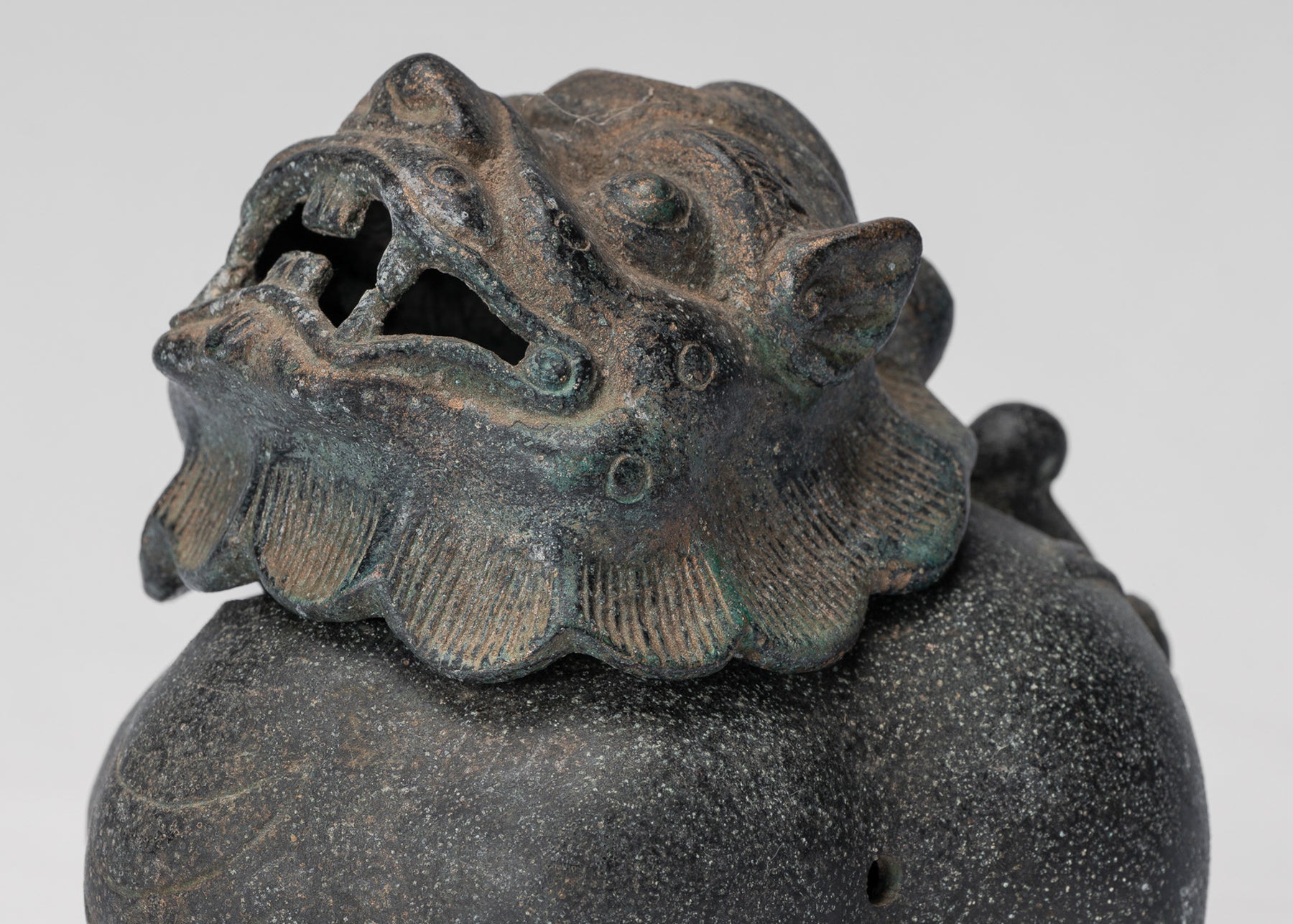 Der Guss ist von besonders hoher Qualität, was sich in der klaren Modellierung des Gesichts und der Schuppen des Drachen zeigt; Jedes Detail wird sauber und sicher wiedergegeben. Eine charakteristische, mit der Zeit aufgeweichte Patina bereichert die Bronzeoberfläche und verleiht ihr Tiefe, Charakter und ein Gefühl von Alter.