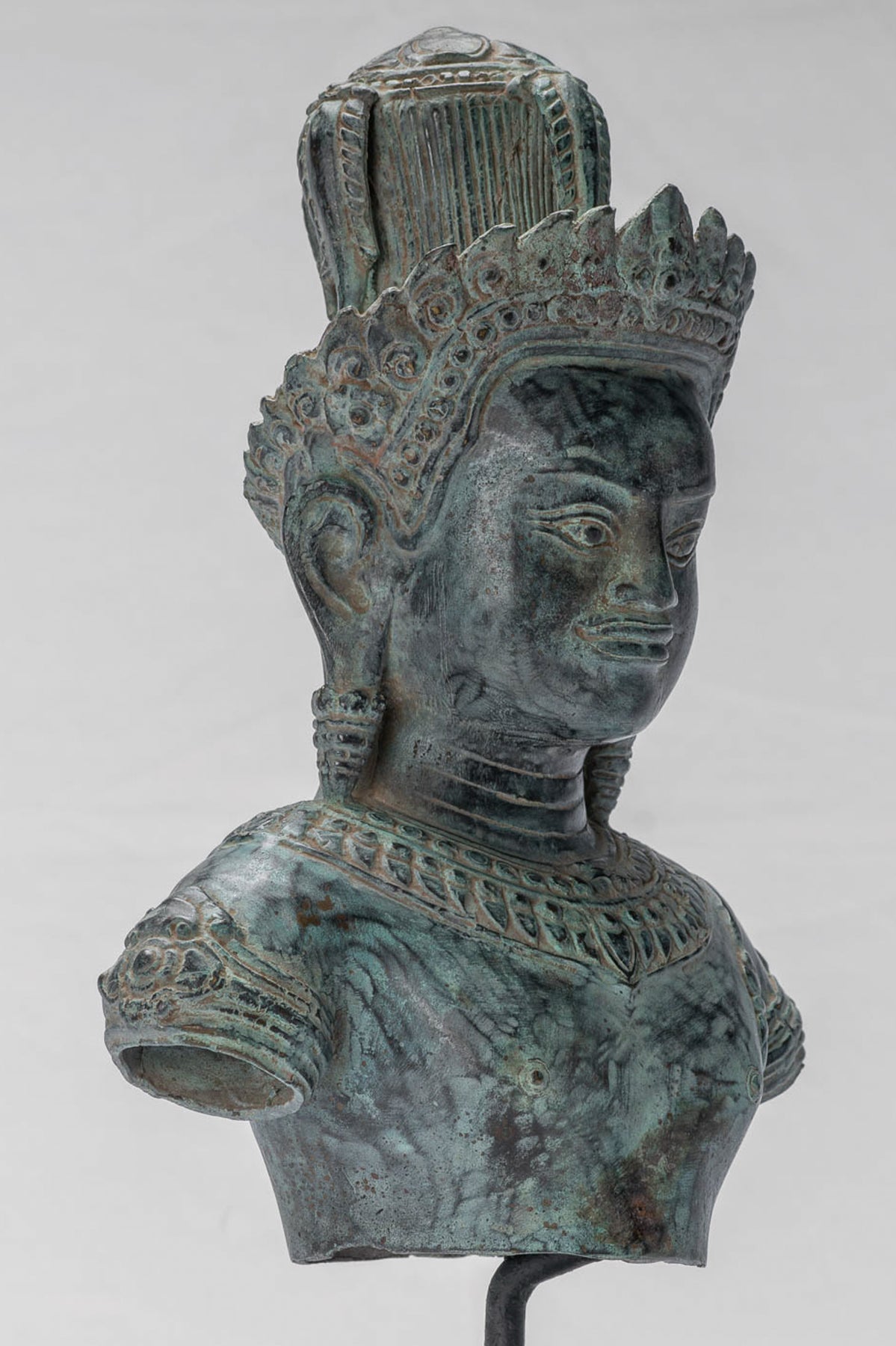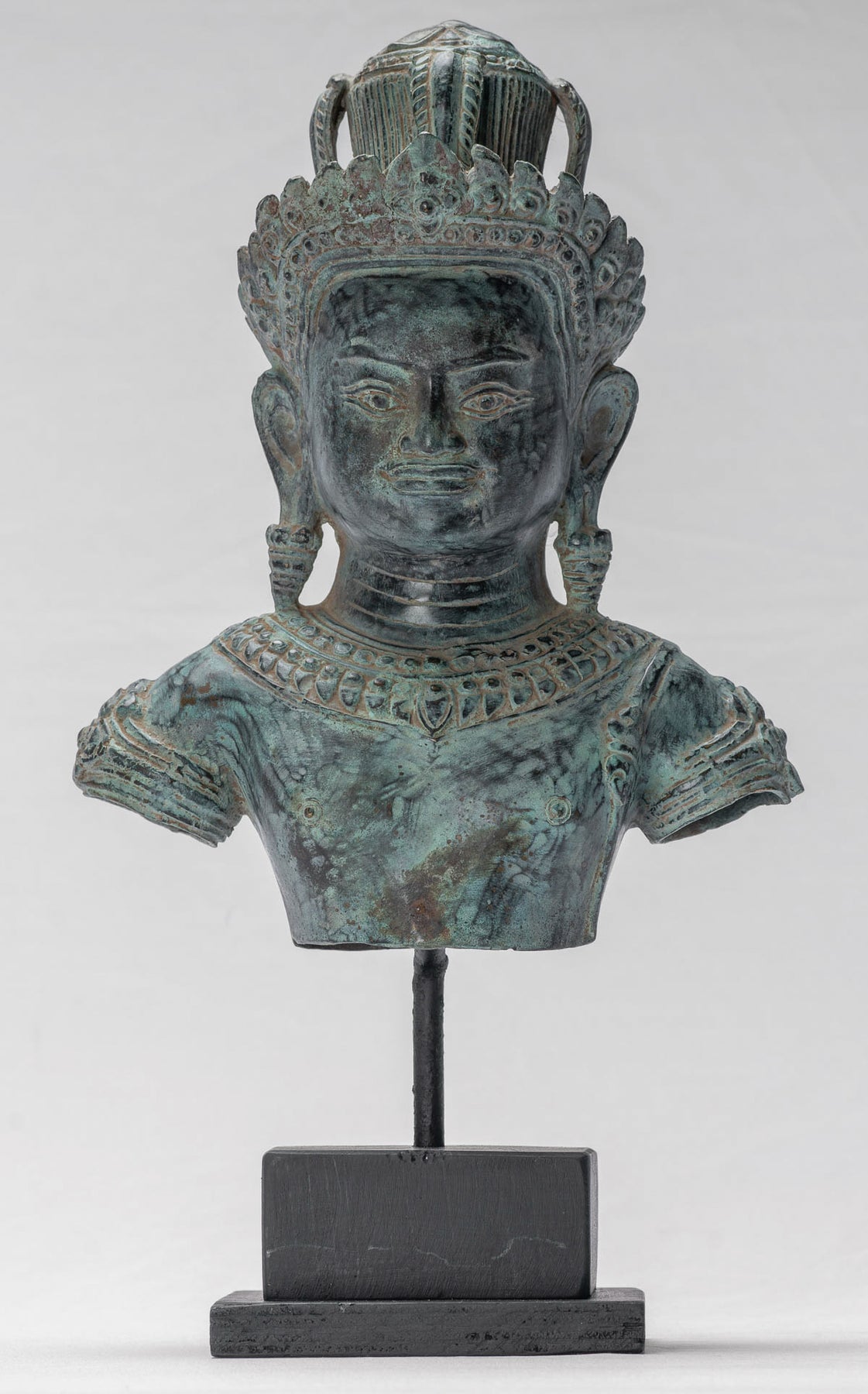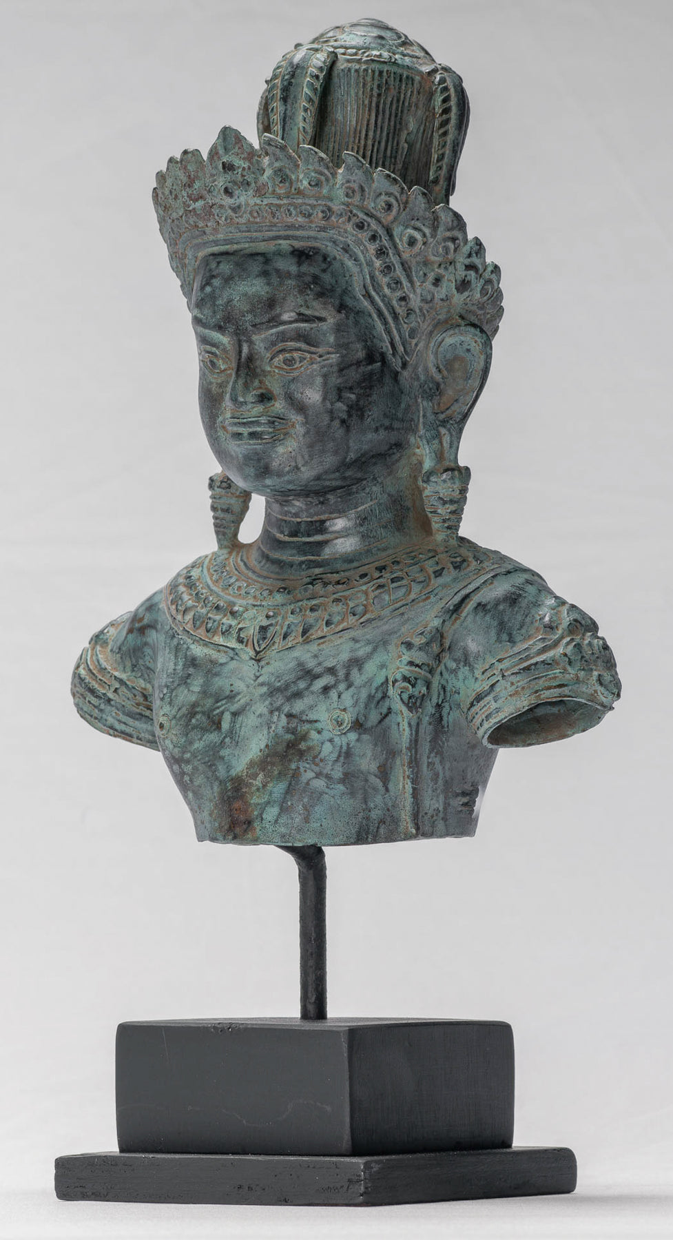 Dezente Spuren von Ornamenten weisen auf den kunstvollen Schmuck und die königlichen Verzierungen hin, die für Angkor Wat-Skulpturen typisch sind, während die glatte Oberfläche und reiche, gealterte Patinaoffenbaren Jahrhunderte voller Ehrfurcht und Geschichte. Jede Kurve und Ebene veranschaulicht das Khmer-Ideal der Harmonie zwischen göttlicher Perfektion und menschlicher Form.