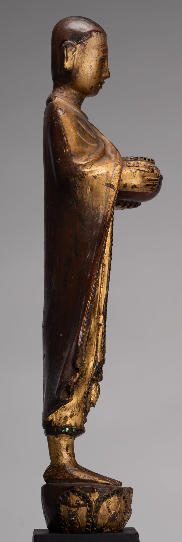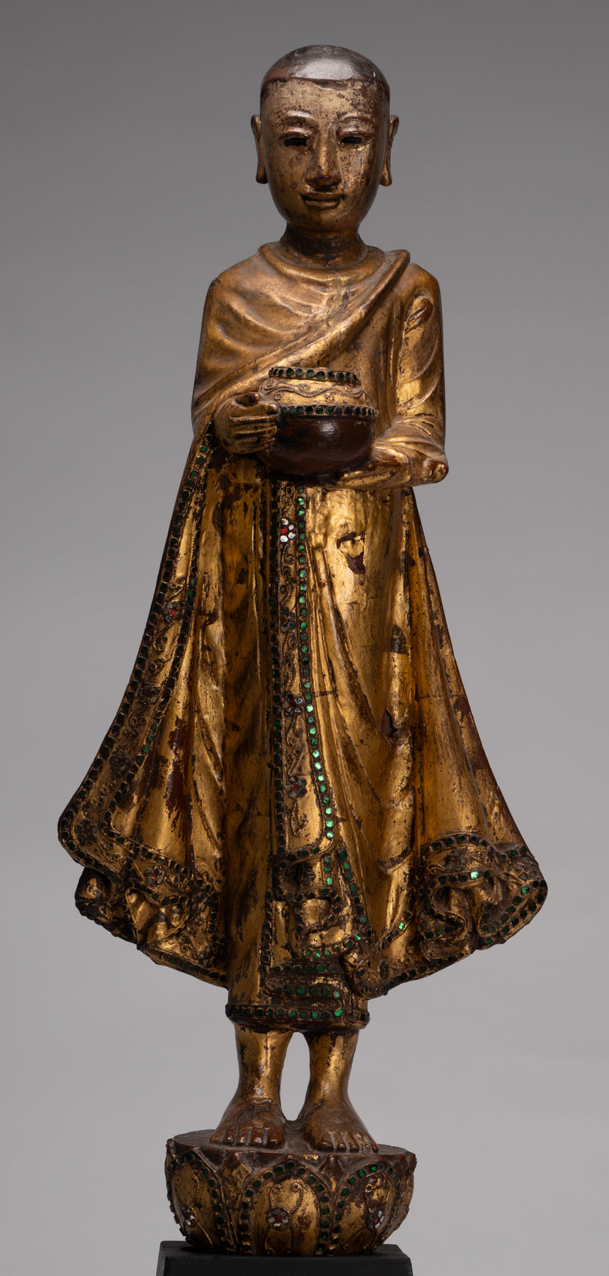 Eine solche unverwechselbare und verehrte Form der buddhistischen Kunst ist die Buddhist -Mönch -Statue im Mandalay -Stil, die hier abgebildet ist und eine Almosenschale hält.