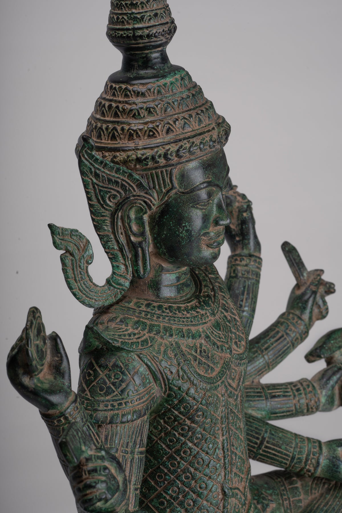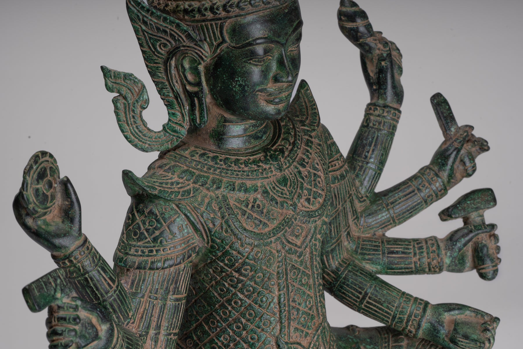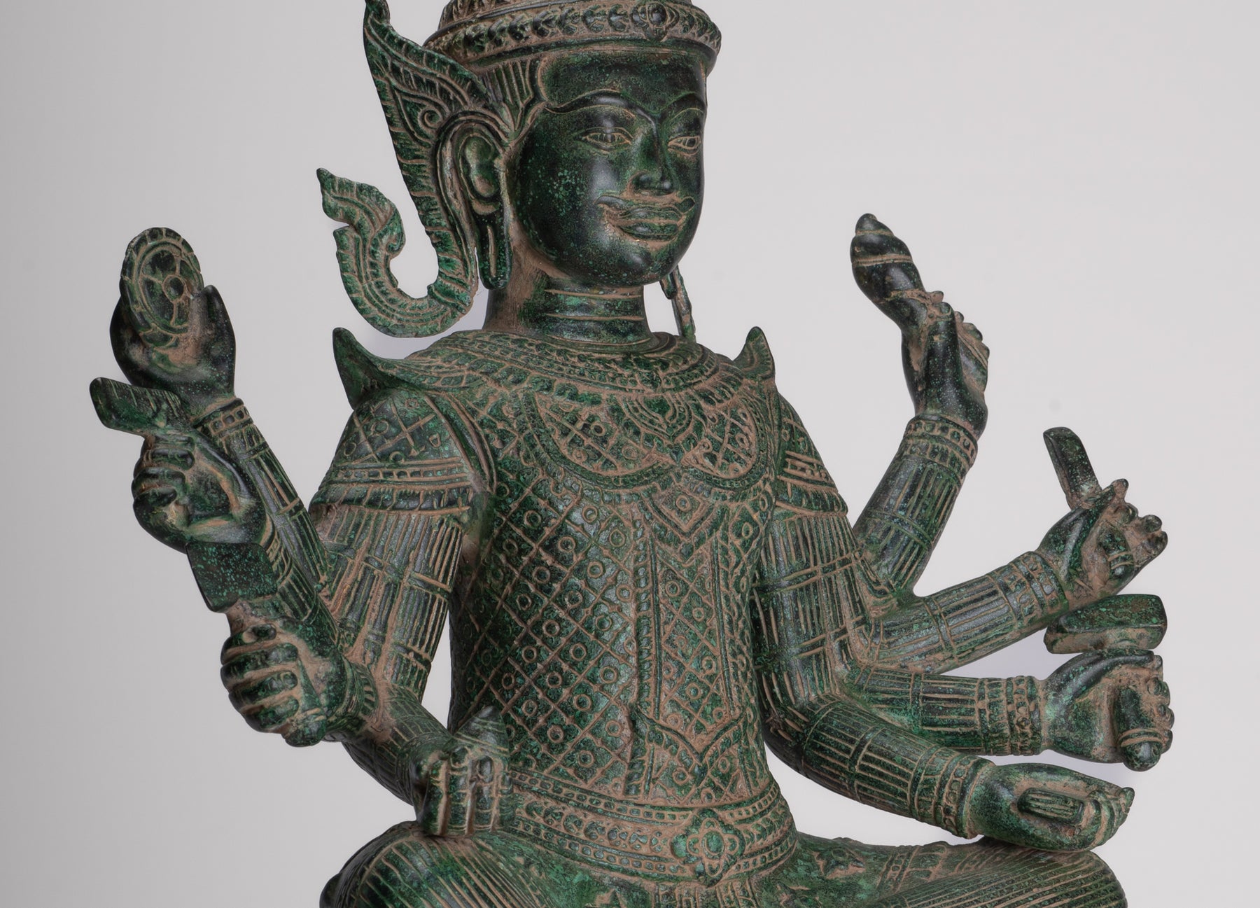 Antiker stehender Angkor Wat aus Bronze im Khmer-Stil, Stil des 12. Jahrhunderts, Angkor Vishnu-Skulptur, von HD Asian Art. Vishnu ist sowohl der Weltbeschützer als auch der Bewahrer, der Wiederhersteller der moralischen Ordnung – er ist von Natur aus allmächtig und alles durchdringend.