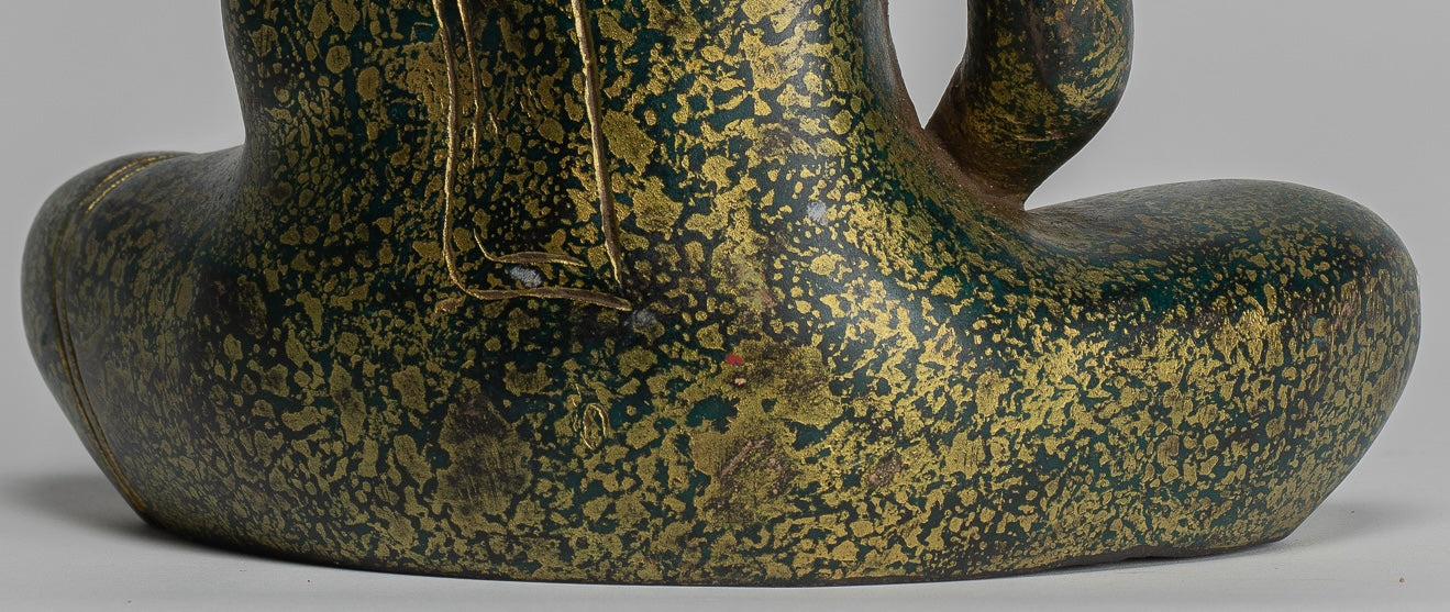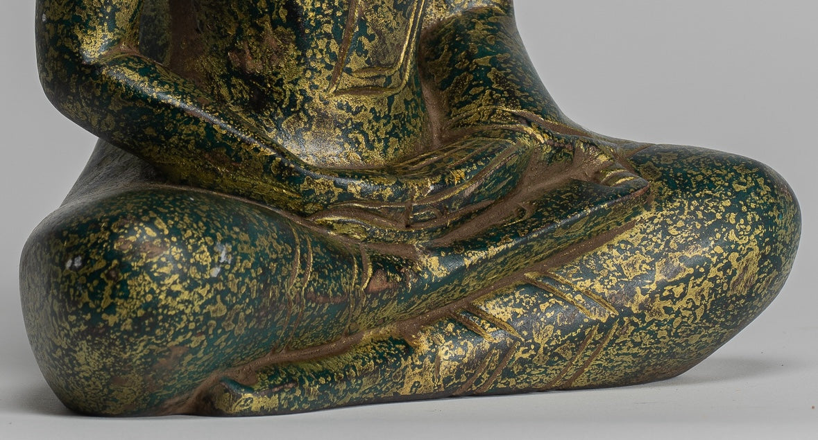 Wie traditionell wird der Meditationsbuddha hier in einer sitzenden Haltung dargestellt, wobei beide Beine in der Halb-Lotus-Position gekreuzt werden. Die Hände befinden sich in der Dhyana Mudra, wo die rechte Hand auf der linken Hand ruht, wobei die Daumen sanft berührt und ein subtiles Dreieck oder Kreis bilden. Der Rücken des Buddhas ist gerade und der Blick wird gesenkt, was eine tiefe Konzentration und innere Reflexion bedeutet.