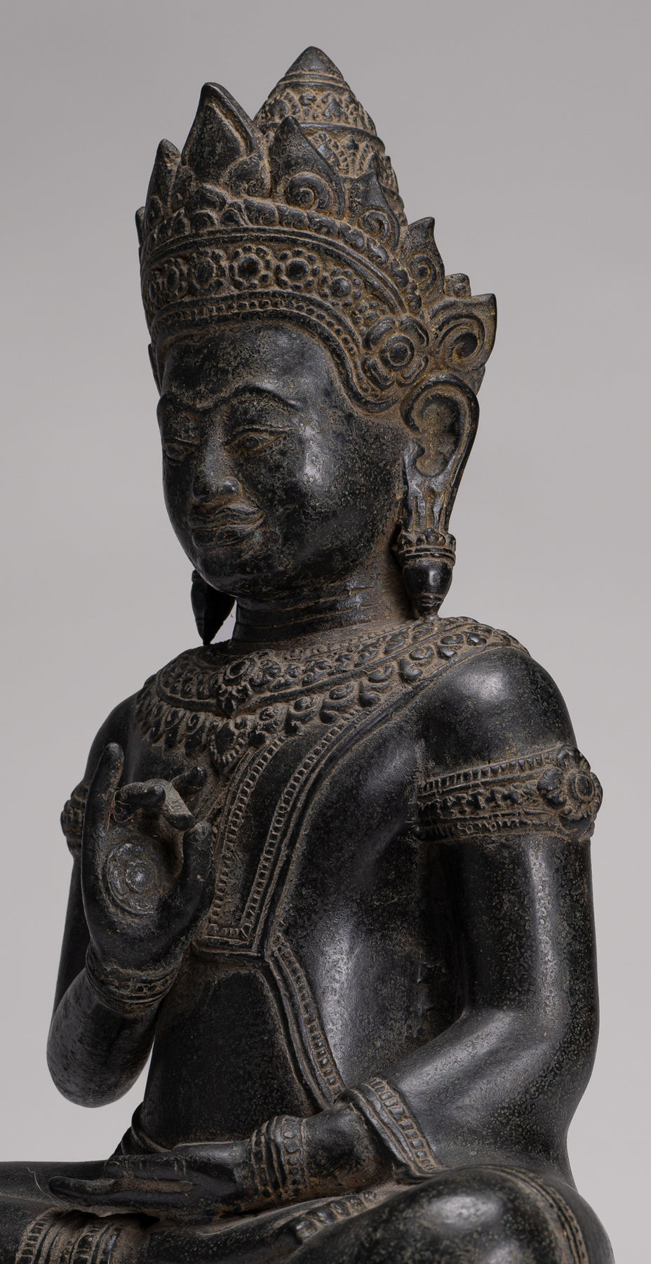 Der Buddha hat verlängerte Ohrläppchen und trägt schwere Hornohrringe. Das Körperprofil besteht aus breiten Schultern und schlanken Taillen. Er hat ein friedliches Gesicht mit niedergeschlagenen introspektiven Augen und einer festen Stirn. Seine Ohrläppchen sind lange von einem Jugendlichen gedehnt, der als Prinz verbracht wurde und schwere goldene Ohrringe trägt. Der Buddha sitzt auf einem lotusblatt dekorierten Sockel.