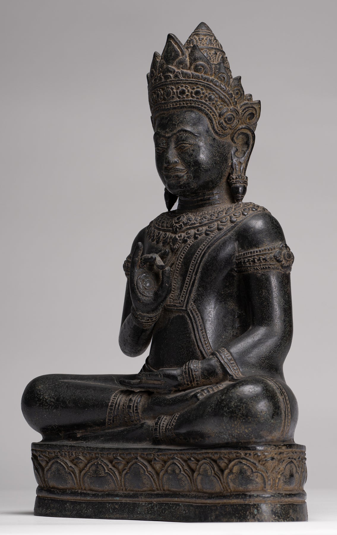 Der Lehrbuddha mit seiner ikonischen Geste, das Rad von Dharma zu drehen, verkaps die Essenz der buddhistischen Philosophie und Praxis. Es repräsentiert die tiefgreifende Verwirklichung der Natur des Leidens und seiner mitfühlenden Mission, andere zur Befreiung zu führen.