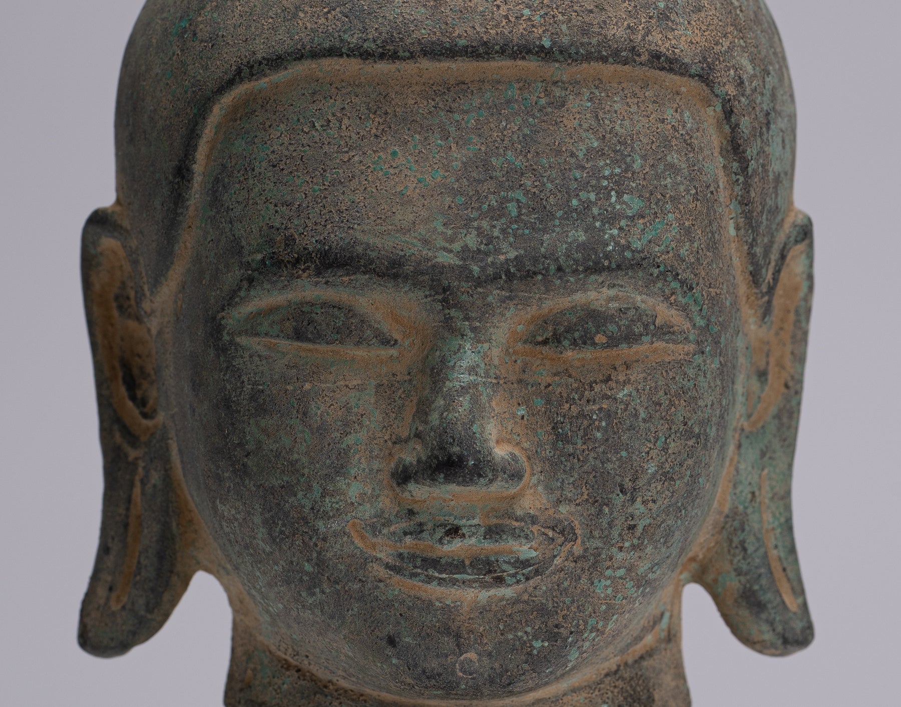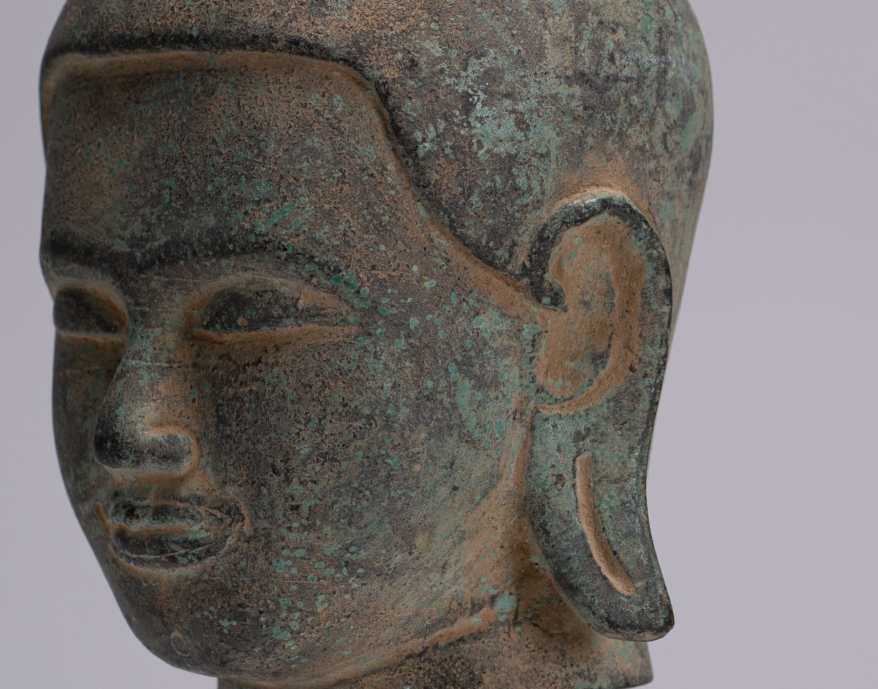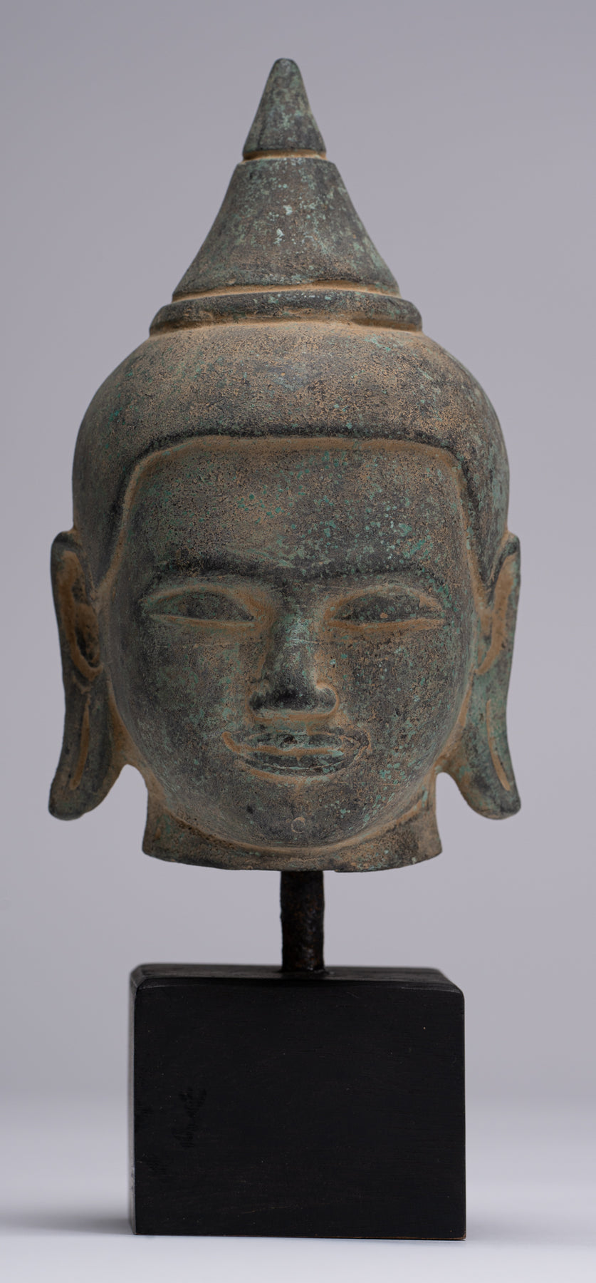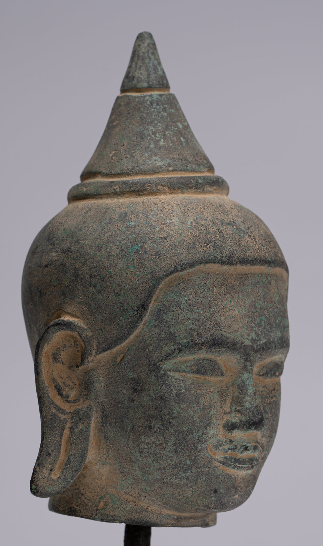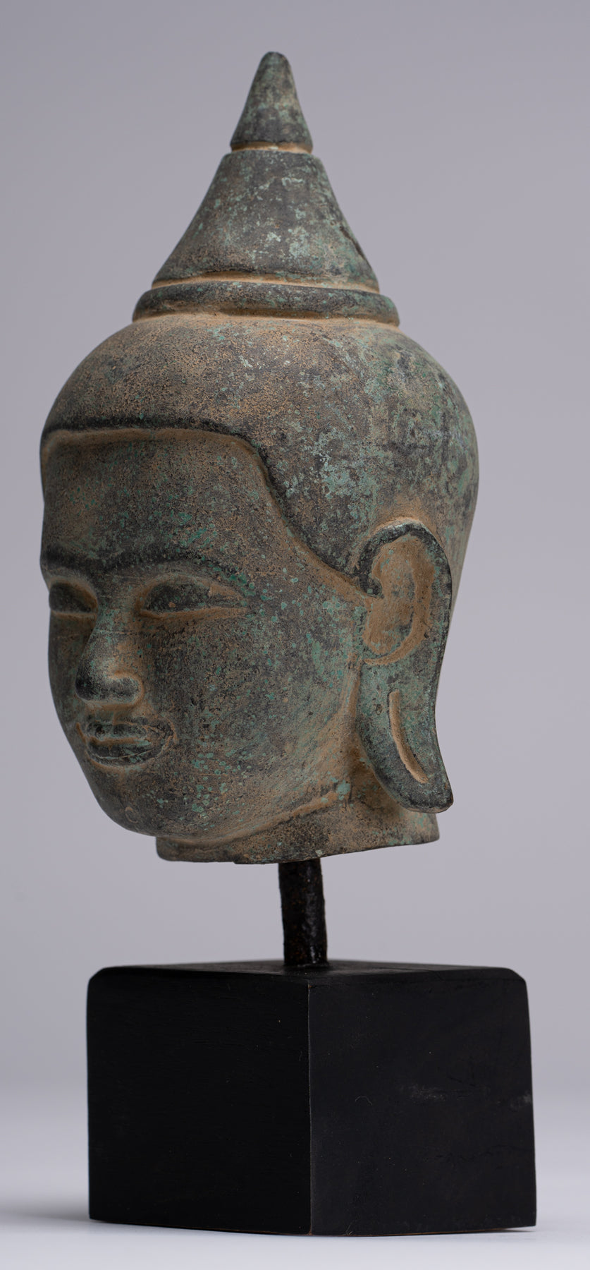 Buddha Statue - Antique Khmer Style Mounted Bronze Phnom Da Buddha Head Statue - 22cm/9"