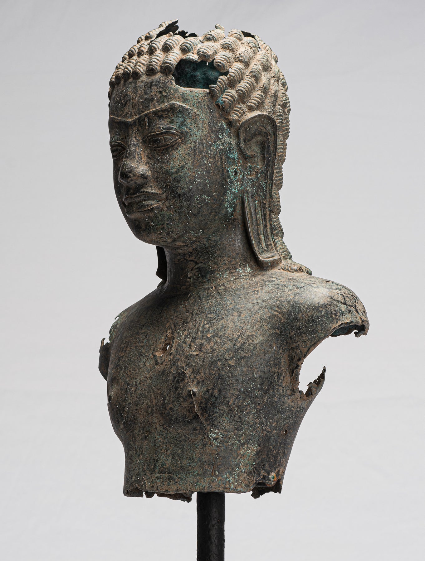 Buddha Statue - Antique Khmer Style Mounted Bronze Phnom Da Buddha Head Statue - 54cm/22")