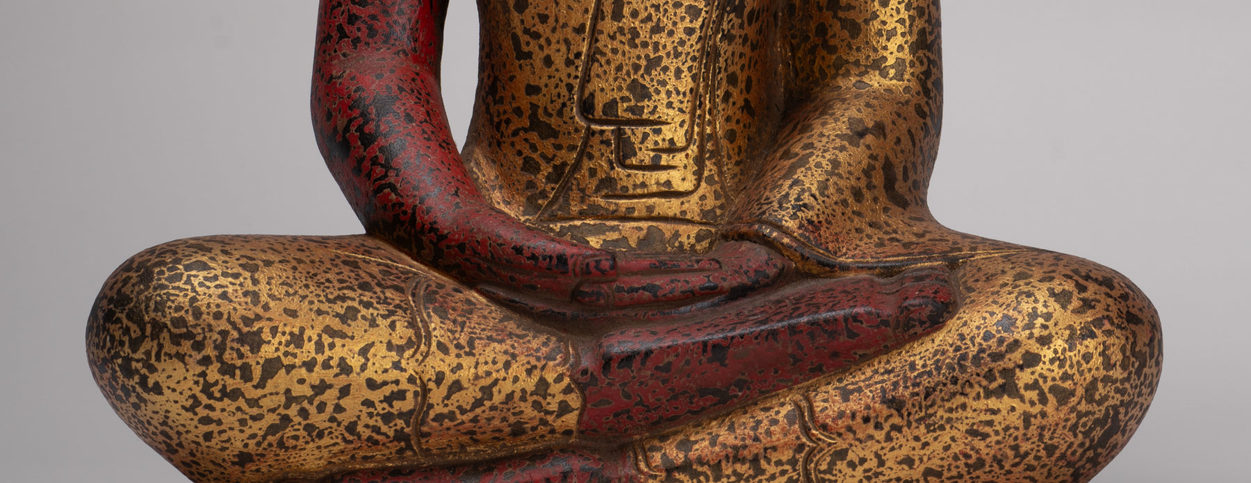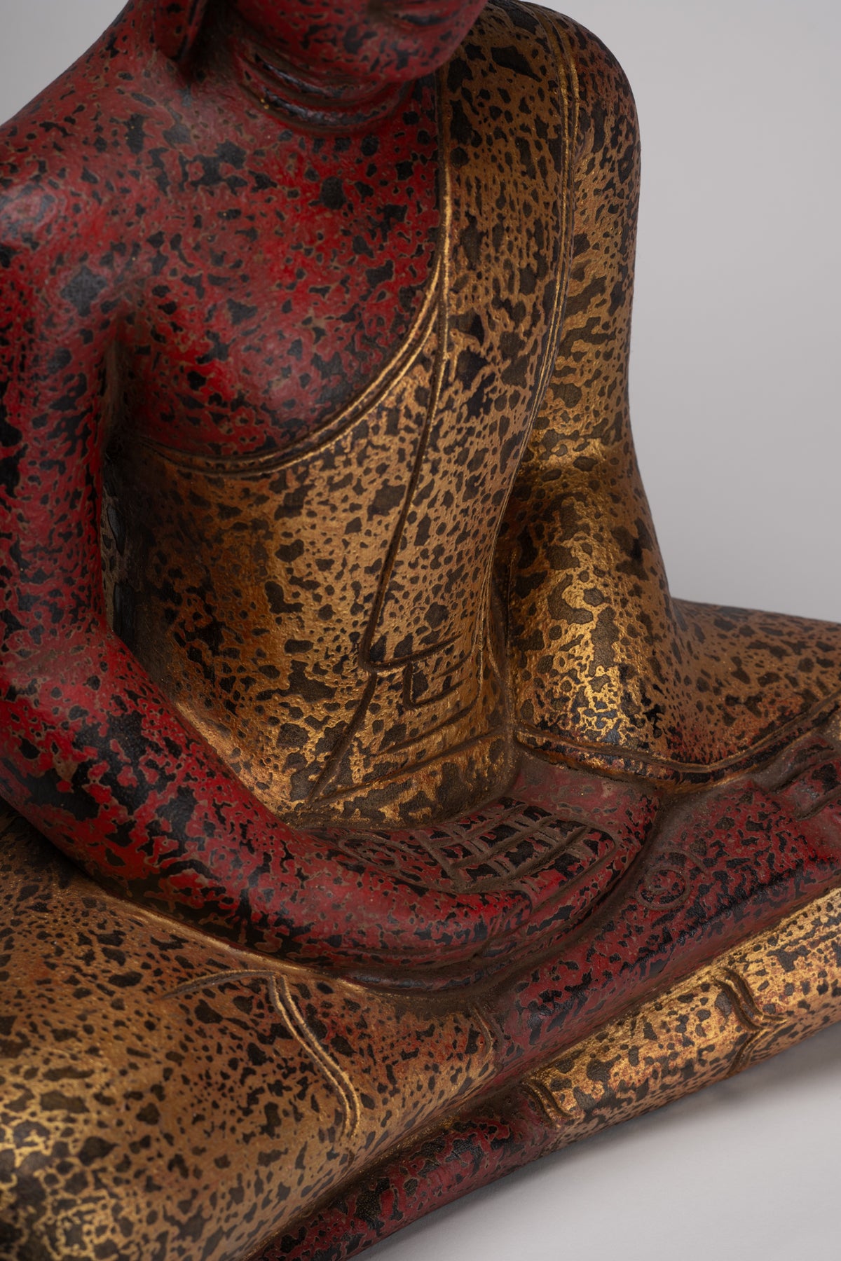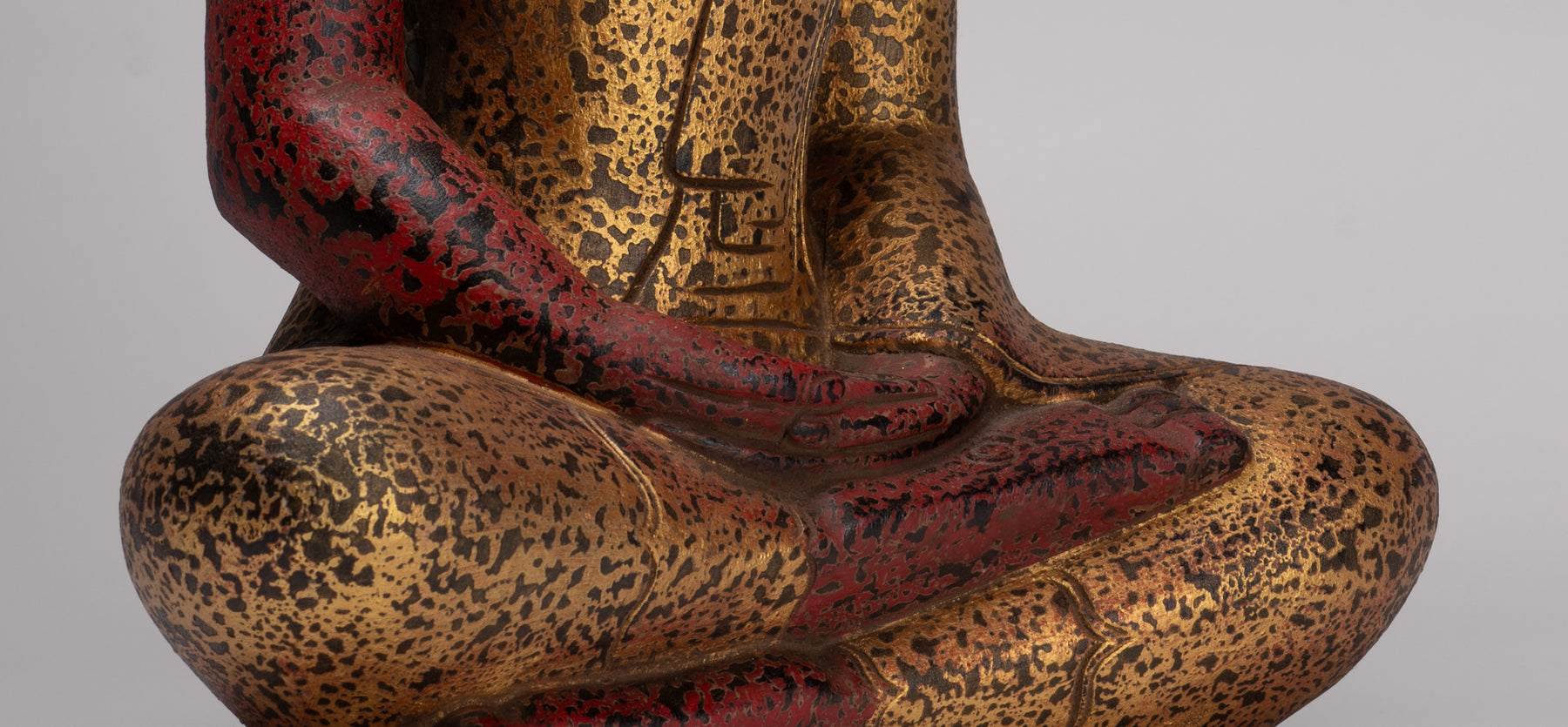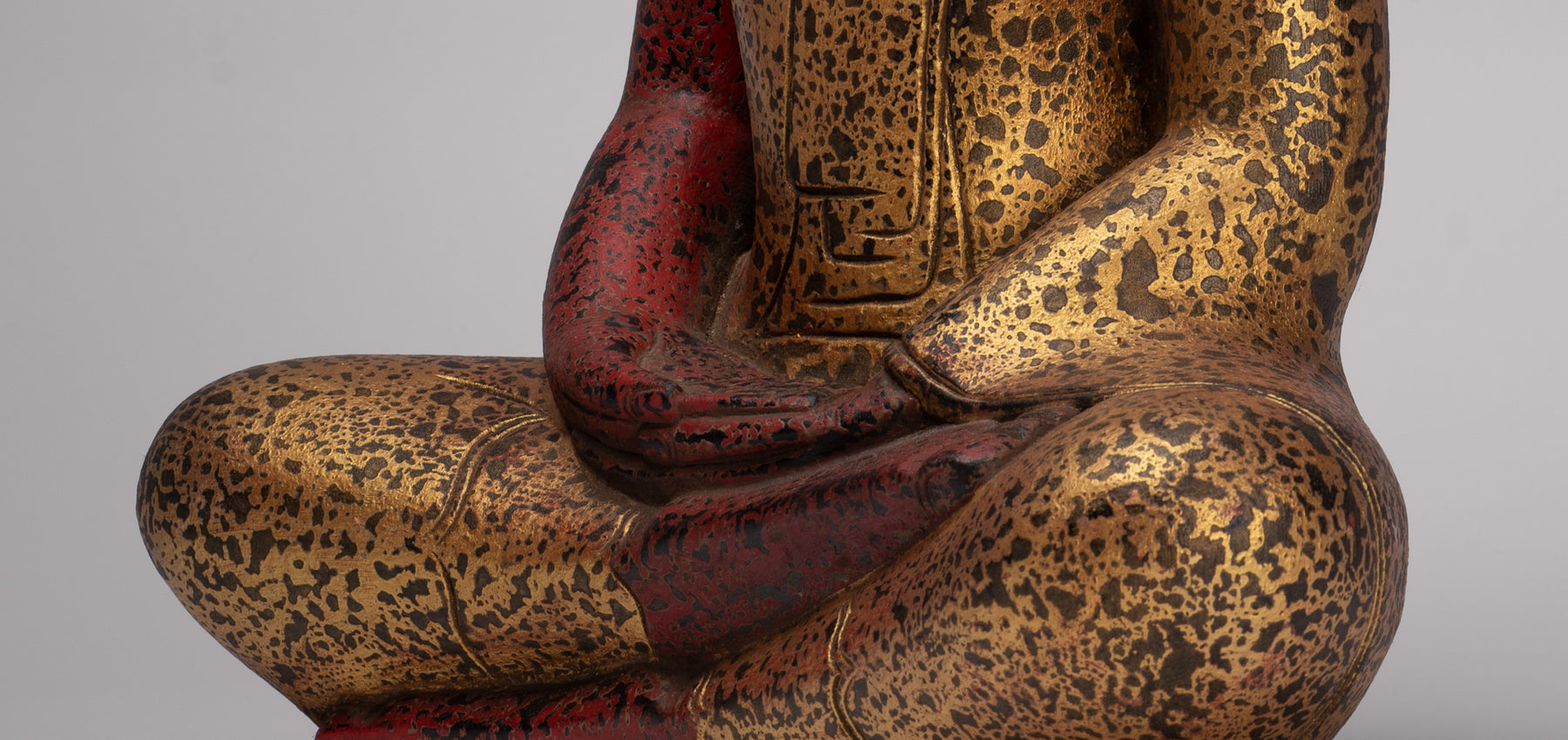 Wie traditionell wird der Meditationsbuddha hier in einer sitzenden Haltung dargestellt, wobei beide Beine in der Halb-Lotus-Position gekreuzt werden. Die Hände befinden sich in der Dhyana Mudra, wo die rechte Hand auf der linken Hand ruht, wobei die Daumen sanft berührt und ein subtiles Dreieck oder Kreis bilden. Der Rücken des Buddhas ist gerade und der Blick wird gesenkt, was eine tiefe Konzentration und innere Reflexion bedeutet.