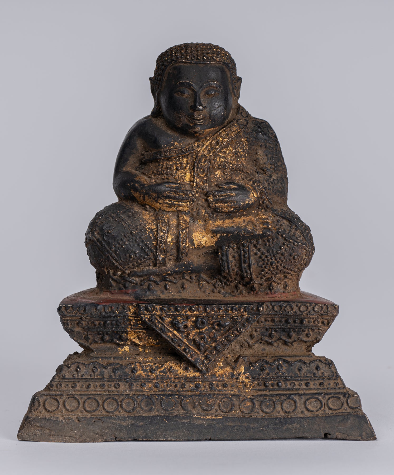 Dieser entzückende Buddha sitzt auf einem dekorierten Thronstil im Rattanakosin -StilIn der adamantinischen Haltung von Vajraparyankasana das rechte Bein über der linken Seite.