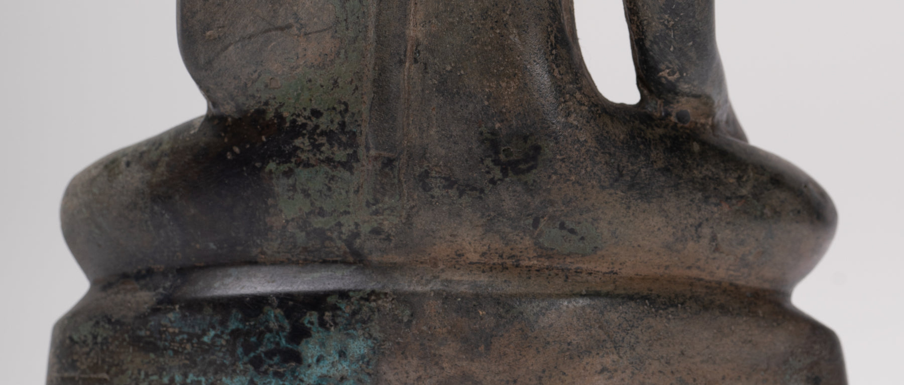 Wie bei u Thong -Periode Buddha -Bilder typisch ist, zeigt dieser Buddha die charakteristischen stilistischen Merkmale, die den Tanga -Buddha von früheren und späteren Perioden unterscheiden. Hier sitzt der Buddha in der Erde-Touching-Geste (Bhumisparsa Mudra) mit einem ruhigen Ausdruck und einem sanften Lächeln. Das längliche Gesicht des Buddhas, anmutig gewölbte Augenbrauen und niedergeschlagene Augen vermitteln ein Gefühl der inneren Ruhe und der spirituellen Tiefe.
