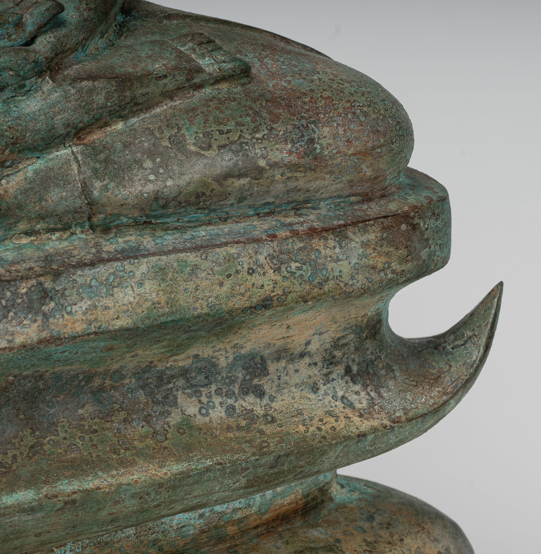 Gesichtsstruktur: Das Gesicht des Buddhas ist mit einem sanften, ruhigen Lächeln verlängert. Die Augenbrauen sind anmutig gewölbt, und die Nase ist fein proportioniert und trägt zum allgemeinen Sinn für Ruhe und Gnade bei.